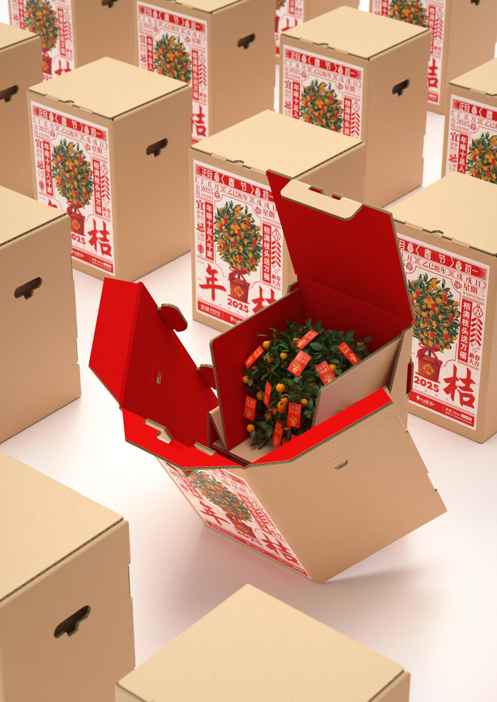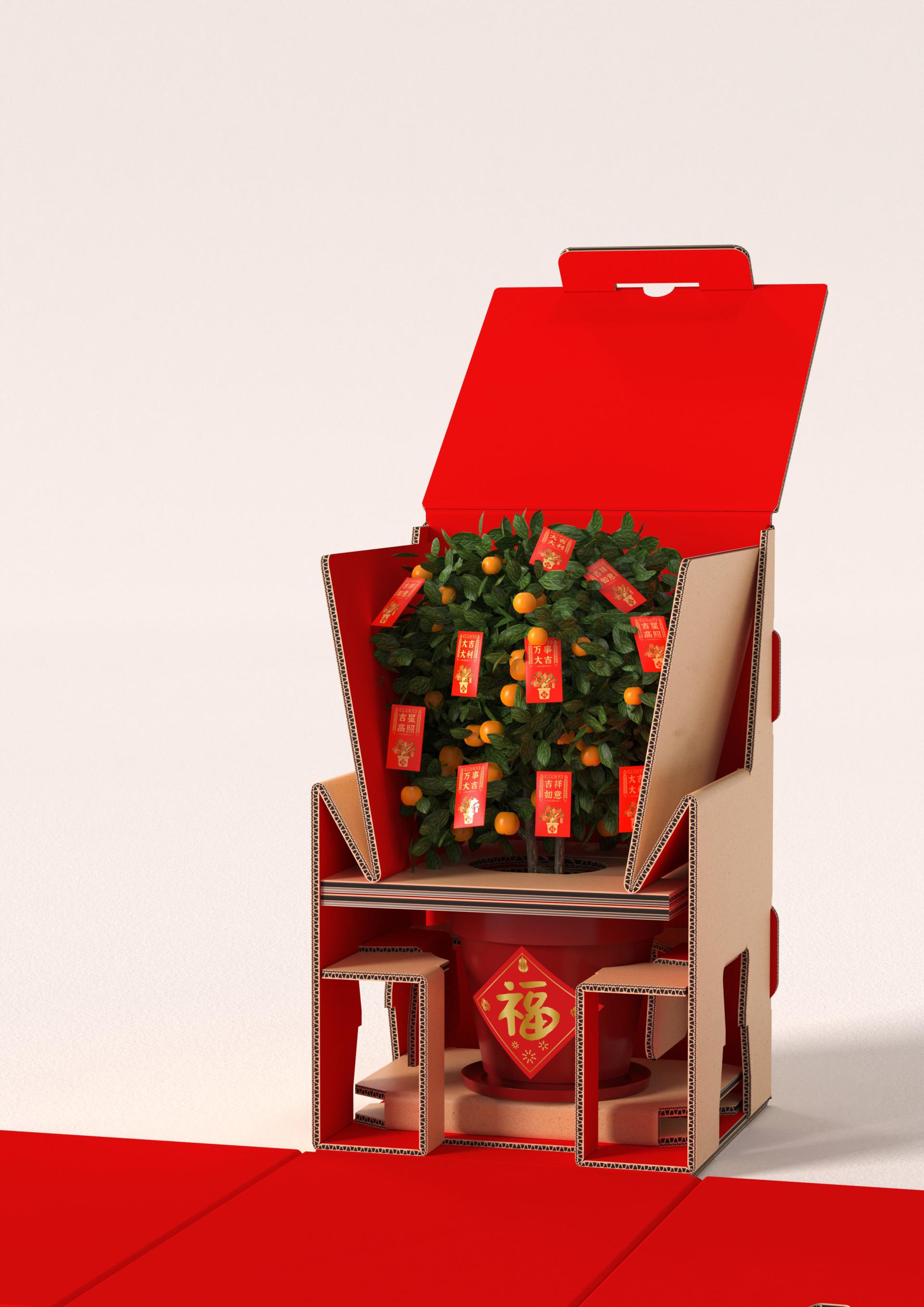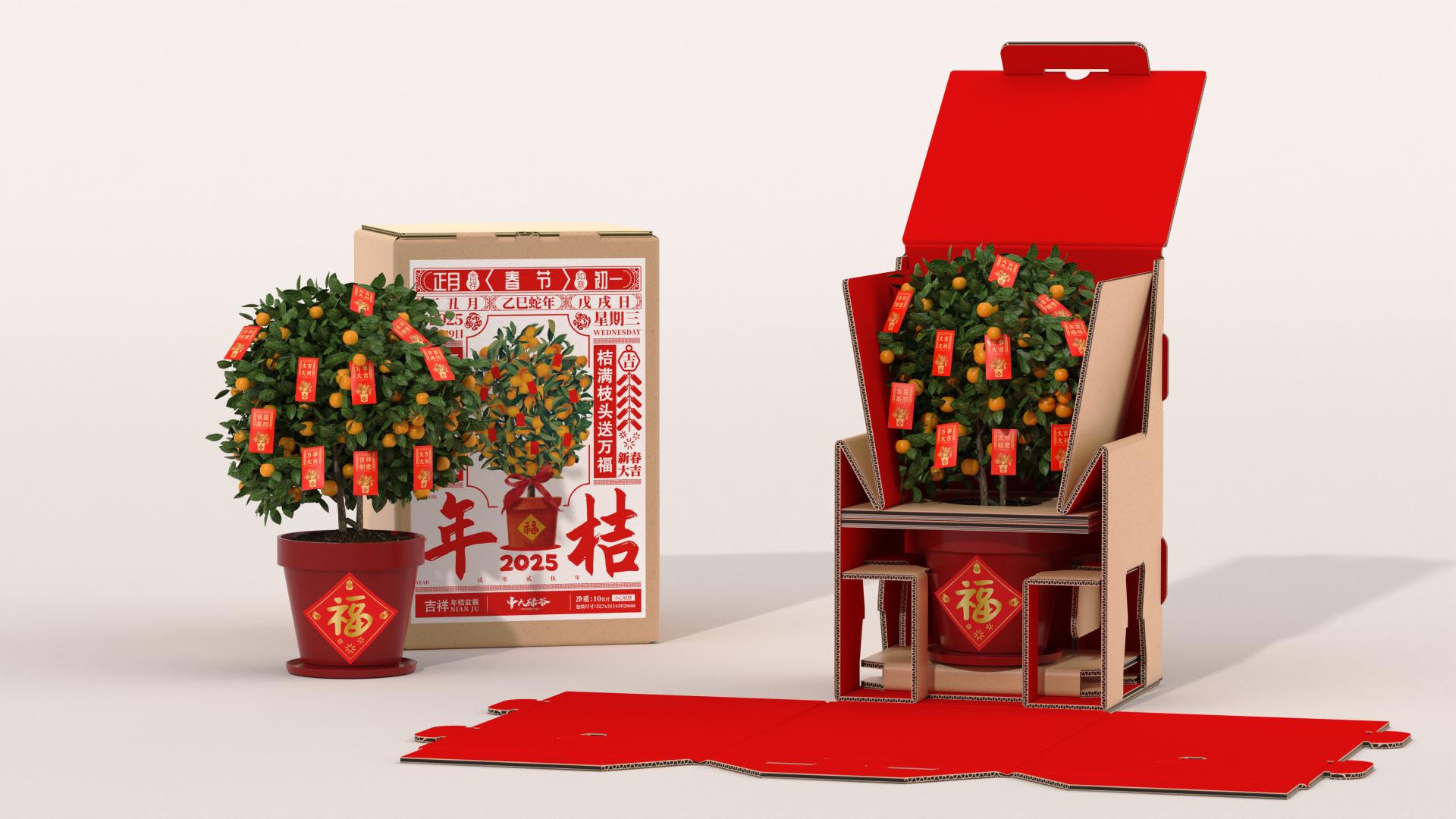 Nianju, a symbolic ornamental plant during Chinese Lunar New Year, embodies the cultural ethos of "auspiciousness" (吉/Ji) through its Cantonese homophone "桔". Traditionally transported without packaging, the rise of e-commerce necessitates innovative packaging solutions that balance cultural symbolism with functional requirements.