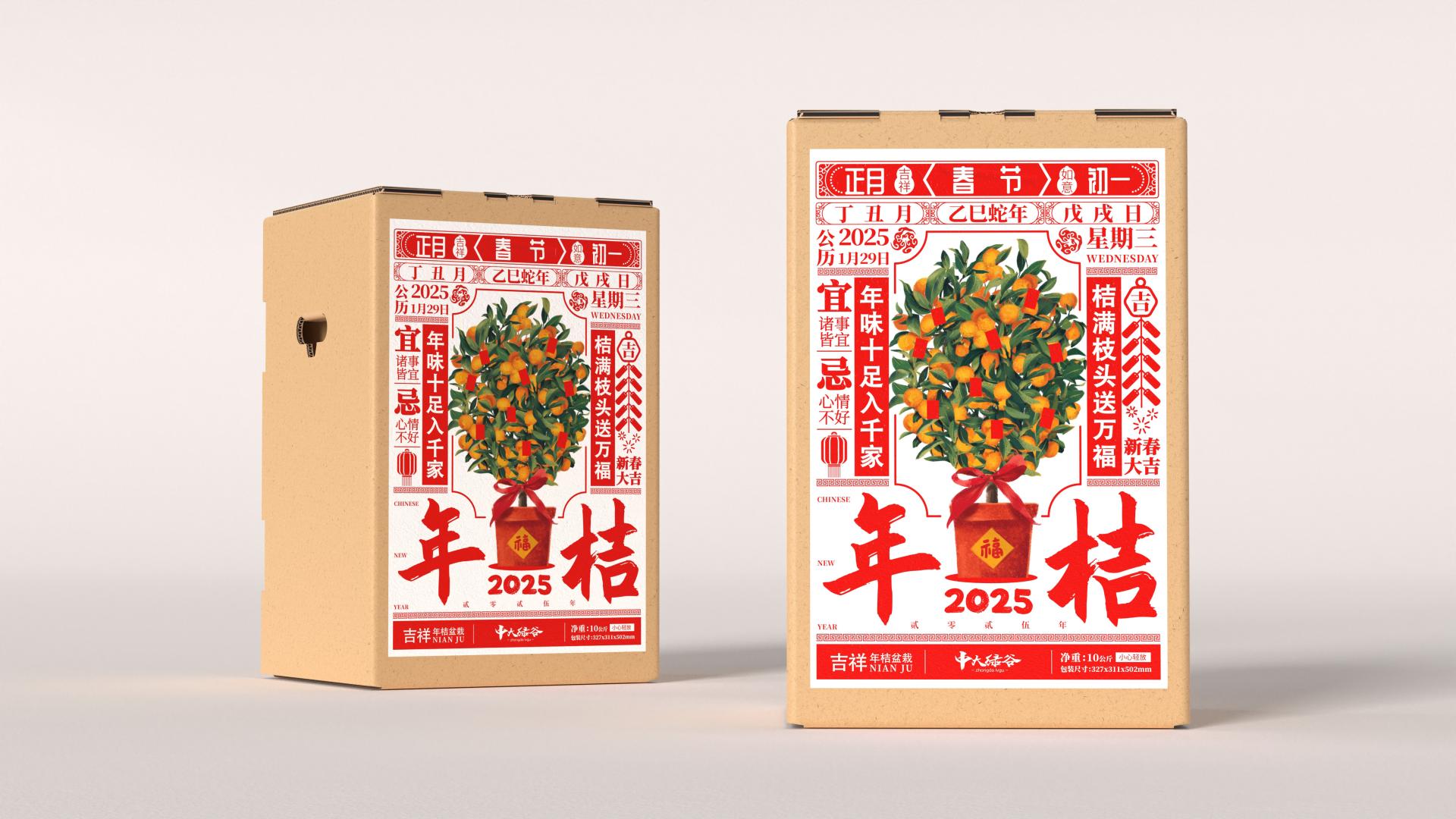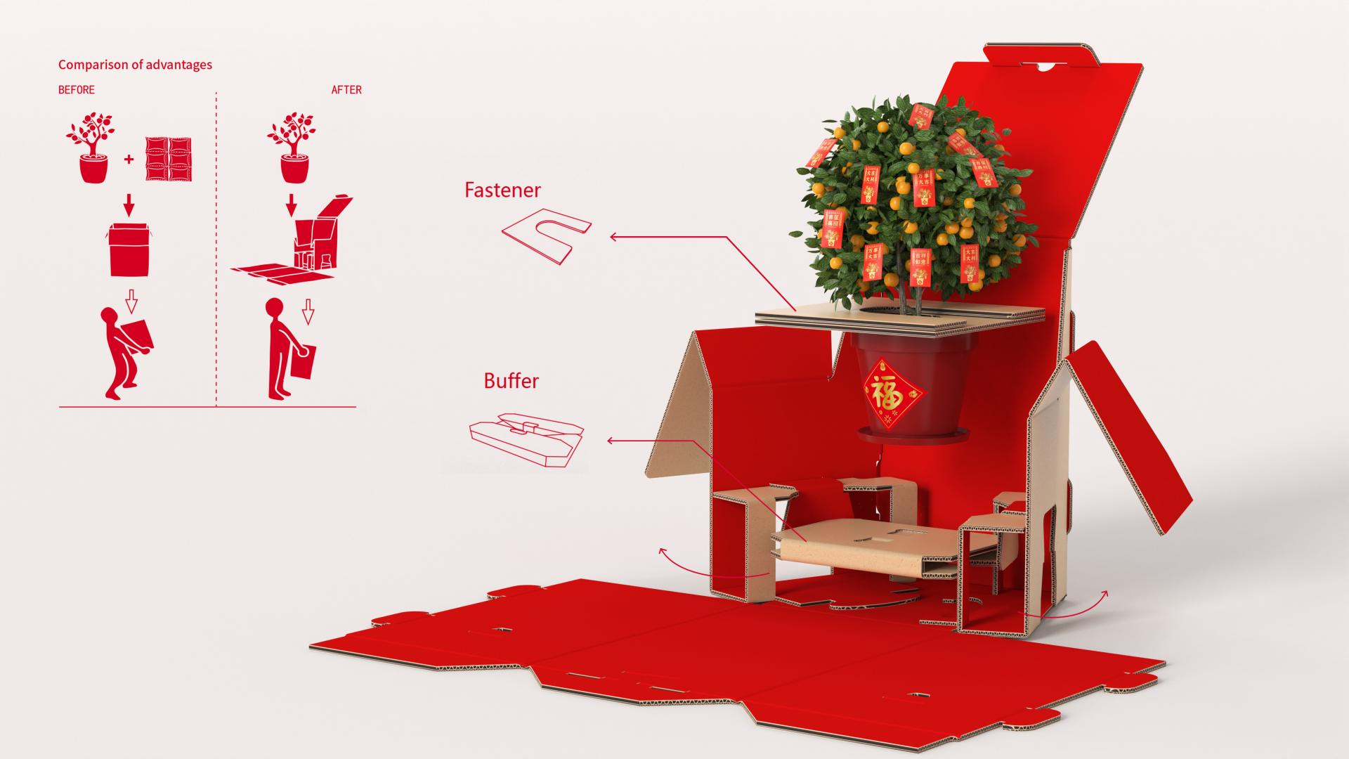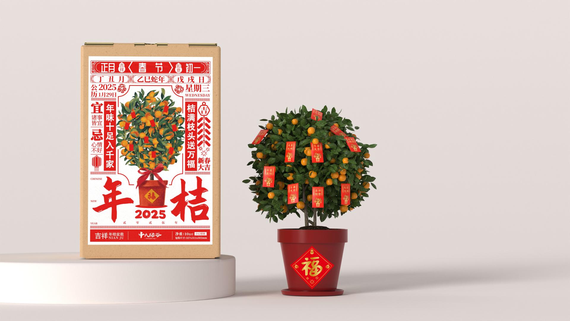 Nianju, a symbolic ornamental plant during Chinese Lunar New Year, embodies the cultural ethos of "auspiciousness" (吉/Ji) through its Cantonese homophone "桔". Traditionally transported without packaging, the rise of e-commerce necessitates innovative packaging solutions that balance cultural symbolism with functional requirements.