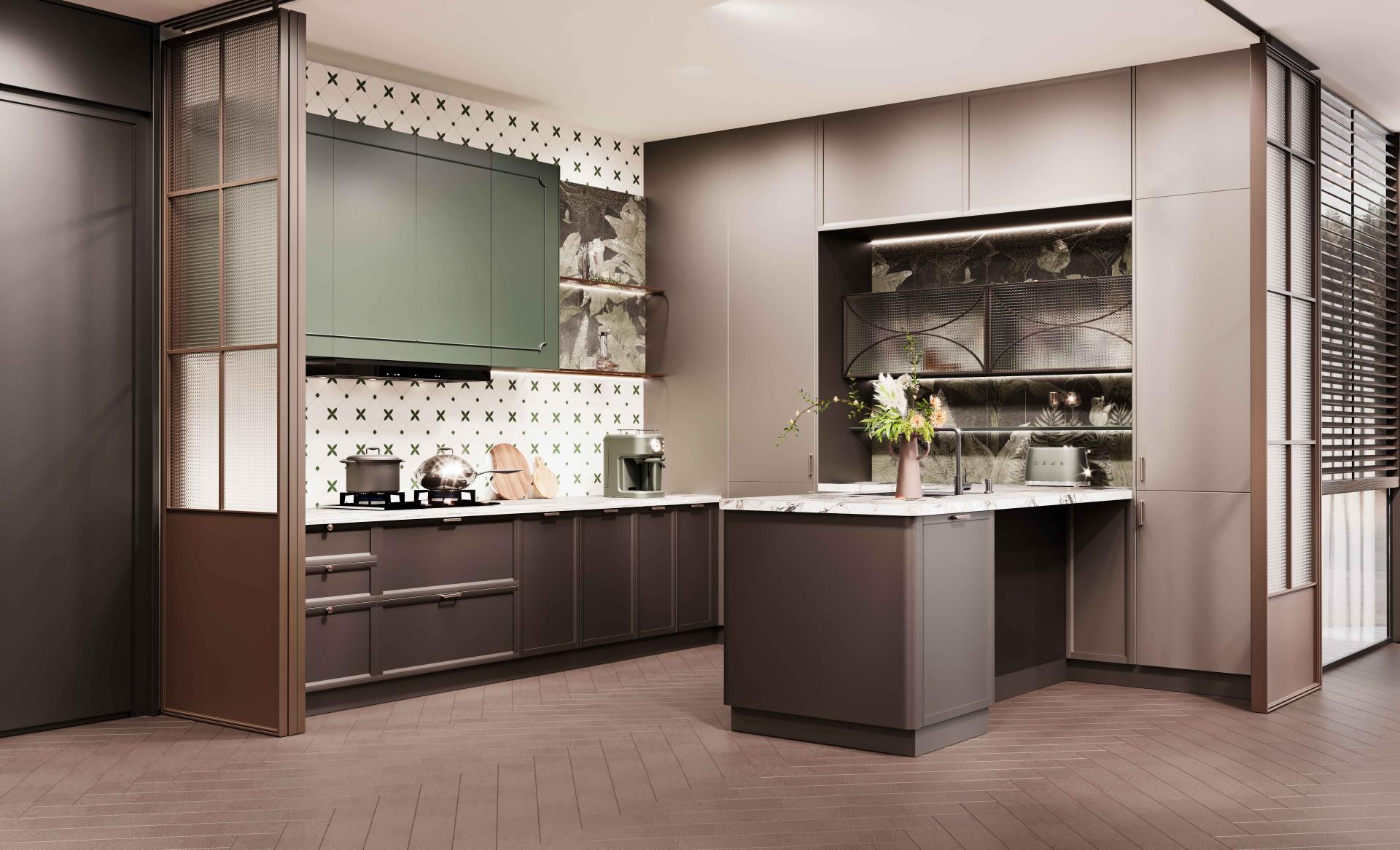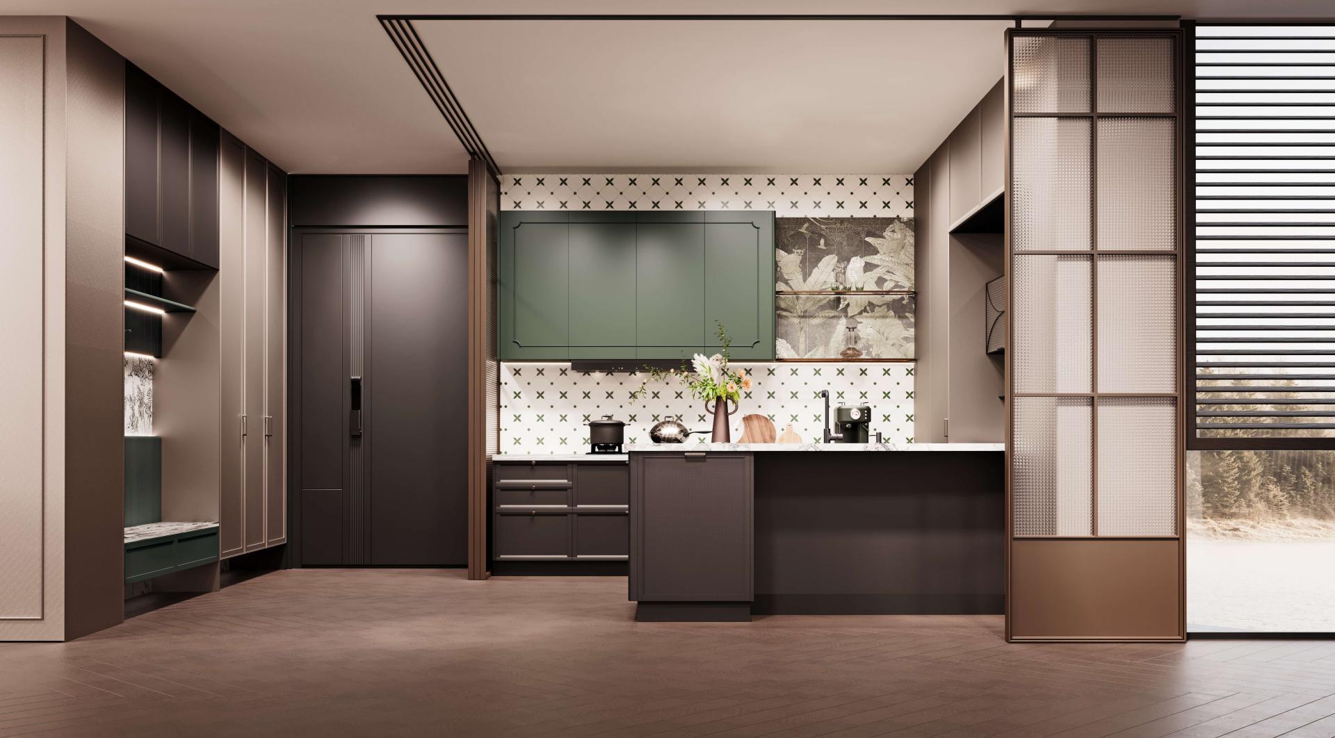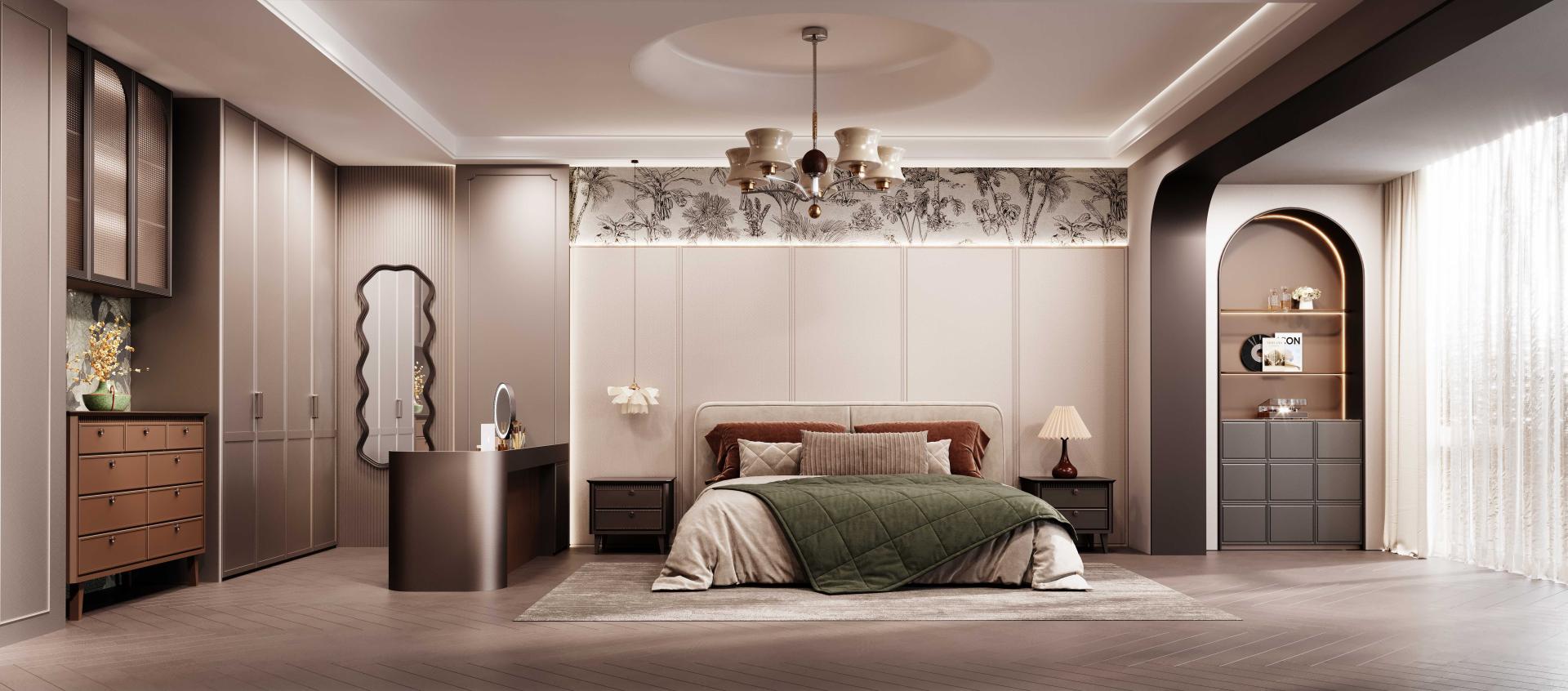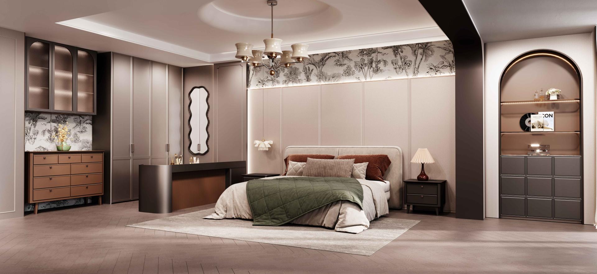 The project also excels in functionality. The LDBK integrated space concept allows for flexible merging of living rooms, studies, and balconies, creating an artistic space capable of diverse transformations. The movable cabinets can adapt to the layouts arranged based on activities and occasions, equipping the space with higher practicality and customizability. Open plan kitchen dining designs eliminate traditional boundaries by integrating storage function, coffee culture, and a wine bar to facilitate positive social interactions. Moreover, French-inspired cream-themed walk-in closets in bedrooms feature efficient zoning and storage solutions, which, paired with fresh tropical plant motifs on the background wall, well cater to the habits and preferences of occupants.