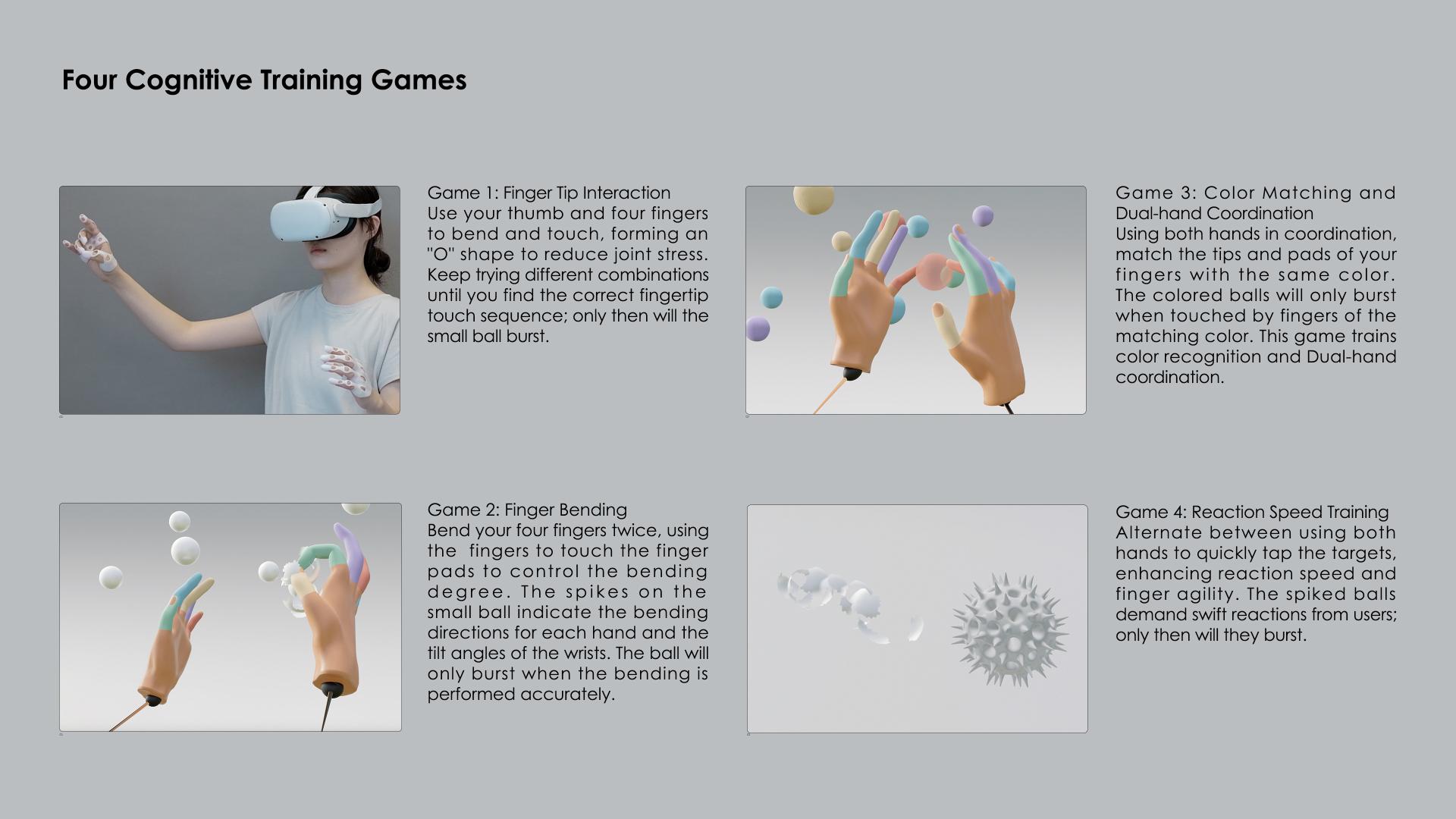 Using advanced dual-feedback technology, this unique product is the world’s first 'hand fine motor skills + VR game' training combo. It comes with a physical glove that is intended to direct and adjust the user's hand placement throughout training, hence promoting cognitive function. Even with their eyes closed, users can quickly locate the proper positions because to the glove's raised finger tips, which allow for exact location identification with an error margin of ≤0.3mm. This gives the user haptic feedback that is easy to understand.The accompanying VR game utilizes cleverly designed colors, space and sounds to guide the training process, effectively reducing the user’s cognitive load and creating a more comfortable, effective, and fully immersive experience.