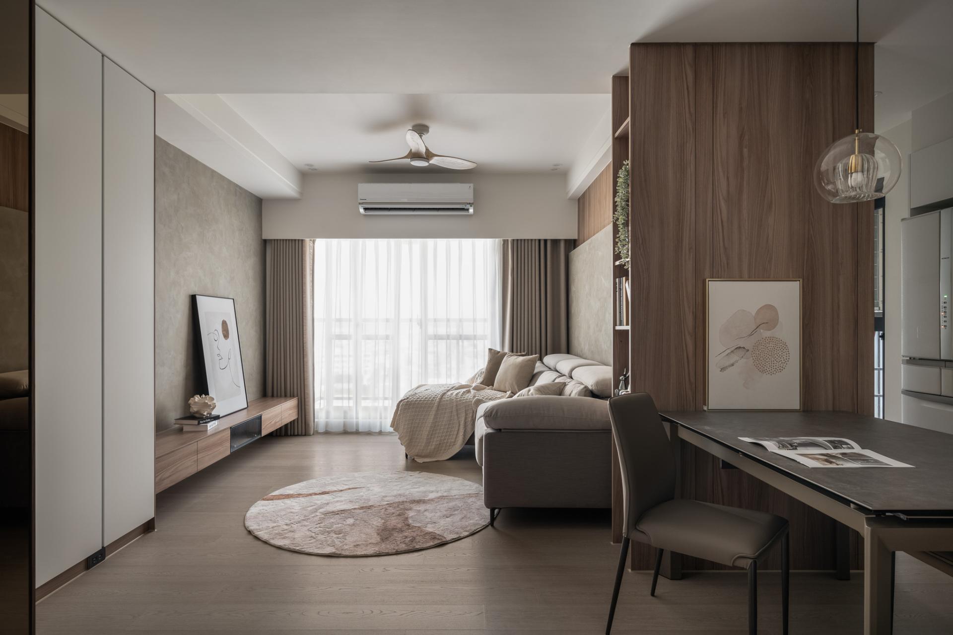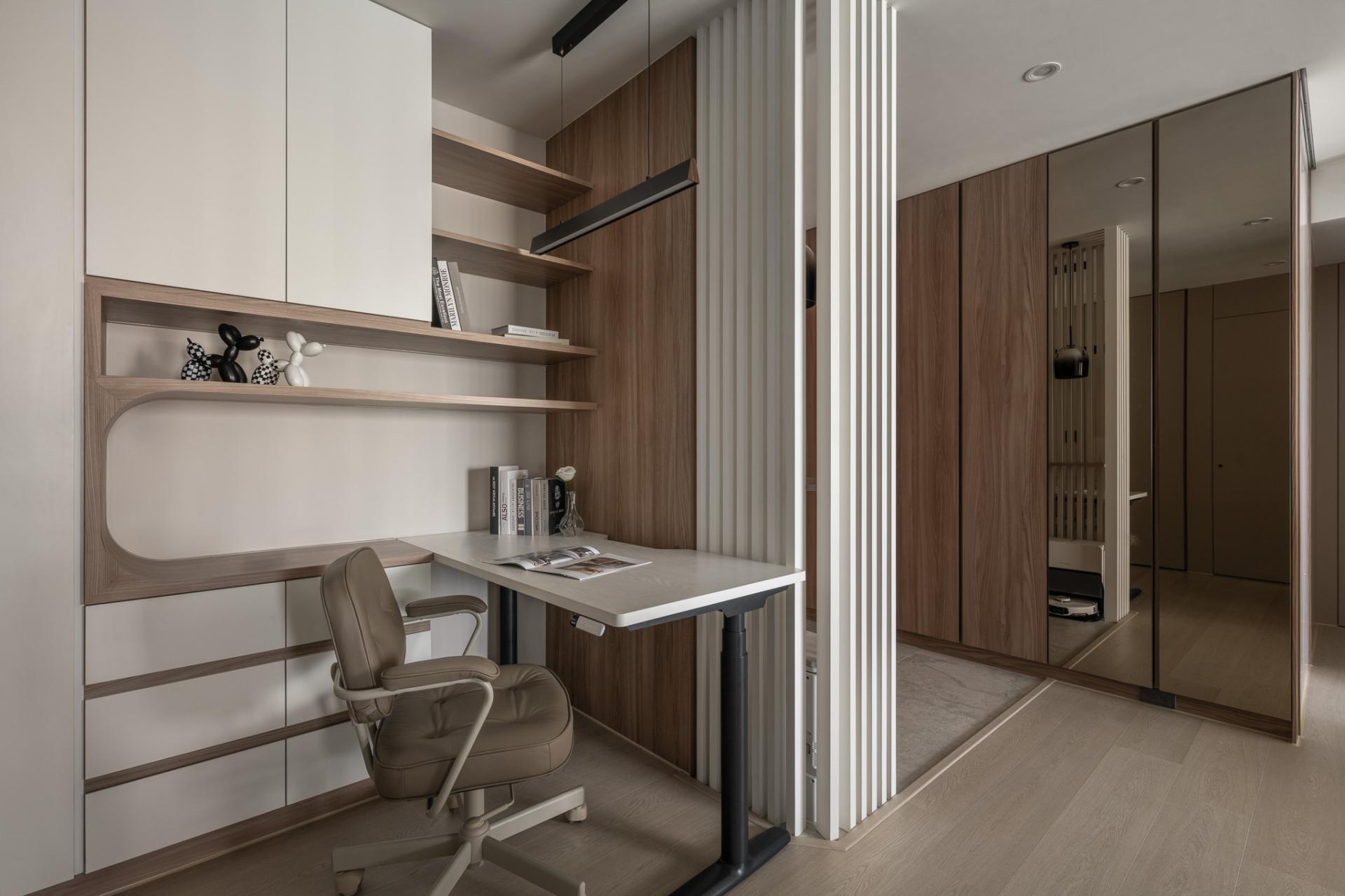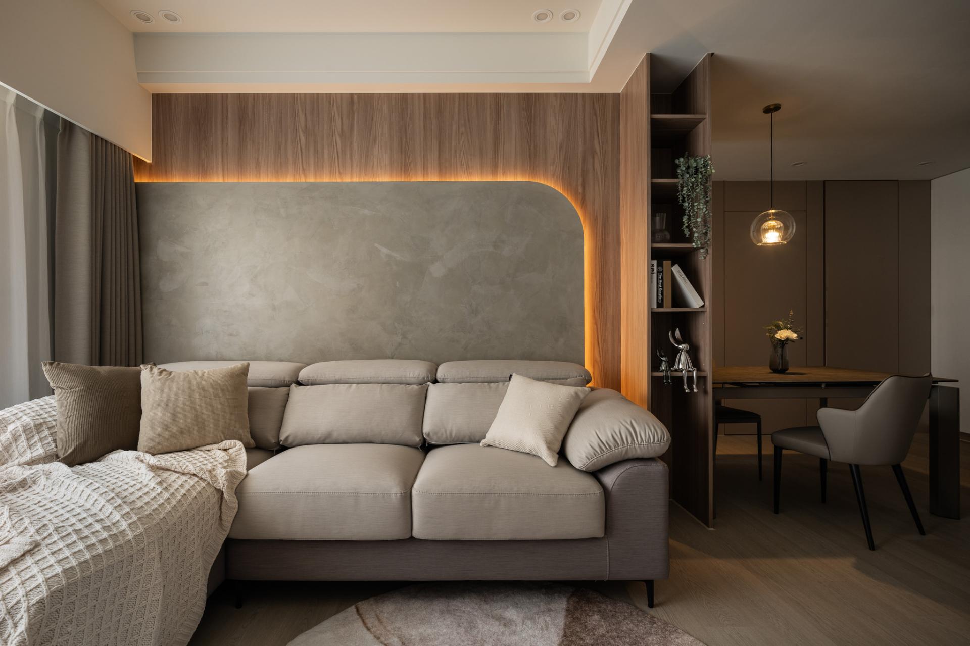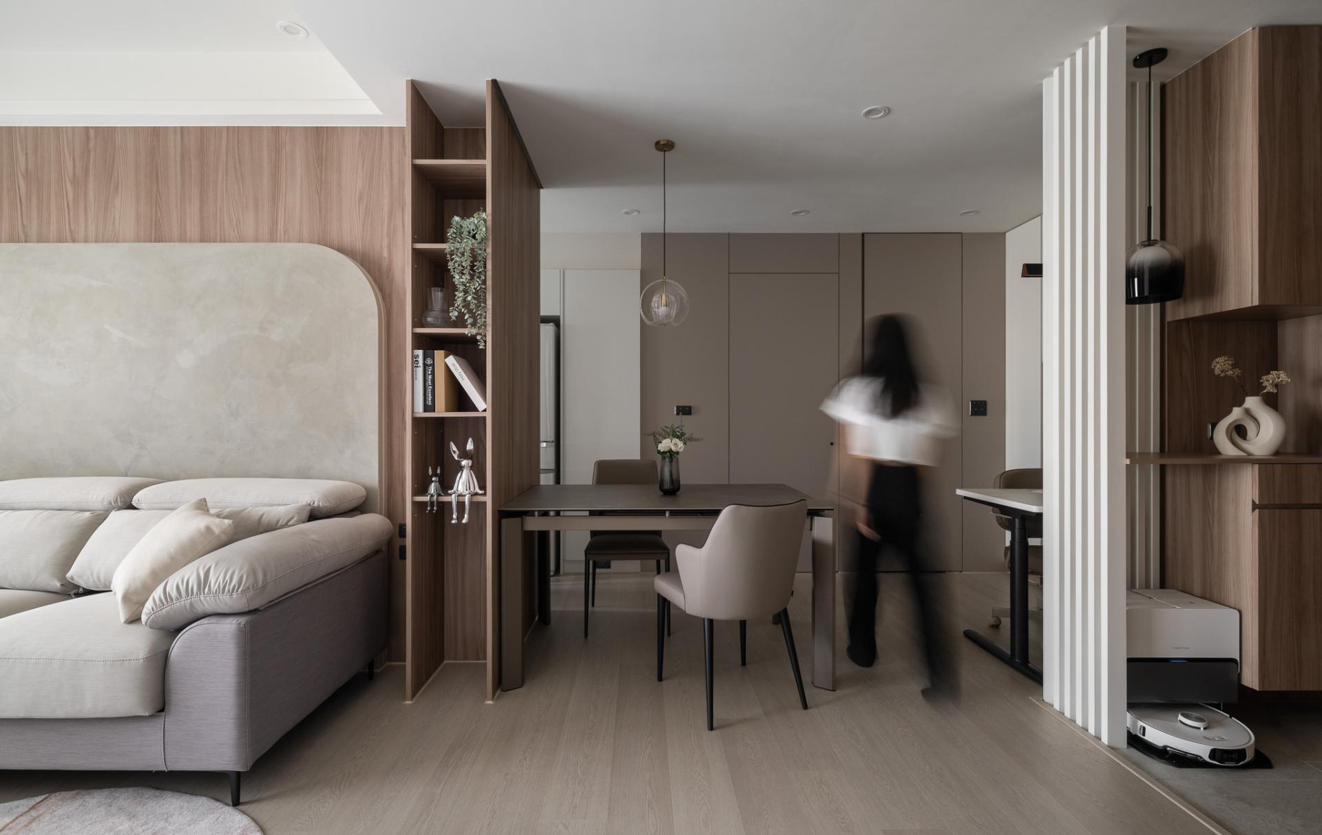 This 12-ping (approximately 39.6 square meters) home belongs to a young couple and their infant child. Through thoughtful design, they aim to create a cozy and inviting space filled with warmth. The overall design features soft color tones, curved elements, and warm lighting, balancing aesthetics and functionality. Rounded corners ensure safety as their child learns to walk, while the open layout seamlessly connects the living and dining areas, enhancing the sense of spaciousness. The extendable dining table symbolizes the continuity of family bonds, and the entryway is equipped with storage cabinets for organization and convenience. The wife’s workspace is subtly separated by a lattice partition, maintaining both independence and connection. A home is more than just a place to live—it is a vessel for happiness, capturing life's precious moments and allowing love and memories to flow naturally.