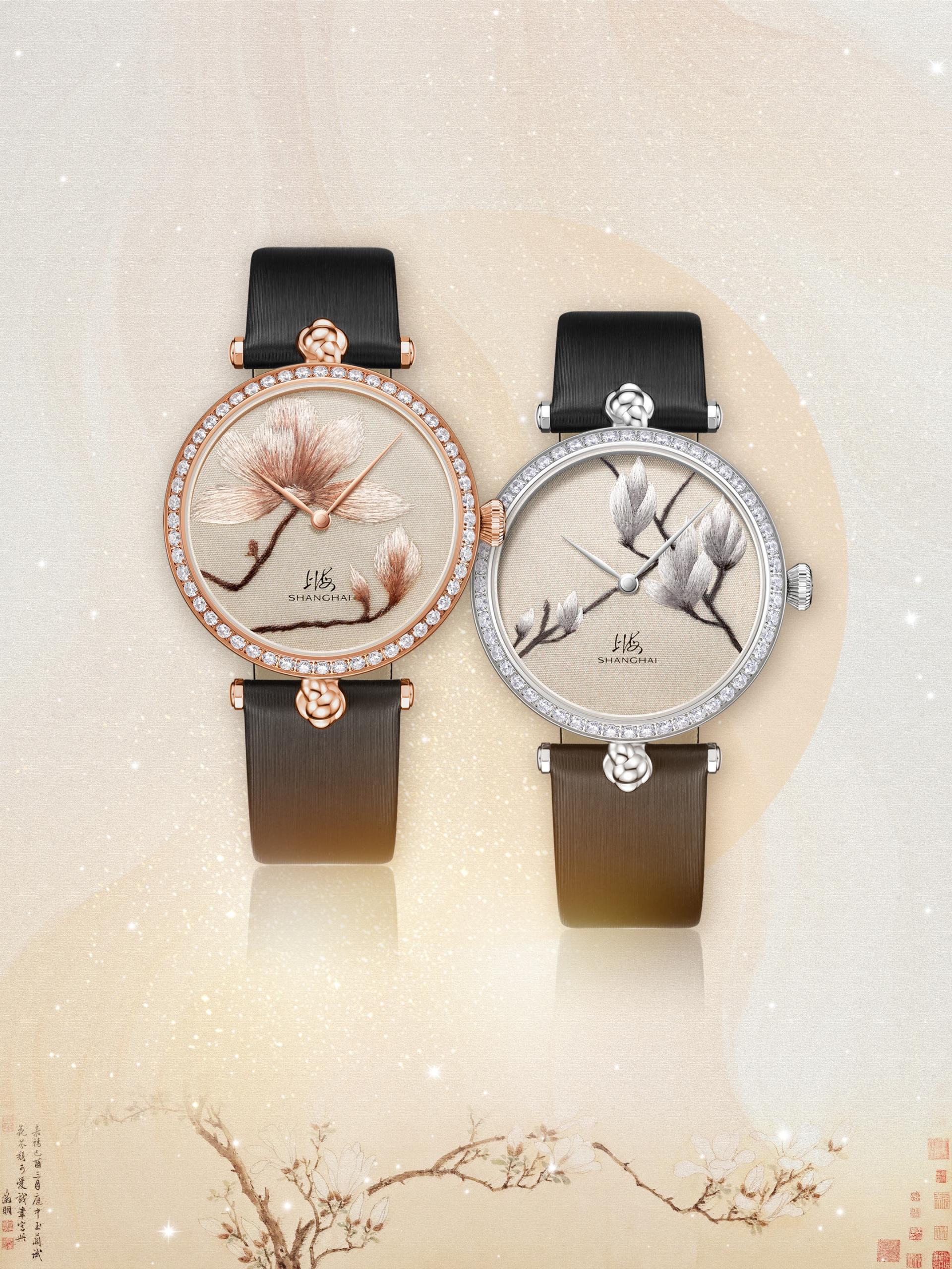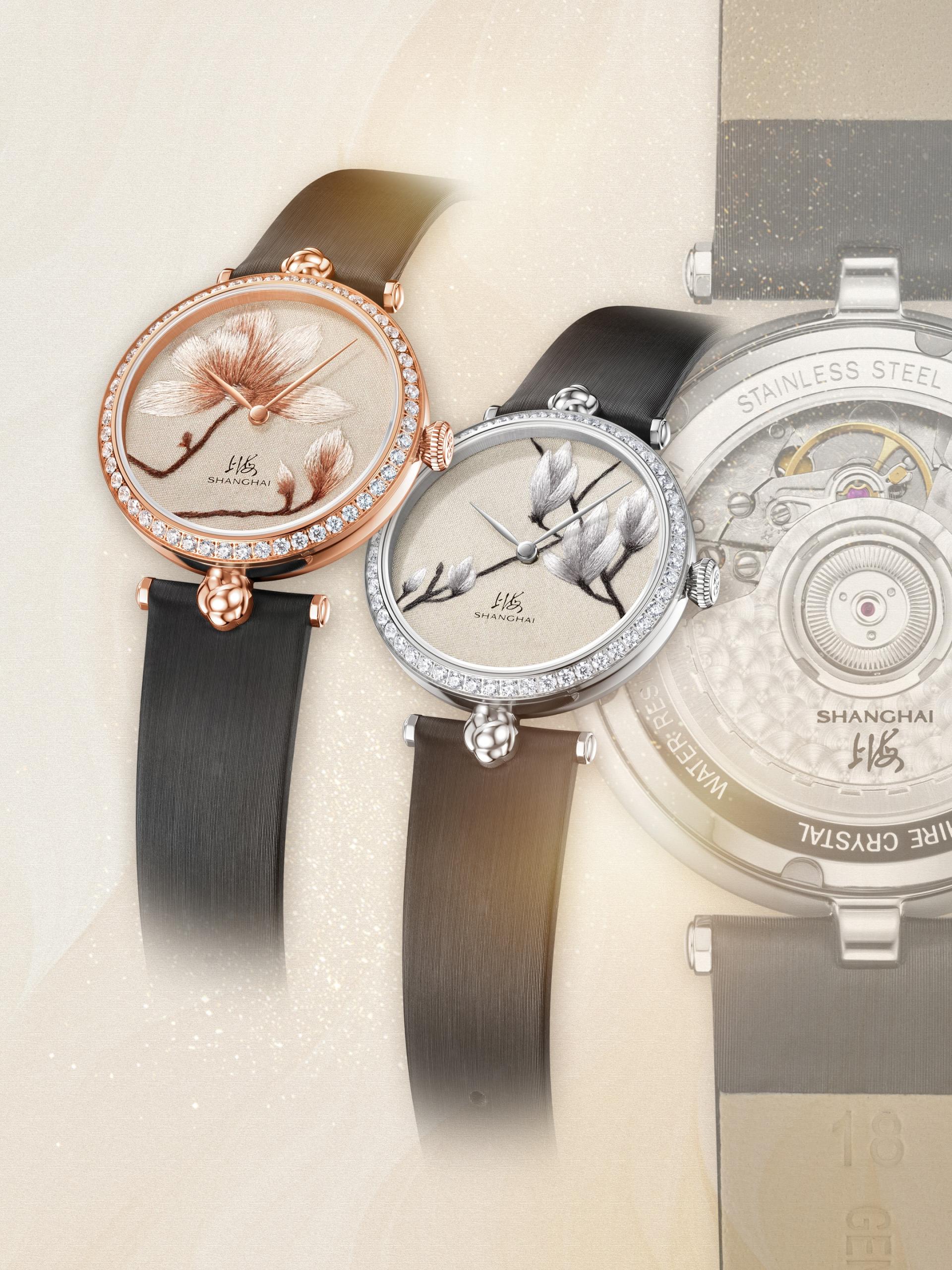 The SH Ladies Magnolia Embroidery Watch combines traditional Chinese fine embroidery skills with elements of Shanghai culture. The dial of the watch is designed with the white magnolia, the city flower of Shanghai. Through silk embroidery technology, the shape of magnolia flowers are vividly displayed, from the budding branches to a full blossom. The details are embroidered delicately, showing a graceful and light beauty. The design of the case lugs is taken from the classic rope knot buckle head of Shanghai-style cheongsam, which is unique and refinement.