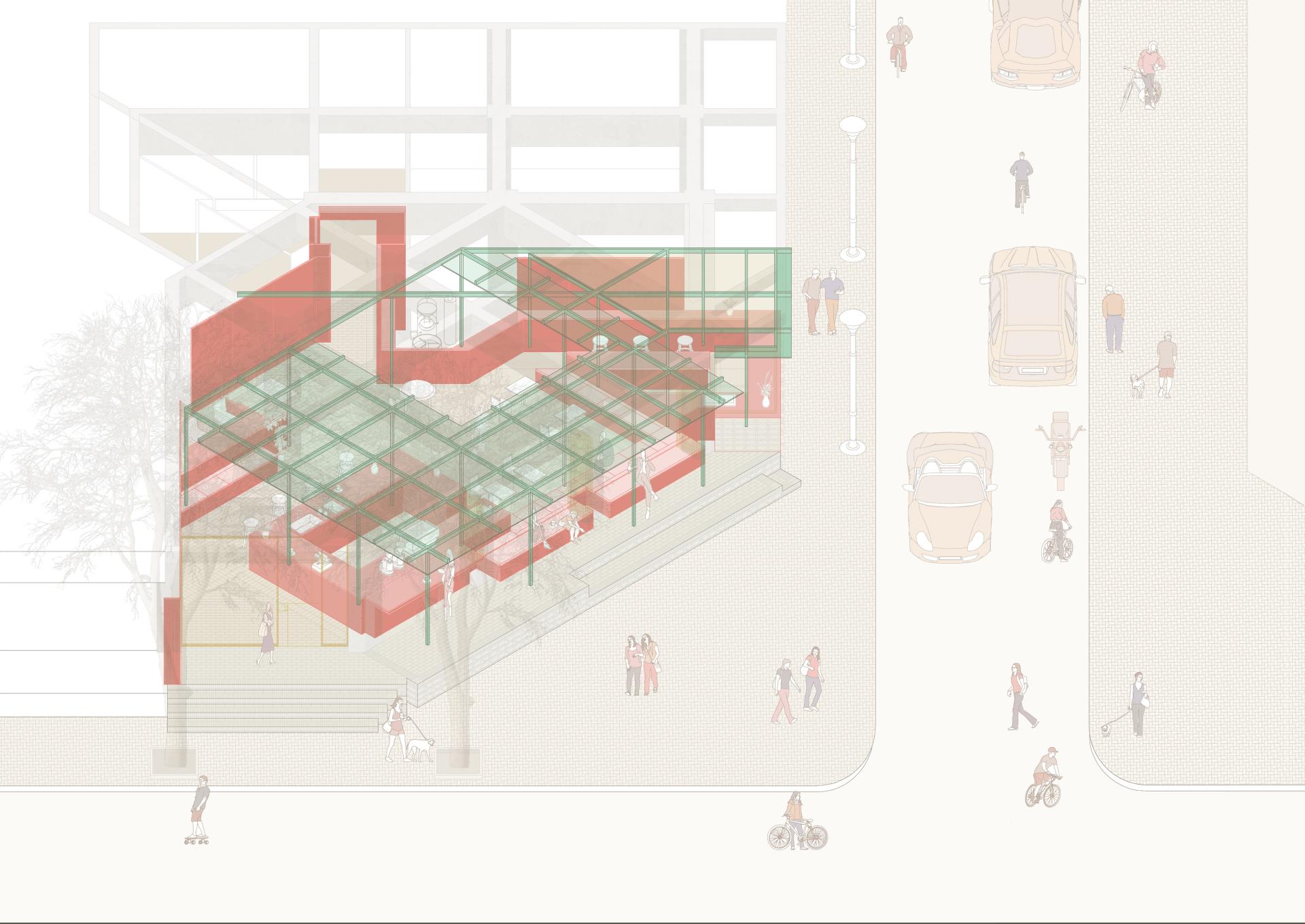 As a community café, the design aims to create a harmonious relationship between the indoor and outdoor environments, provide a comfortable spatial experience, accommodate multiple functions, and offer more public space for the city. By doing so, it allows diverse users to collectively shape the life scenes at the street corner, revitalizing the community. Through reflecting the "nearby" 15 meters, the design establishes a closer interactive relationship with thecommunity, thereby reflecting the "initial 500 meters" of the "nearby" and bringing people in the community closer together.