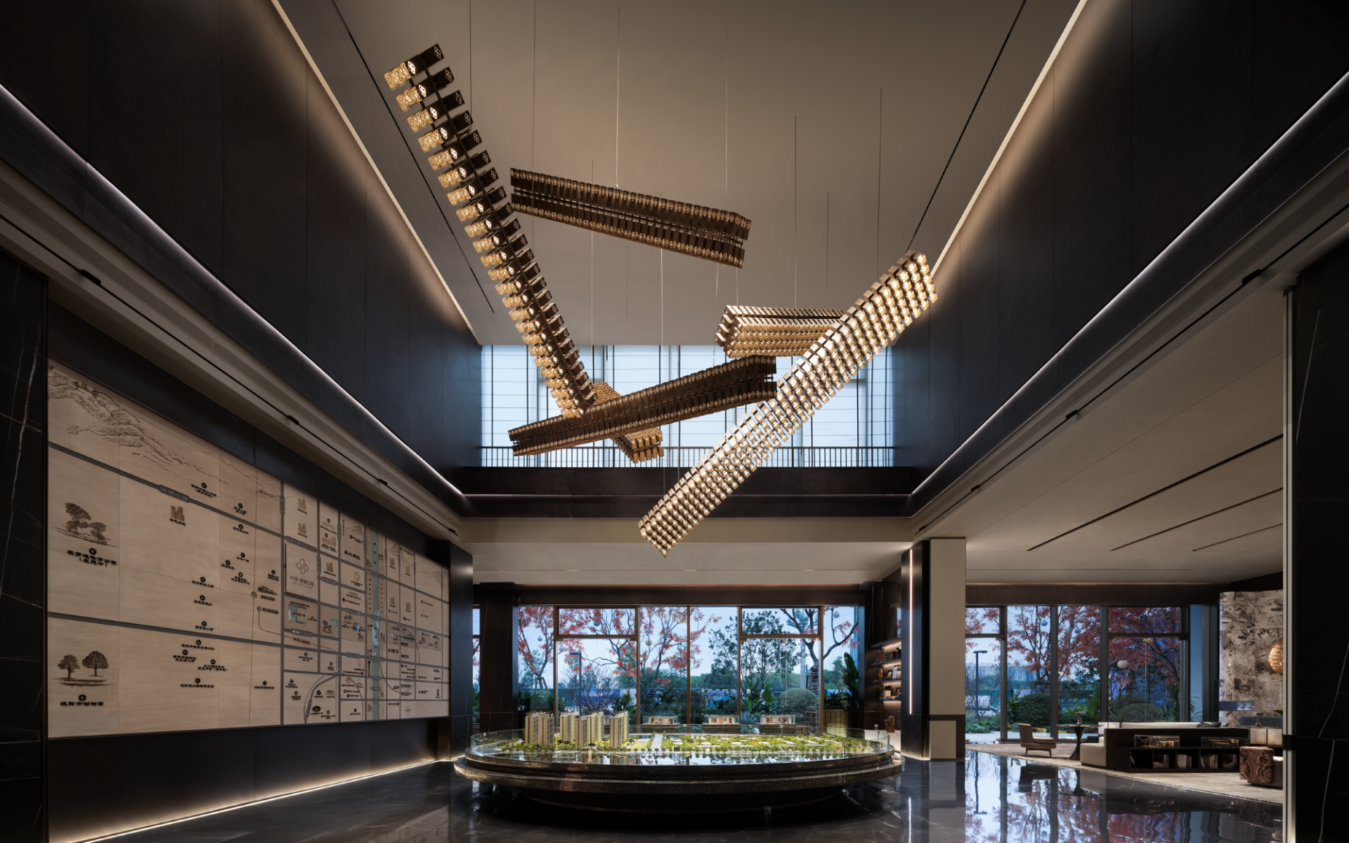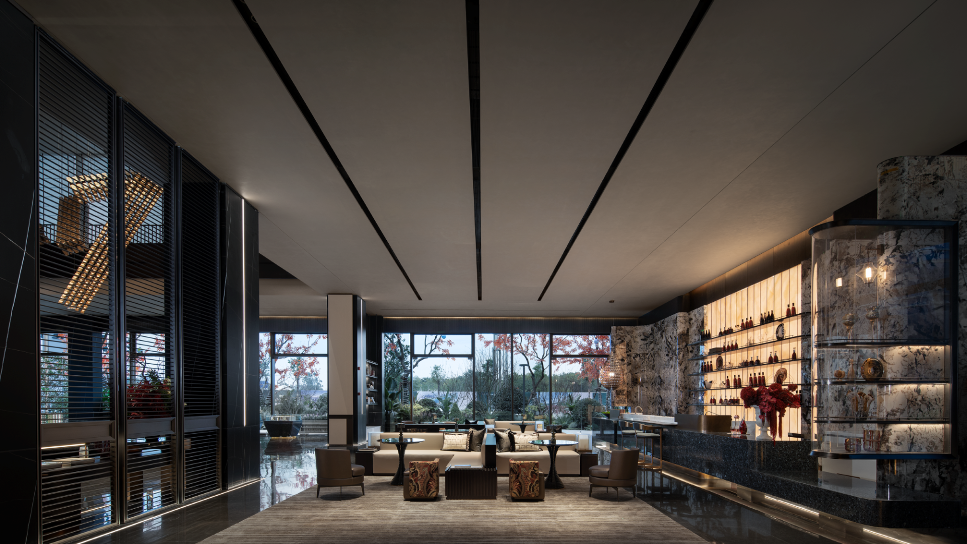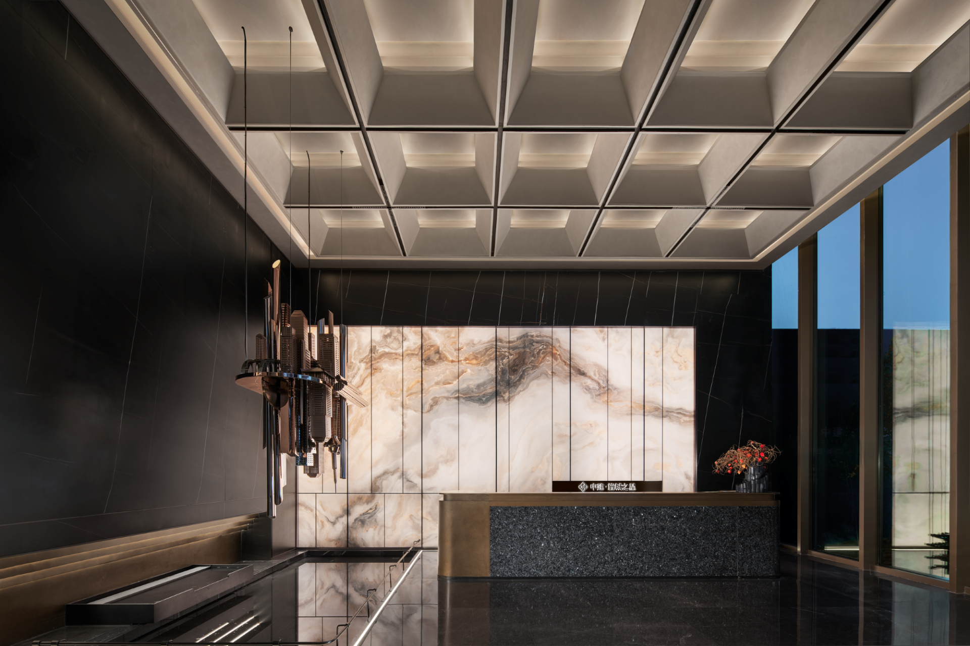 CSCEC STAR OF JINGCHENG draws inspiration from the century-old urban genes of Deyang, absorbing the concept of coexistence with nature and history. It perfectly blends traditional and modern design. The building's exterior takes "flowing stars" as its design theme, combining streamlined glass curtain walls with metal materials and dynamic light and shadow installations. At night, the building resembles a brilliant starry river in the city, shining brightly. The interior space mainly features light gold and gray tones, ingeniously integrating local cultural elements of Deyang, such as the abstract art wall of Sanxingdui patterns, creating an atmosphere of high-end elegance. It not only showcases the weight of history but also highlights the refinement of modern art.