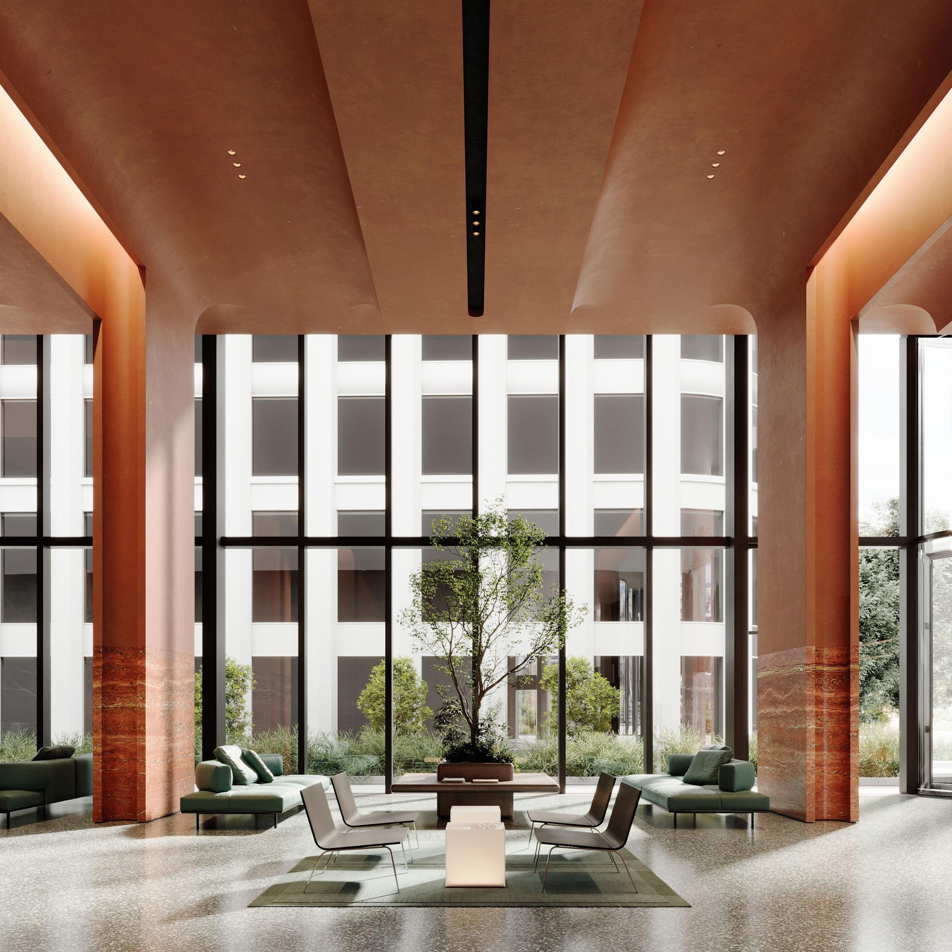 The lobby primarily serves a representational function. It creates the right impression of the resident companies in the building. Its uniqueness and memorability are important. The lobby provides a space to hold brief meetings, wait for colleagues, and enjoy a cup of coffee. It allows people to be productive and fully appreciate the moment.