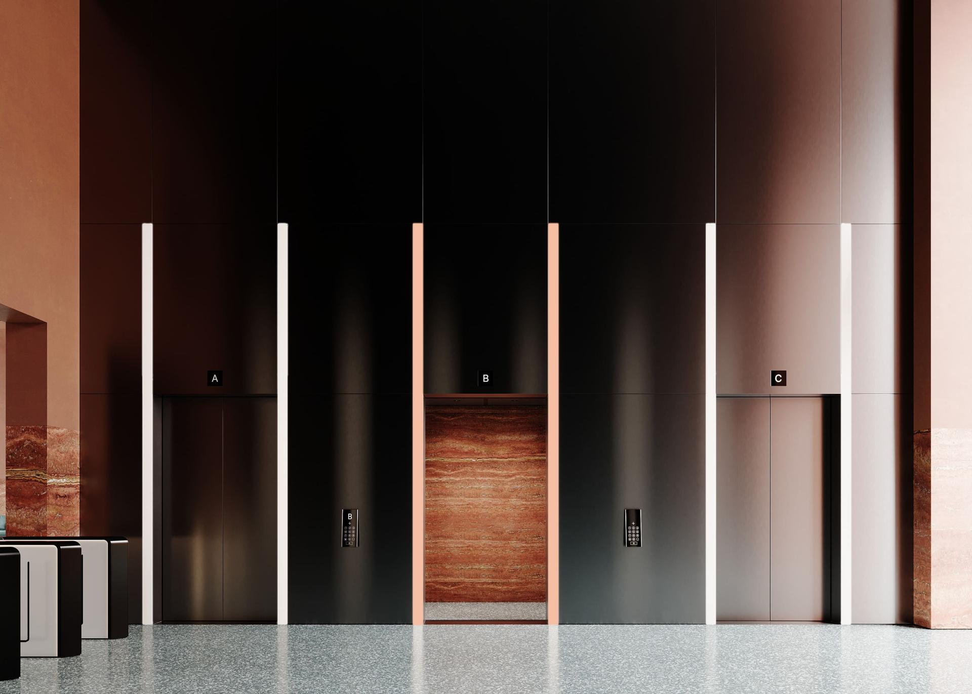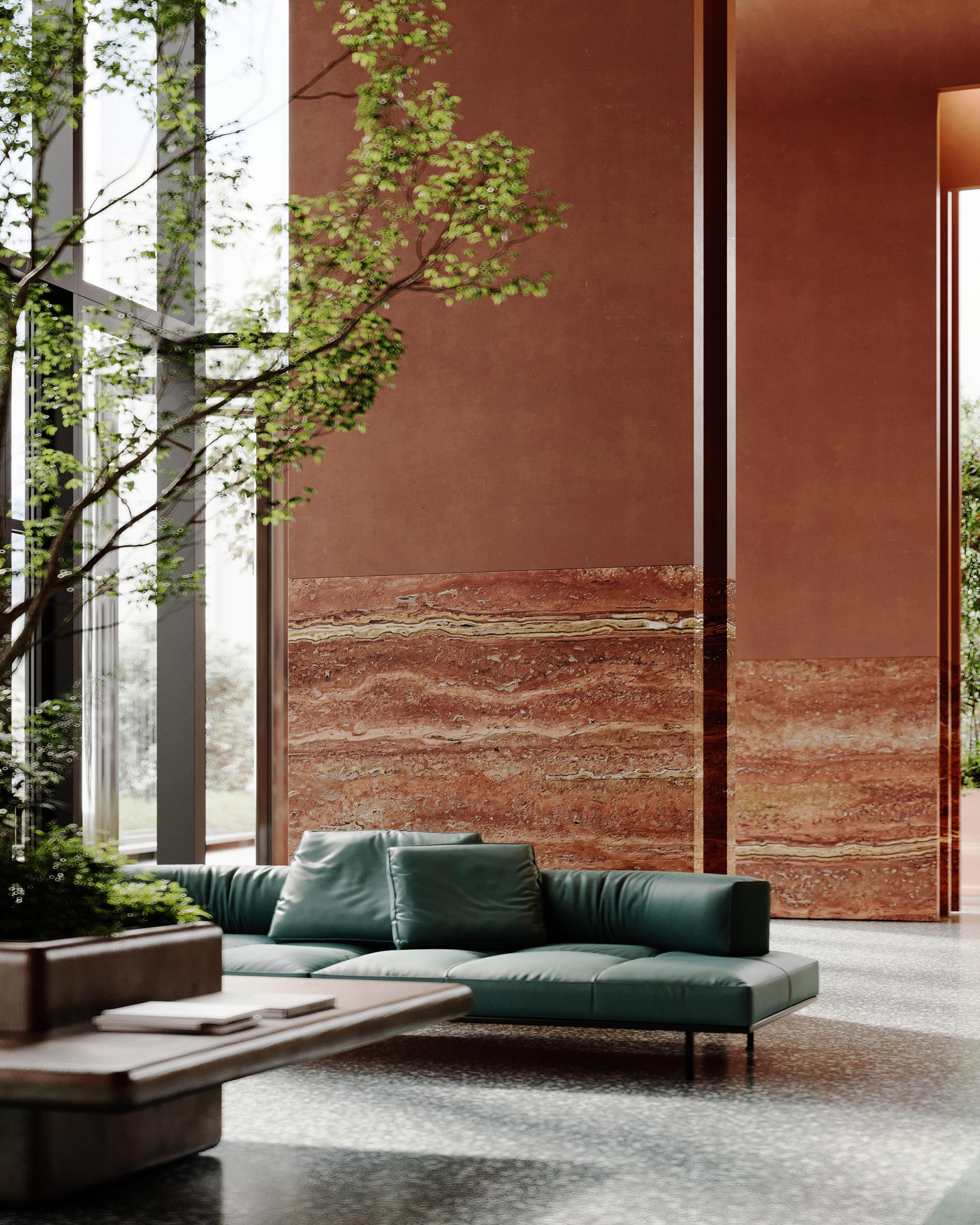 Natural stone with rich texture continues the overall hue and adds an element of natural vibrancy, authenticity, and sensuality. One would not expect emotion in the interior of a strict office tower; it is precisely this contrast that makes the design intriguing.