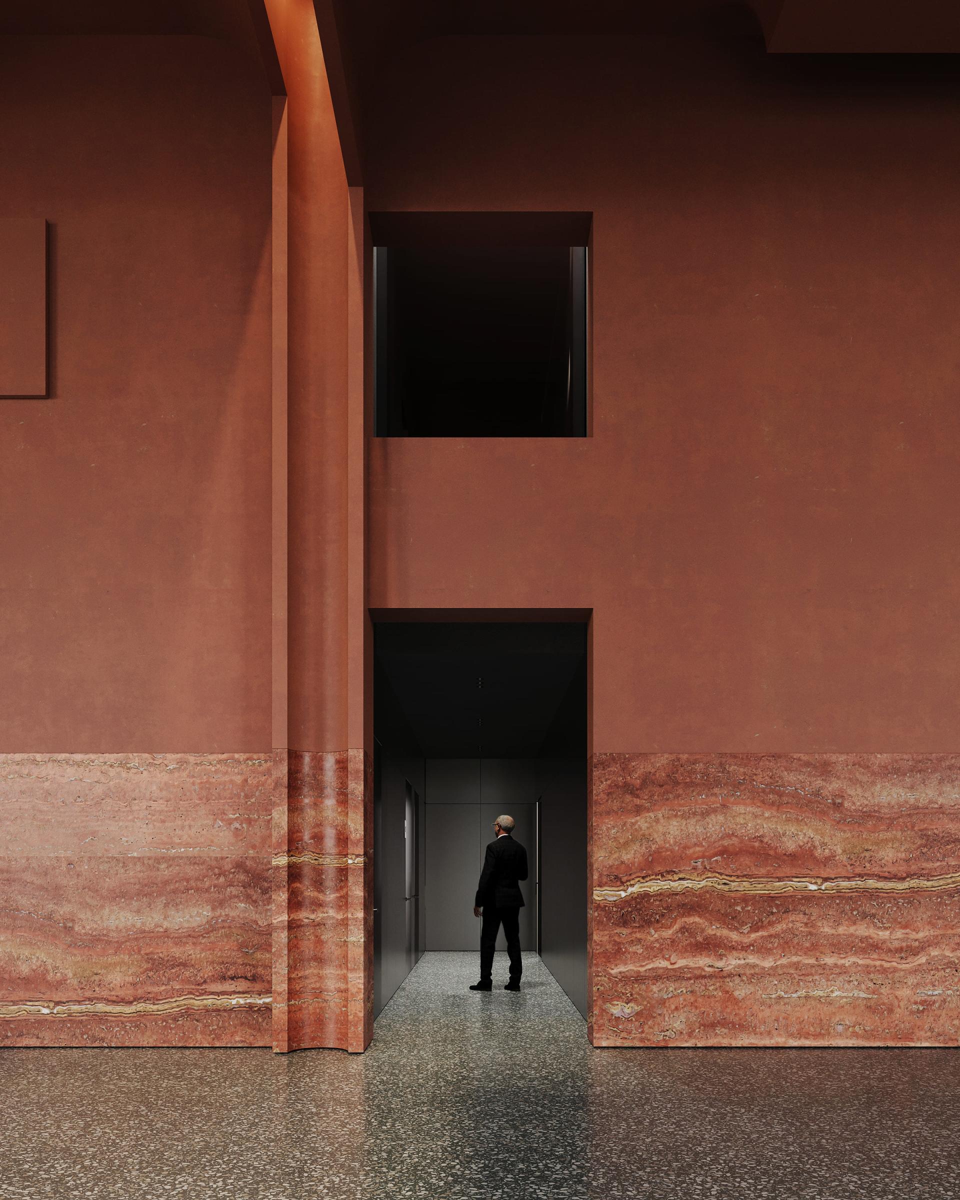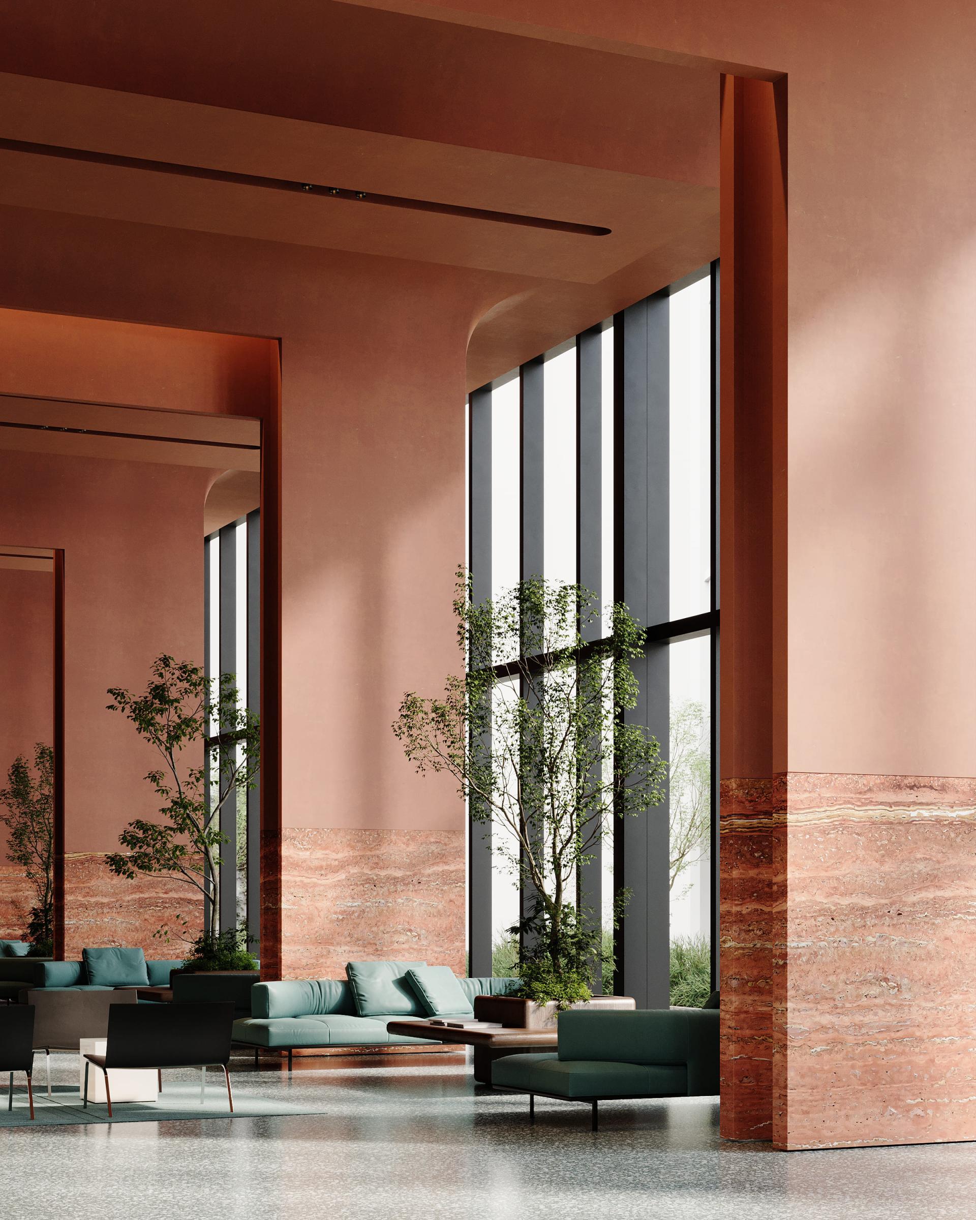The terracotta color becomes the heart of this building, glowing from within and making a strong impression when approached from the street through the windows. The choice of this hue is not only an artistic decision but also a meaningful one: it emphasizes the connection of the new building with nearby cultural heritage sites made of red brick.