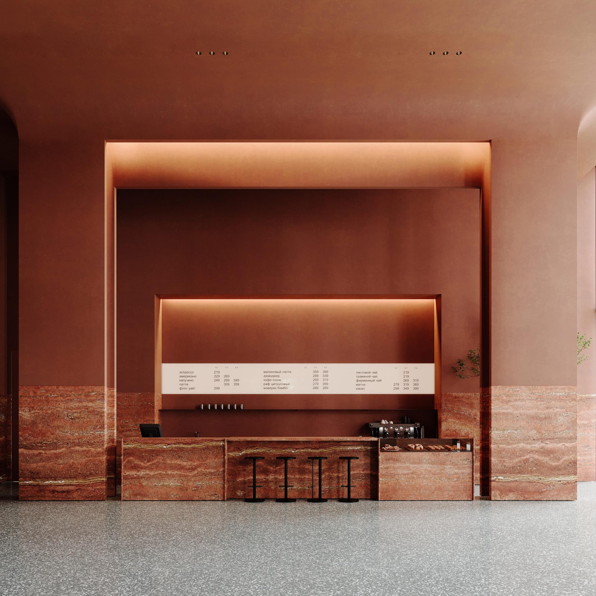 The visual concept emerged from the structure of the space. The architects designed a series of portals that conditionally divided the lobby into distinct zones. These portals serve as frames for visual narratives and original compositions.
