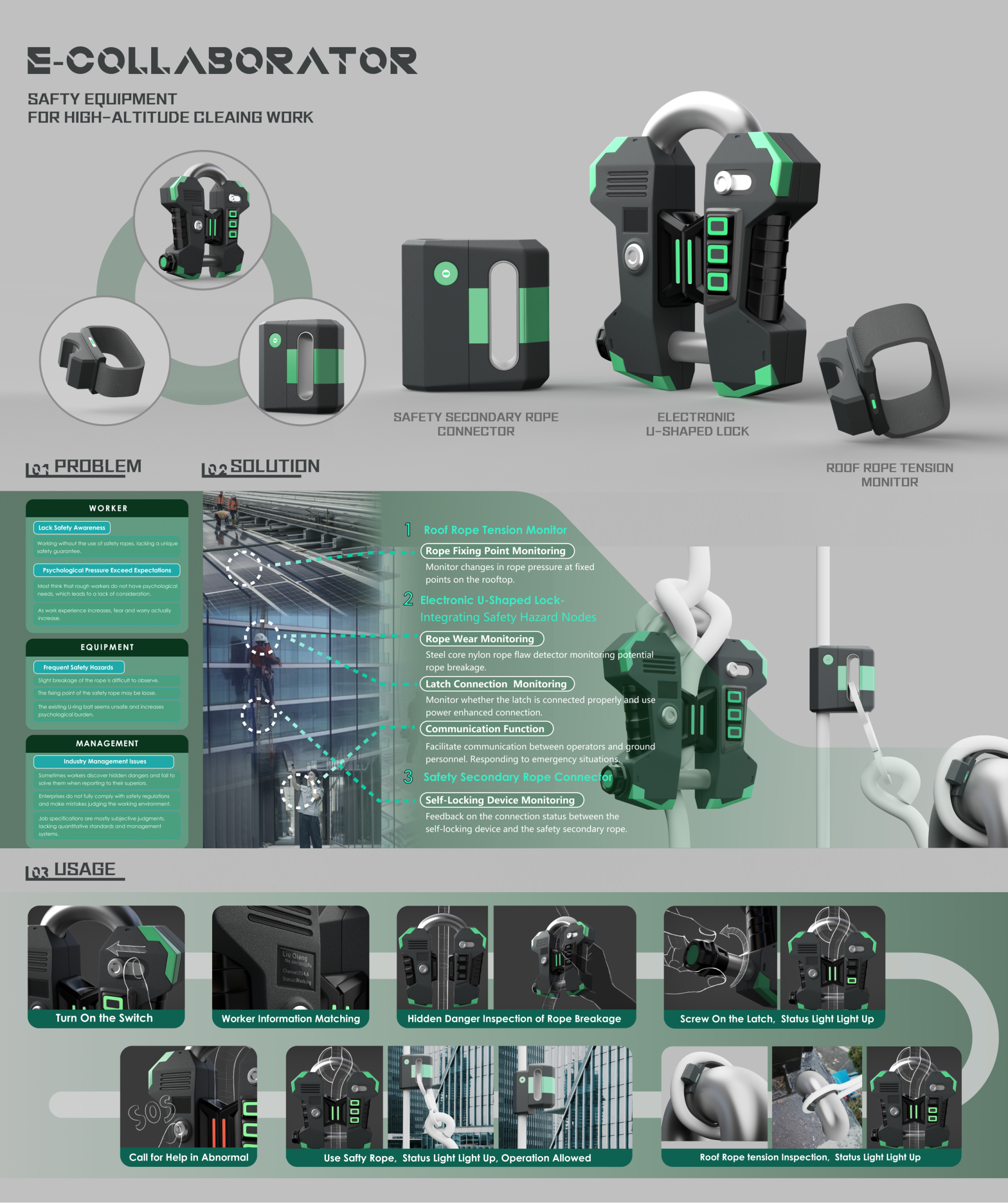 This intelligent system is based on the existing U-shaped lock structure for high-altitude operations, and innovatively integrates functions such as wire rope flaw detection, wall top fixed point tension monitoring, safety auxiliary rope and U-shaped lock pin connection status, achieving full coverage monitoring of rope safety contacts and providing LED feedback. At the same time, it integrates communication functions to promptly contact rooftop patrol personnel and respond to emergencies.