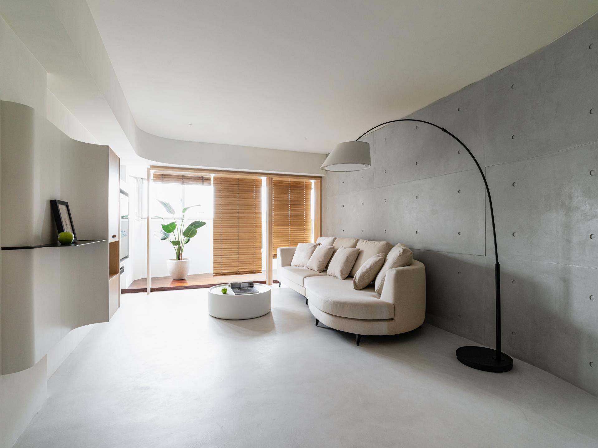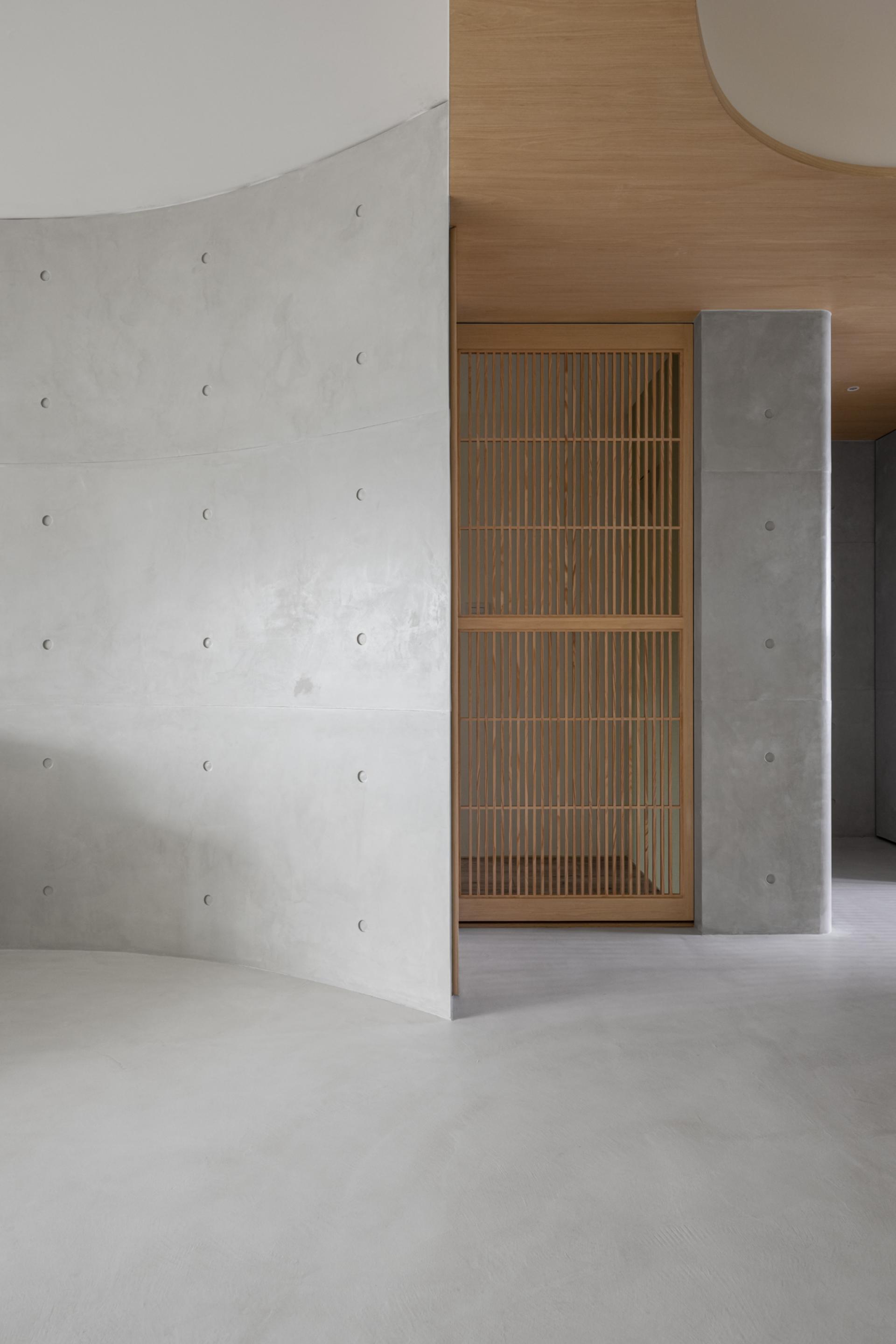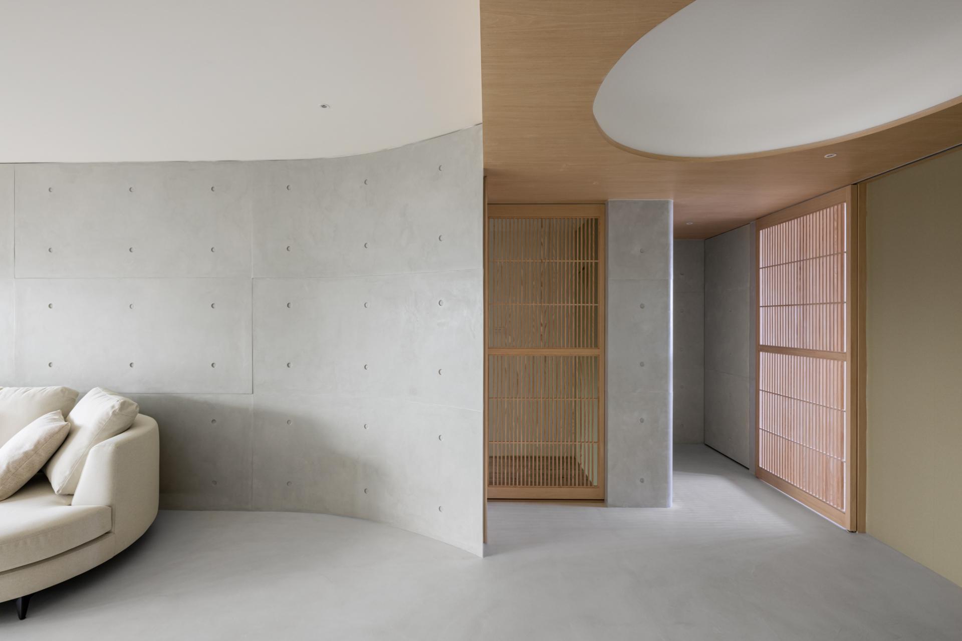 The living space is designed as a rectangular volume with one large side, using a 90/180 ratio. The main theme is a curved fair-faced concrete wall, which breaks the visual constraints of the rectangular layout. This creates a sense of proportional perspective and spatial extension. The sleek angle of the wall extends forward to the geometric arc on the ceiling, creating a dialogue of unity in Zen practice. This approach introduces large-scale architectural methods into the interior, enhancing the sense of openness free from the constraints of the indoor layout.