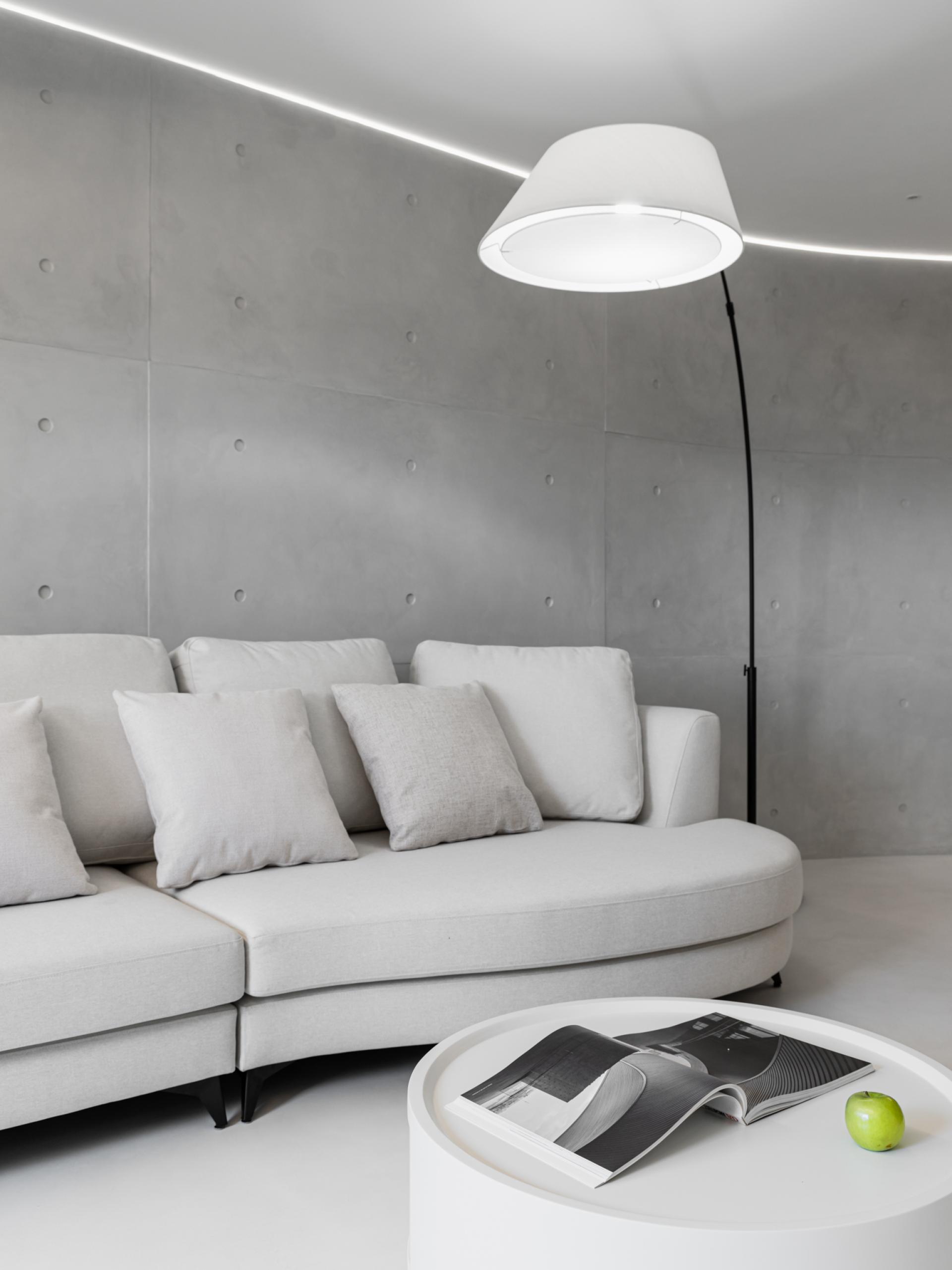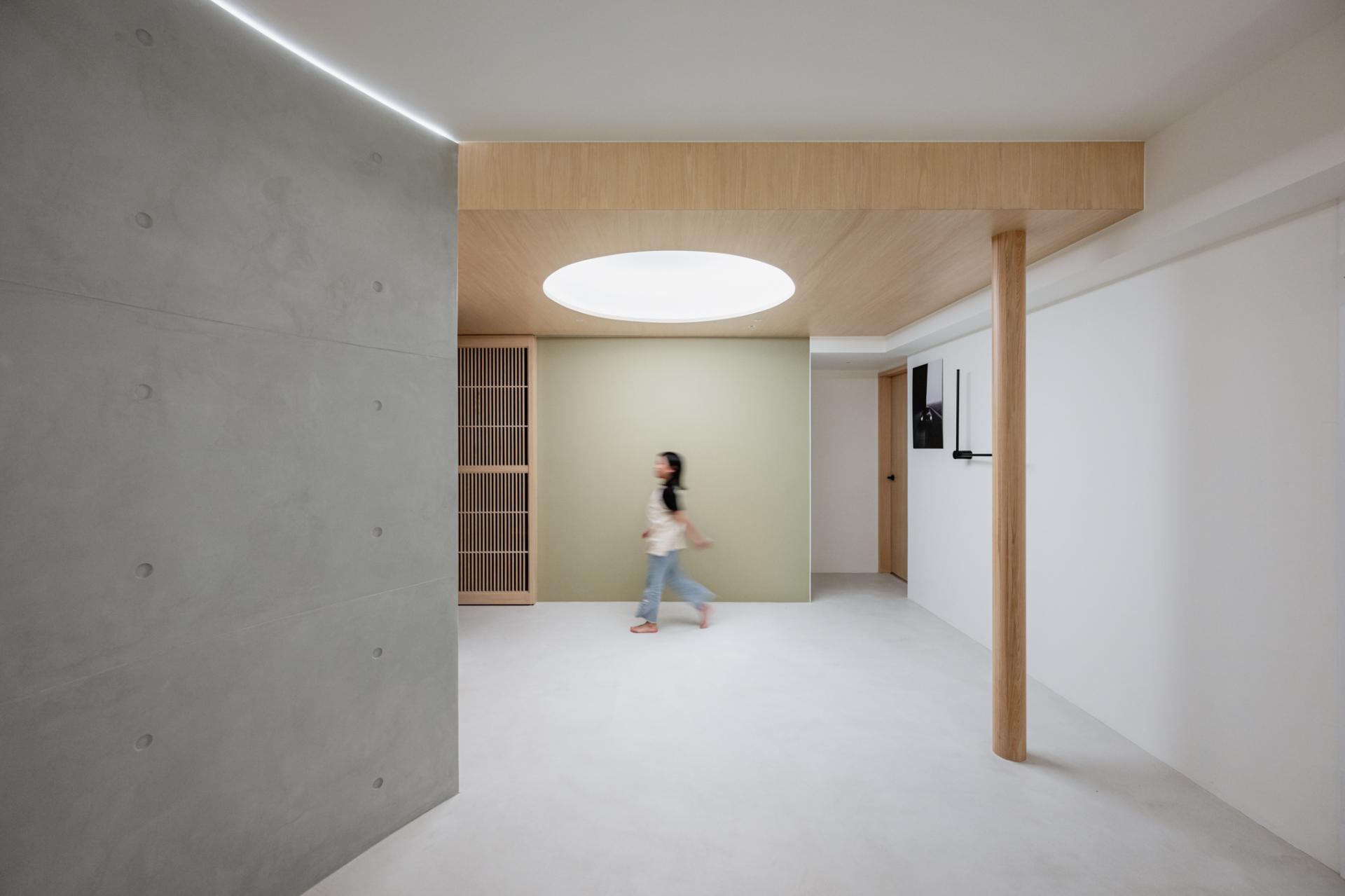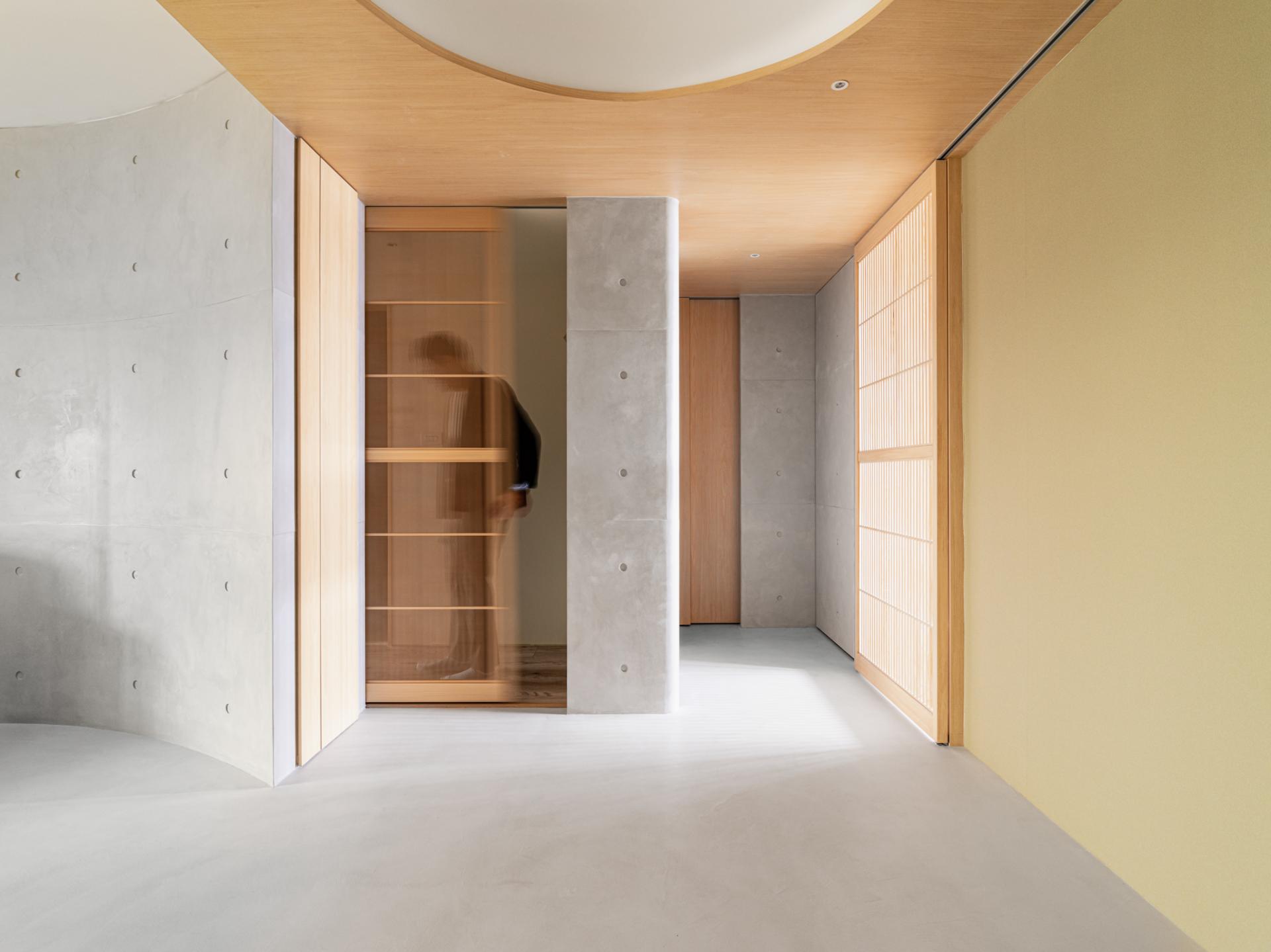 The living space is designed as a rectangular volume with one large side, using a 90/180 ratio. The main theme is a curved fair-faced concrete wall, which breaks the visual constraints of the rectangular layout. This creates a sense of proportional perspective and spatial extension. The sleek angle of the wall extends forward to the geometric arc on the ceiling, creating a dialogue of unity in Zen practice. This approach introduces large-scale architectural methods into the interior, enhancing the sense of openness free from the constraints of the indoor layout.