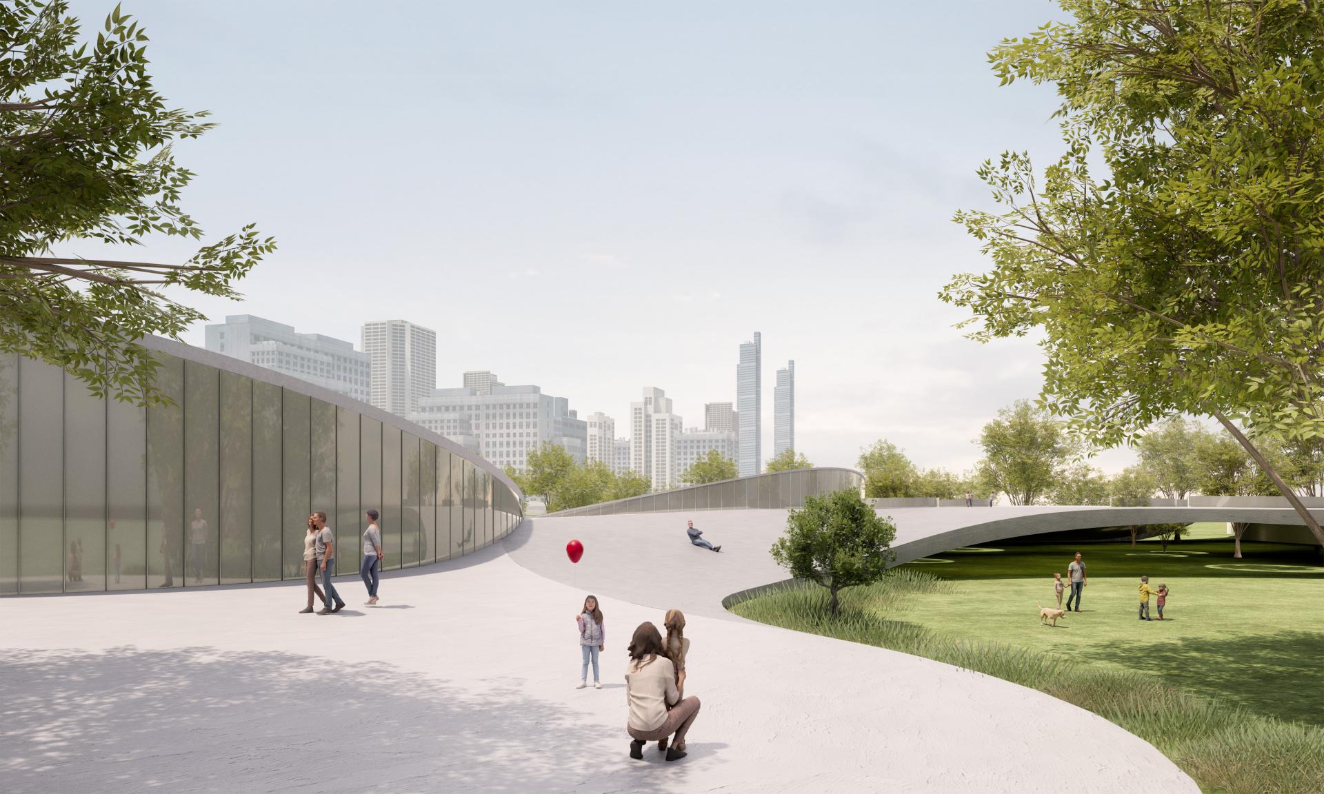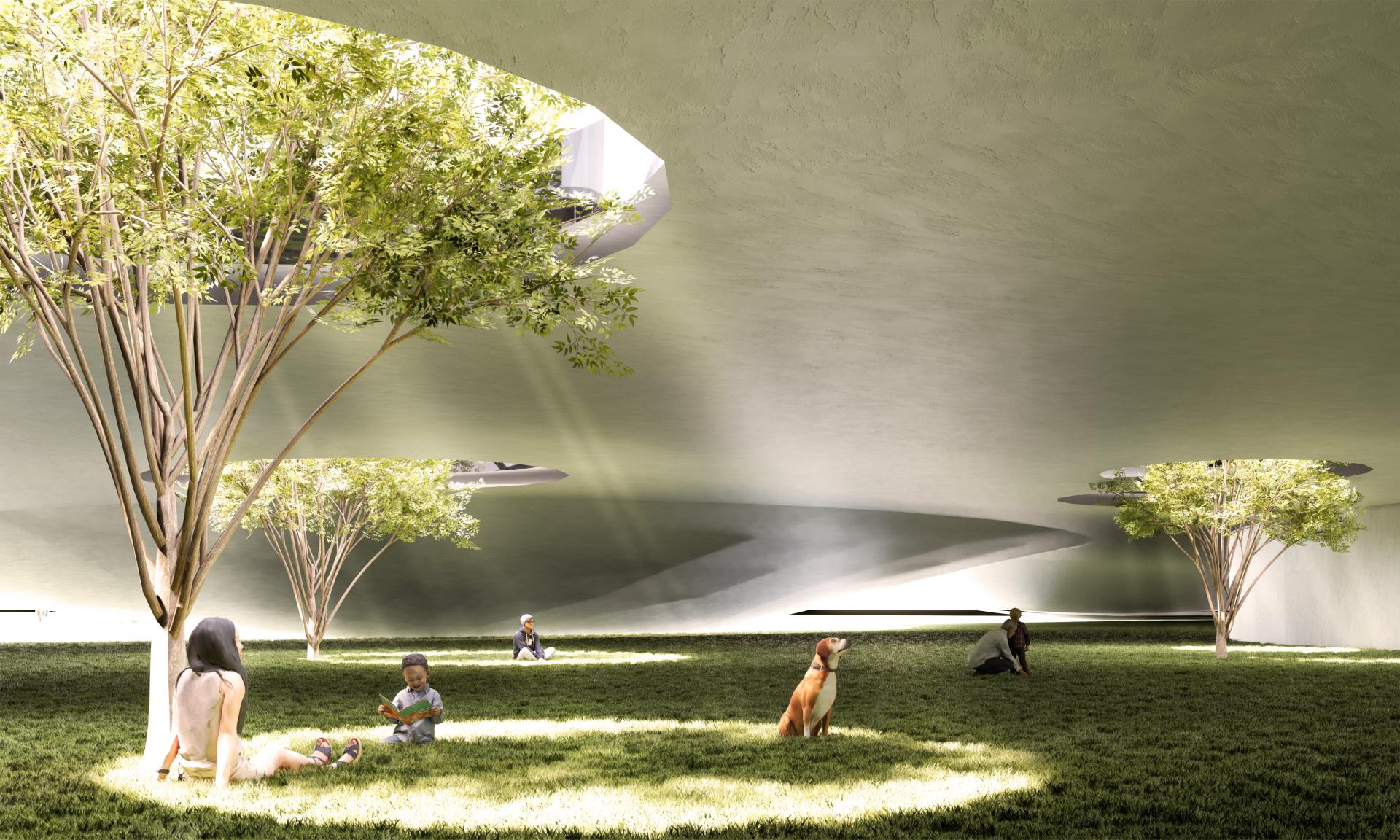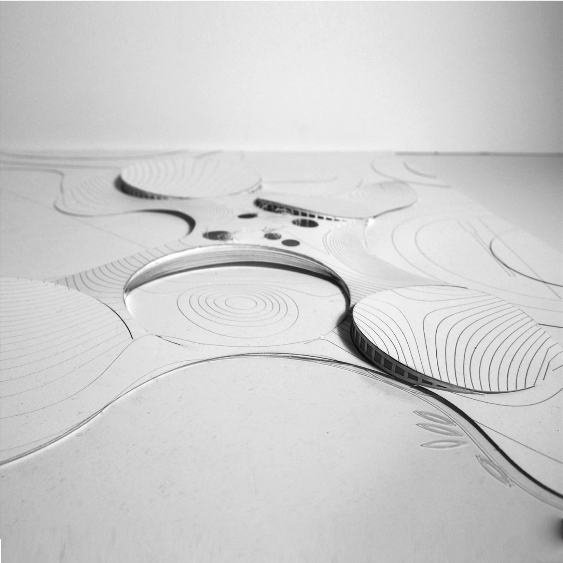 Situated between two prominent recreational fields in New York City's East River Park, the project embeds itself within the existing network of outdoor programs, accommodating a kayak boathouse, public piers, and arts and crafts studios. The design follows a landscape-driven approach, generating a secondary ground condition shaped by geometric parameters that inform its formal articulation. Emerging from the site's topography, the project introduces an elevated ground plane that supports open public activities while maintaining a fluid continuity with the park. Despite its monolithic appearance, the surface lifts, folds, and peels away at key moments, revealing embedded programmatic volumes. This peeling gesture carves circulation corridors through the interstitial spaces, structuring a dynamic sequence of public environments across multiple scales.