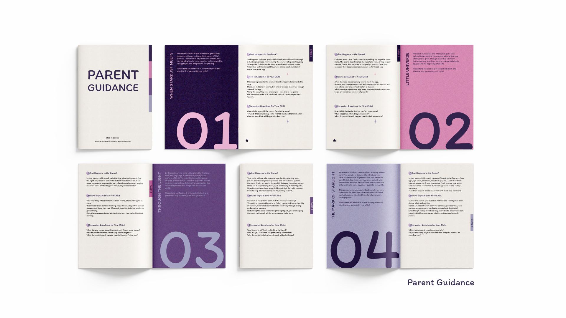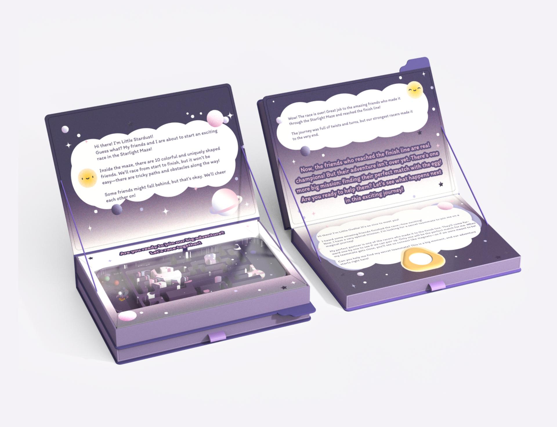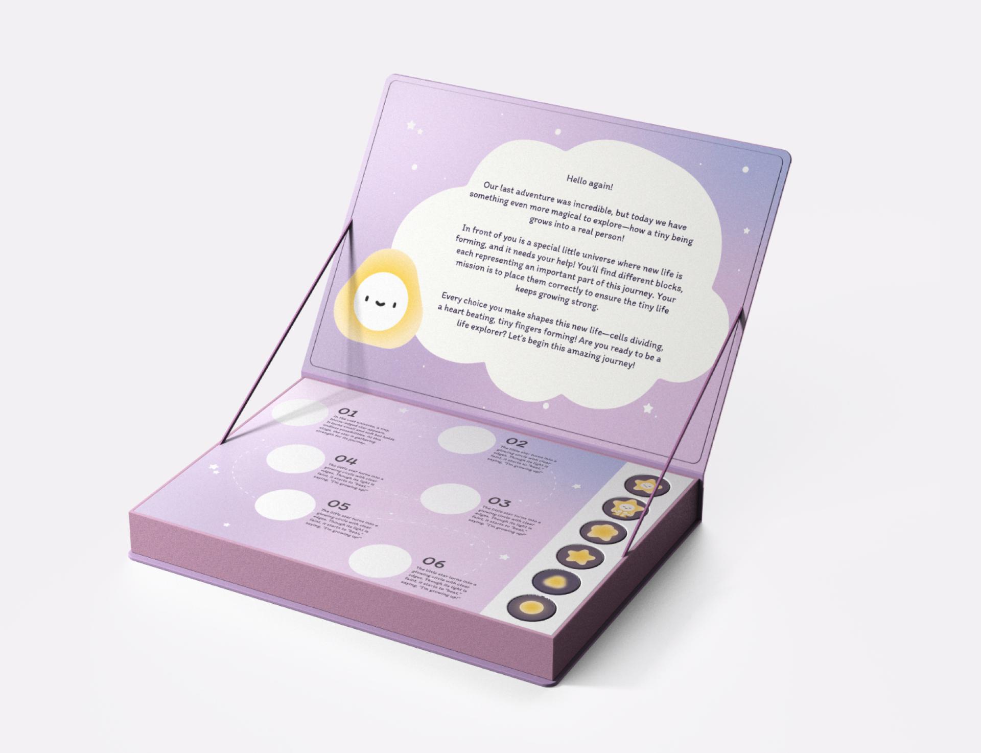 The story follows a tiny spark in space, representing the beginning of life. As children progress through four sections, each guiding children through a different stage of life’s beginning. "When Stardust Meets" includes two games where children first navigate a maze representing the journey of sperm, followed by a matching game that introduces fertilization. "Little Universe" presents a block-placement activity where children arrange pieces to reflect the stages of an unborn child’s development. "Through the Light" challenges children to turn plates and form a connected path, symbolizing the complexities of pregnancy and birth. "The Mark of Starlight" invites children to assemble transparent trait cards to create a unique character, helping them understand genetic inheritance.