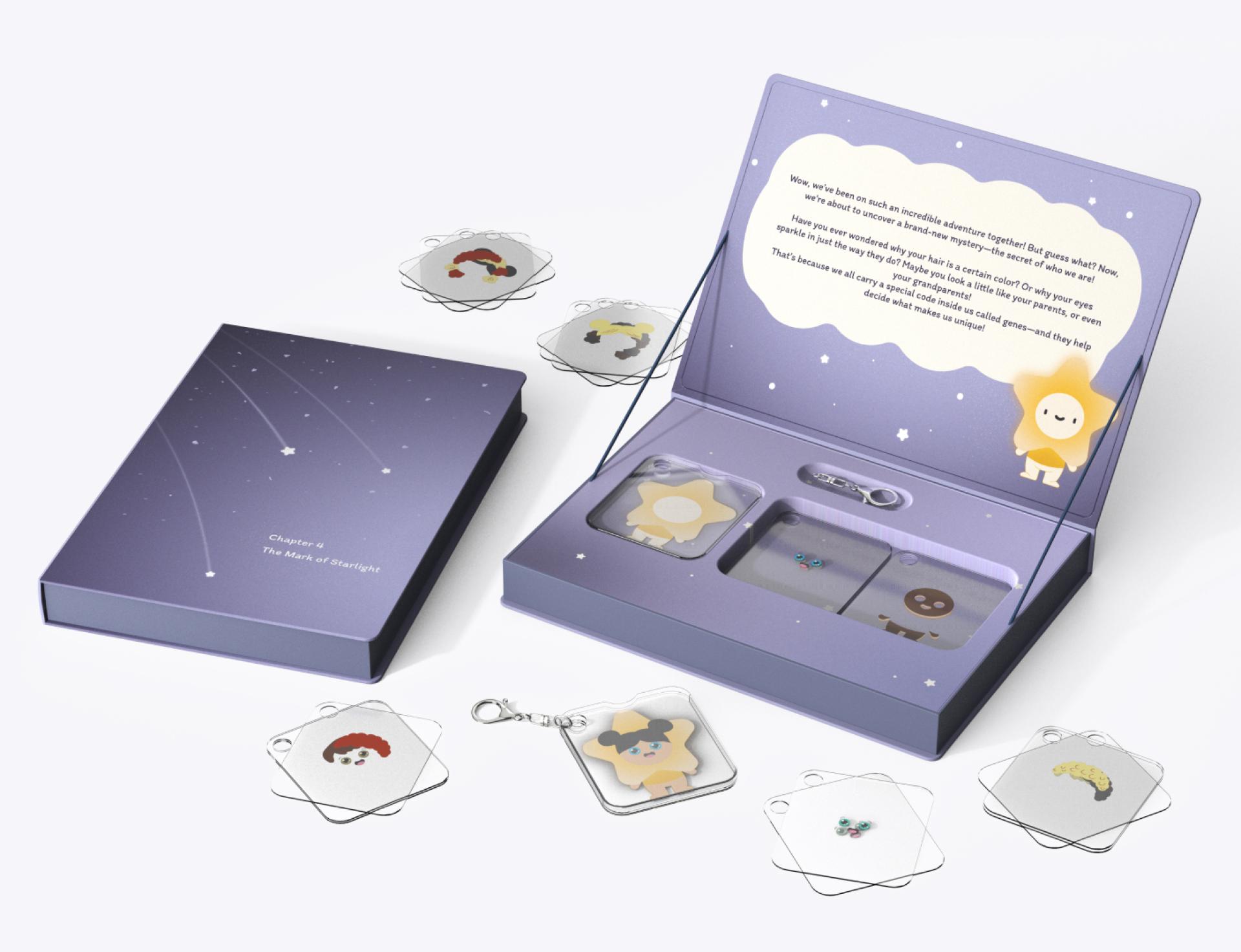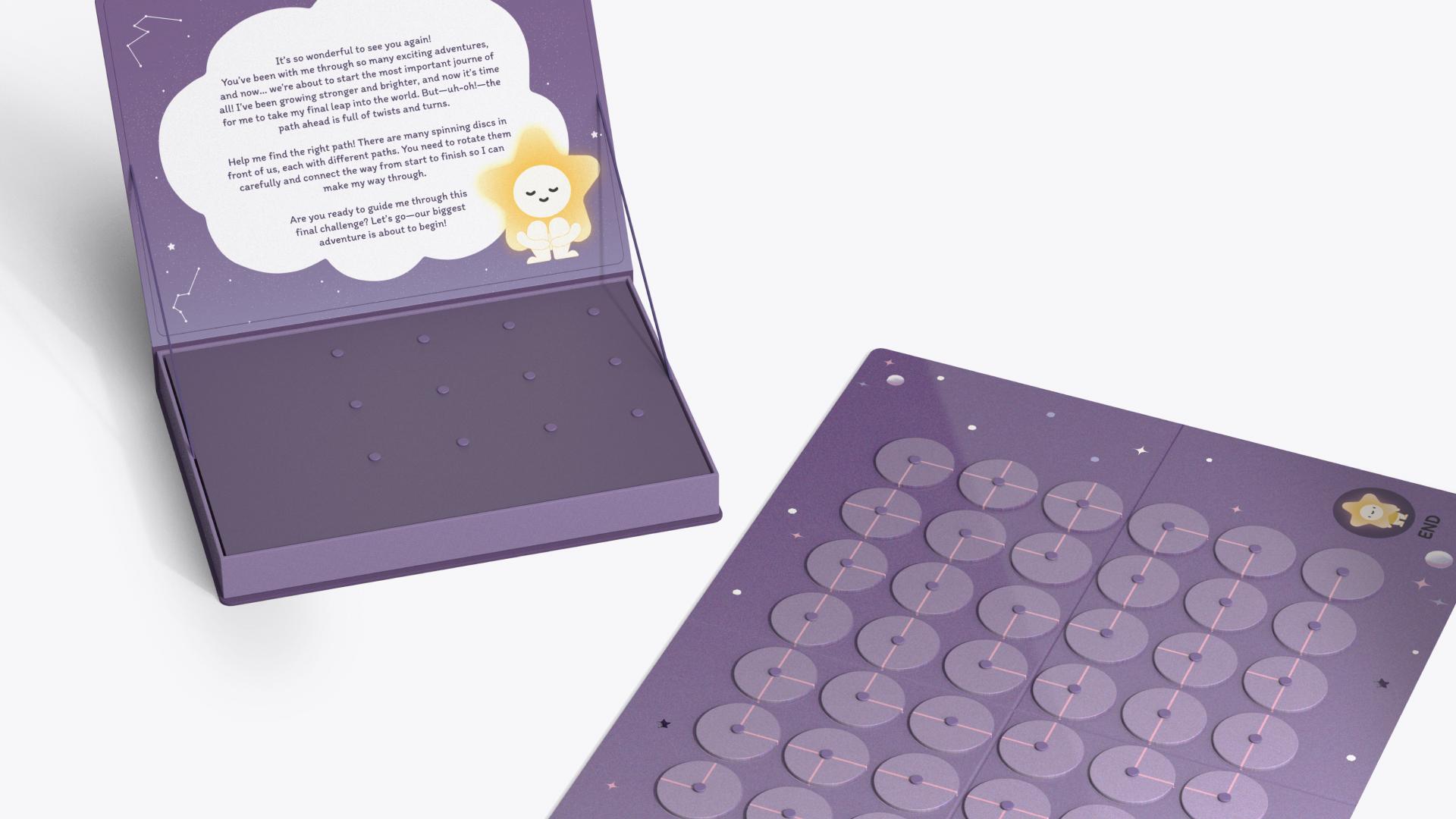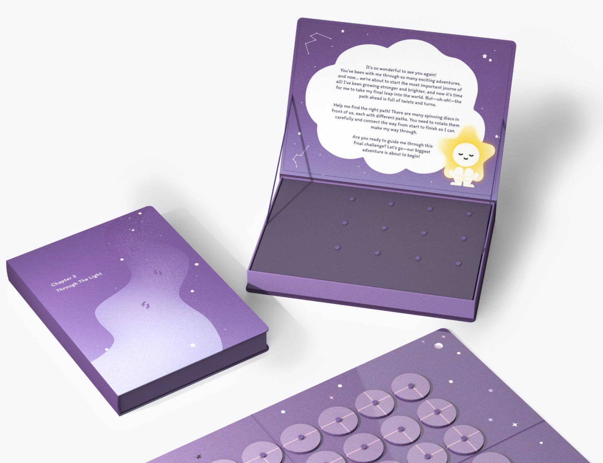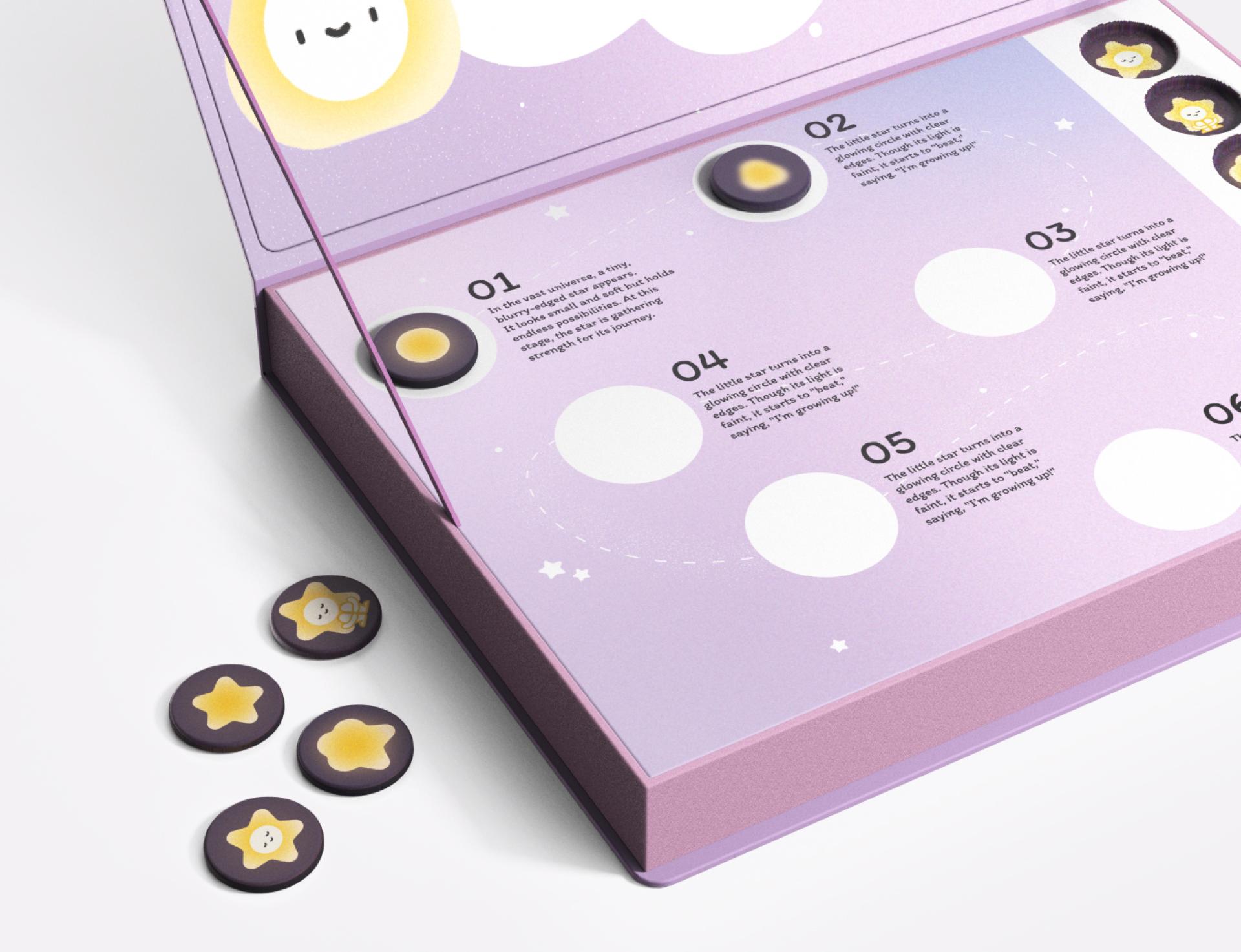The story follows a tiny spark in space, representing the beginning of life. As children progress through four sections, each guiding children through a different stage of life’s beginning. "When Stardust Meets" includes two games where children first navigate a maze representing the journey of sperm, followed by a matching game that introduces fertilization. "Little Universe" presents a block-placement activity where children arrange pieces to reflect the stages of an unborn child’s development. "Through the Light" challenges children to turn plates and form a connected path, symbolizing the complexities of pregnancy and birth. "The Mark of Starlight" invites children to assemble transparent trait cards to create a unique character, helping them understand genetic inheritance.
