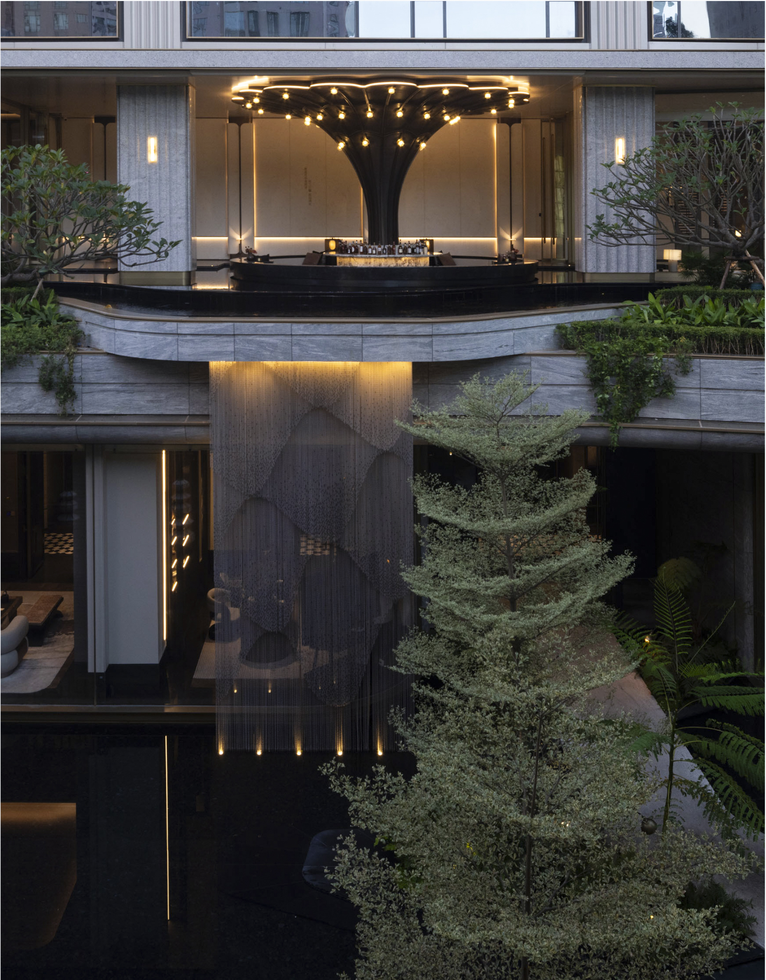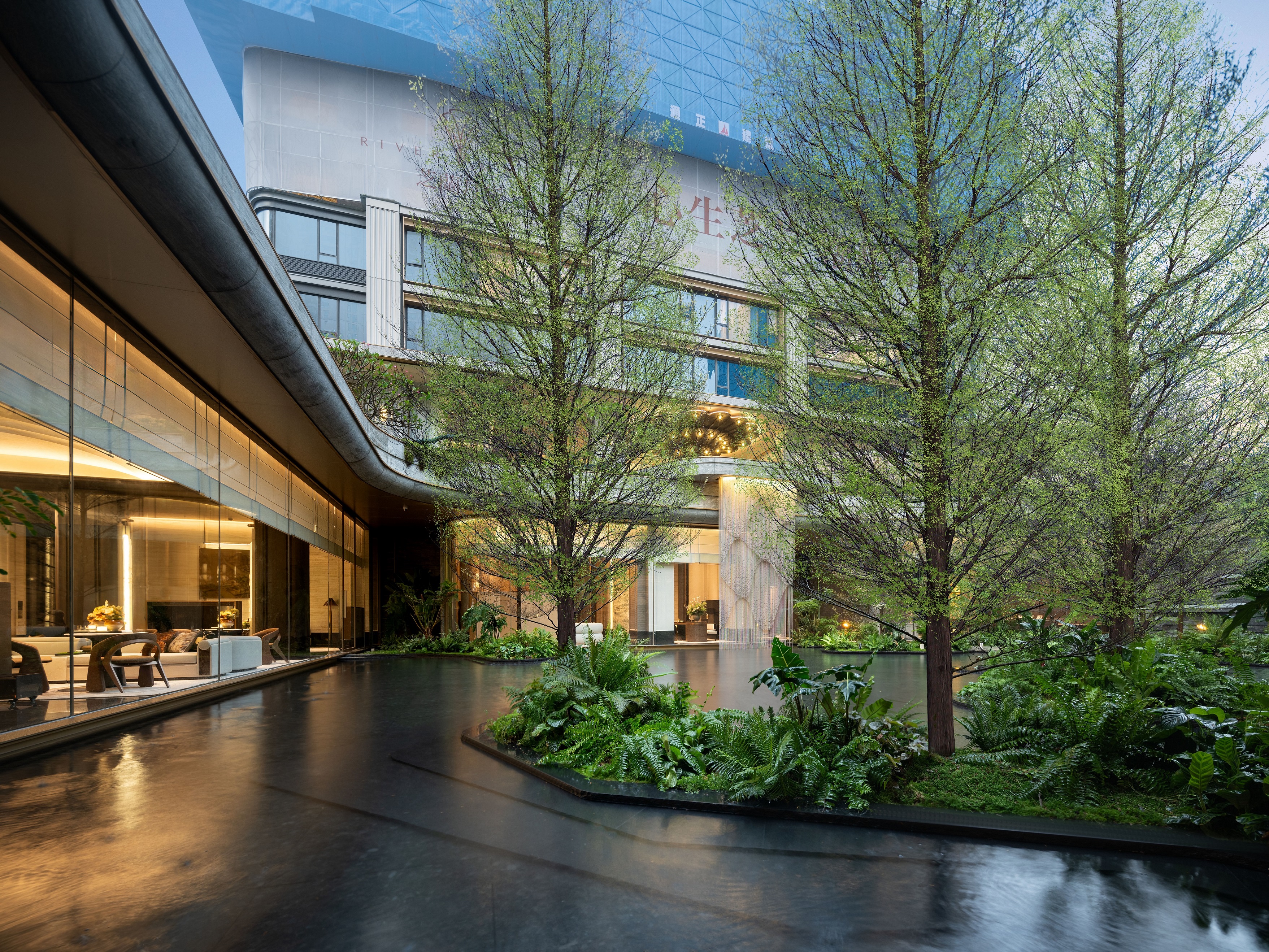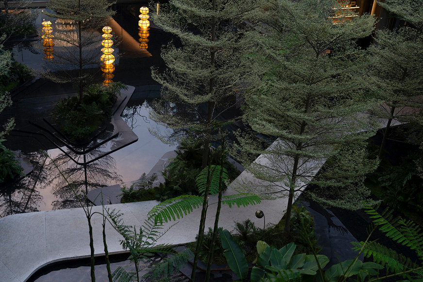 Under the rich main door, two "magnificent gilt" fountains are arranged on both sides of the lobby passage, and different kinds of special plants are planted in the drop-off area, forming an urban jade gallery with plant clusters, softening the boundary between the home lobby and the urban area. The sunken courtyard terrace is staggered to form a cascade of steps, interpreting the urban forest springs, the hierarchical three-dimensional garden, the unrolling green "valley" and the flowing jade belt water gallery, bringing a richer landscape experience to the original unobstructed atrium.