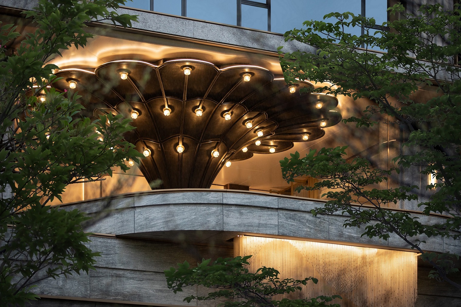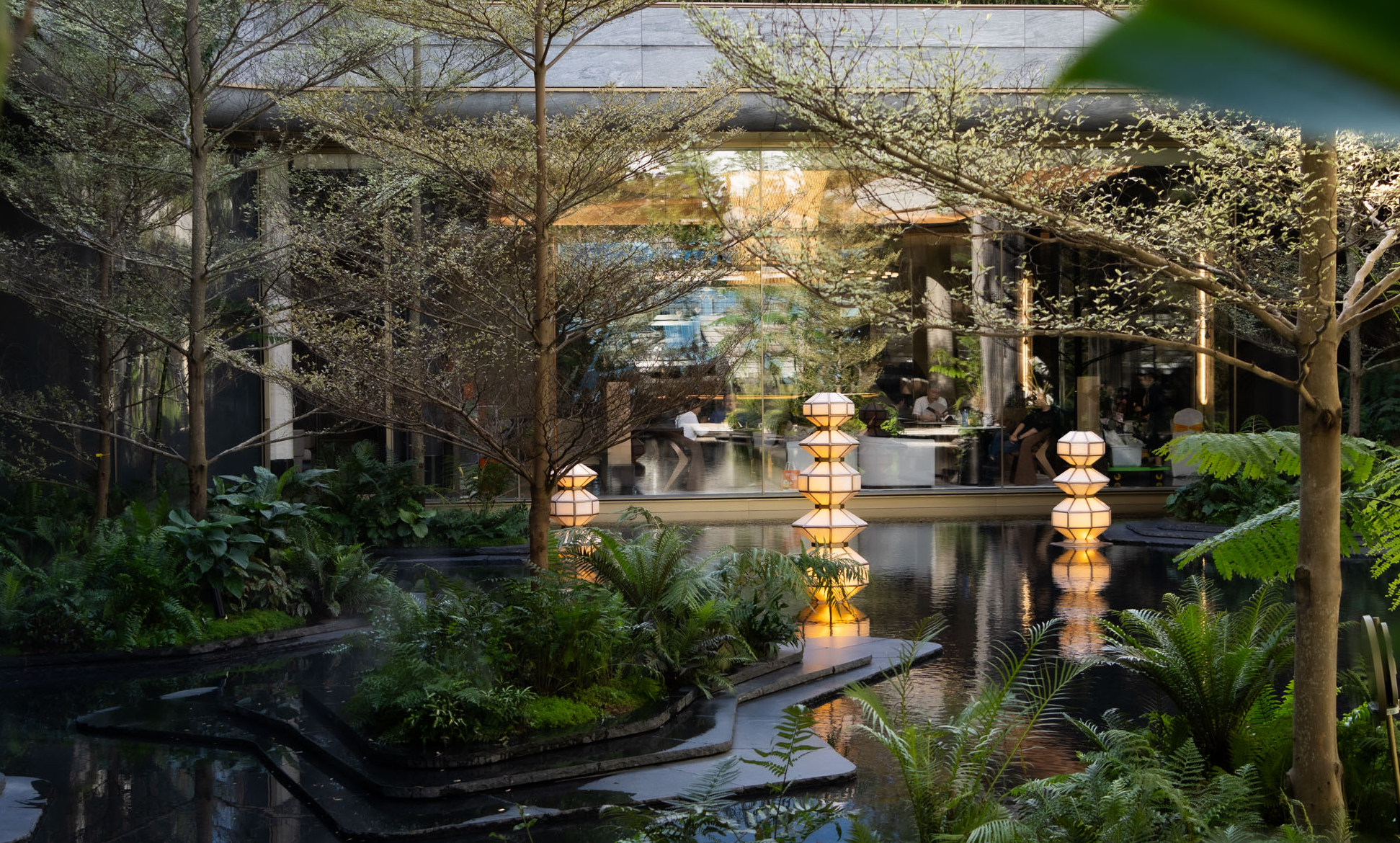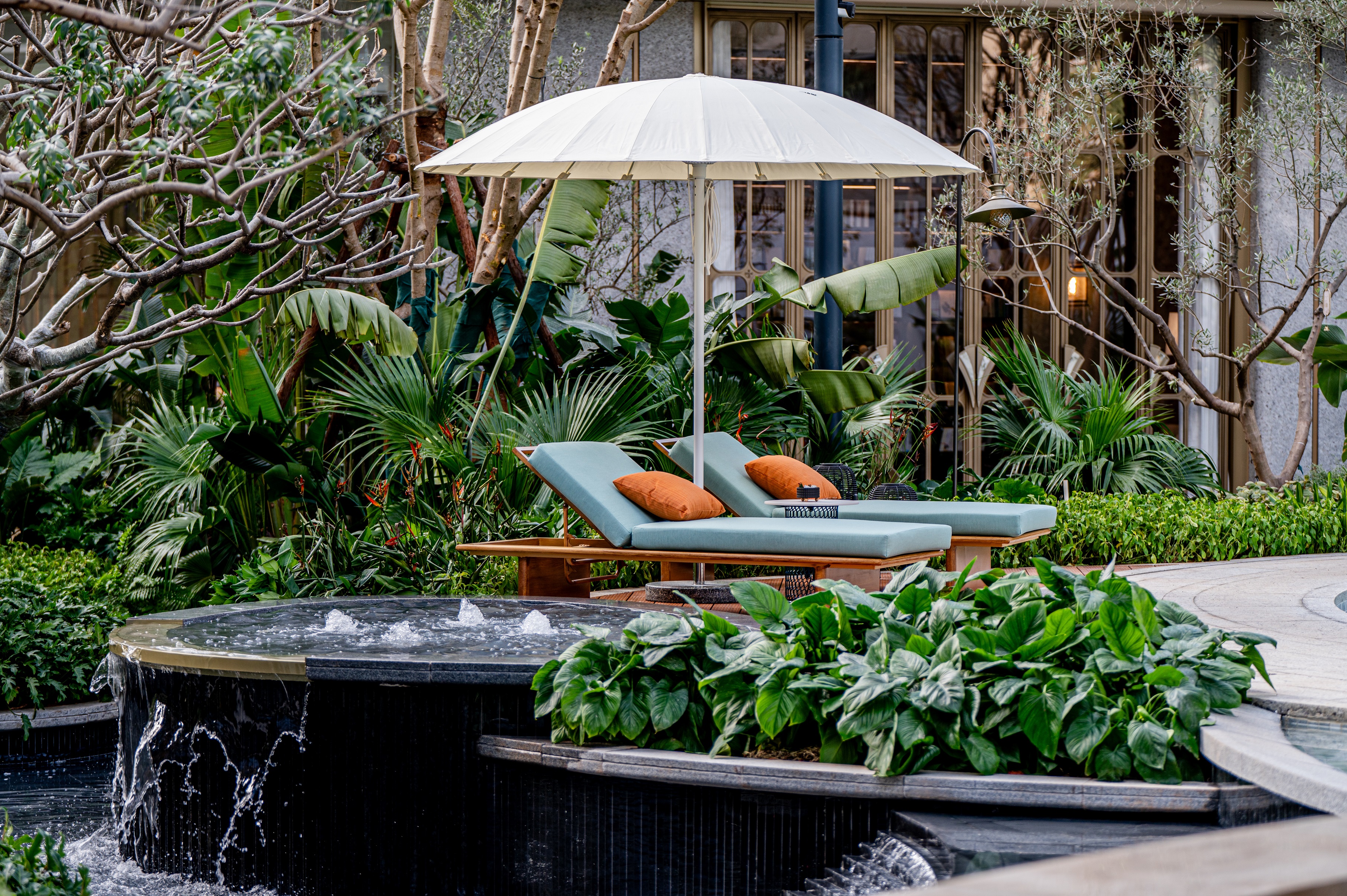 Under the rich main door, two "magnificent gilt" fountains are arranged on both sides of the lobby passage, and different kinds of special plants are planted in the drop-off area, forming an urban jade gallery with plant clusters, softening the boundary between the home lobby and the urban area. The sunken courtyard terrace is staggered to form a cascade of steps, interpreting the urban forest springs, the hierarchical three-dimensional garden, the unrolling green "valley" and the flowing jade belt water gallery, bringing a richer landscape experience to the original unobstructed atrium.