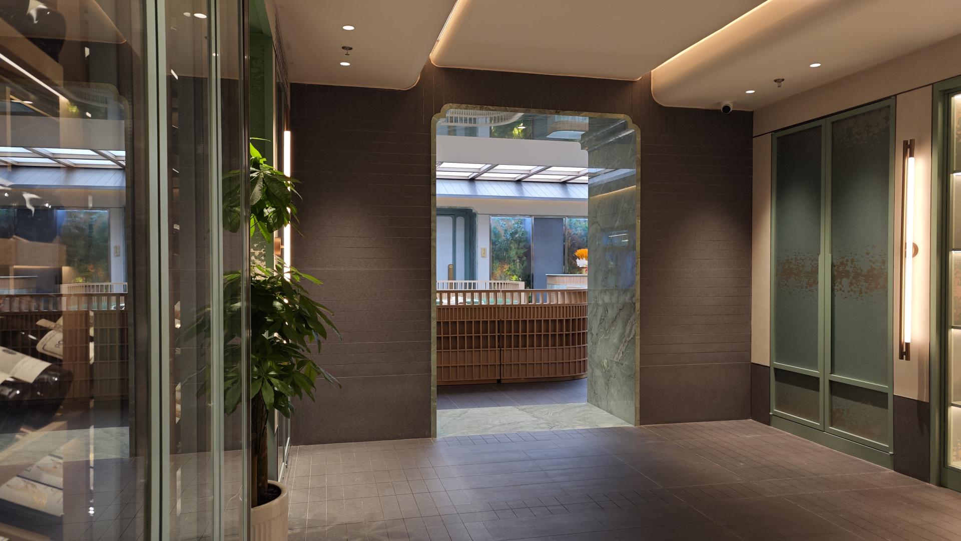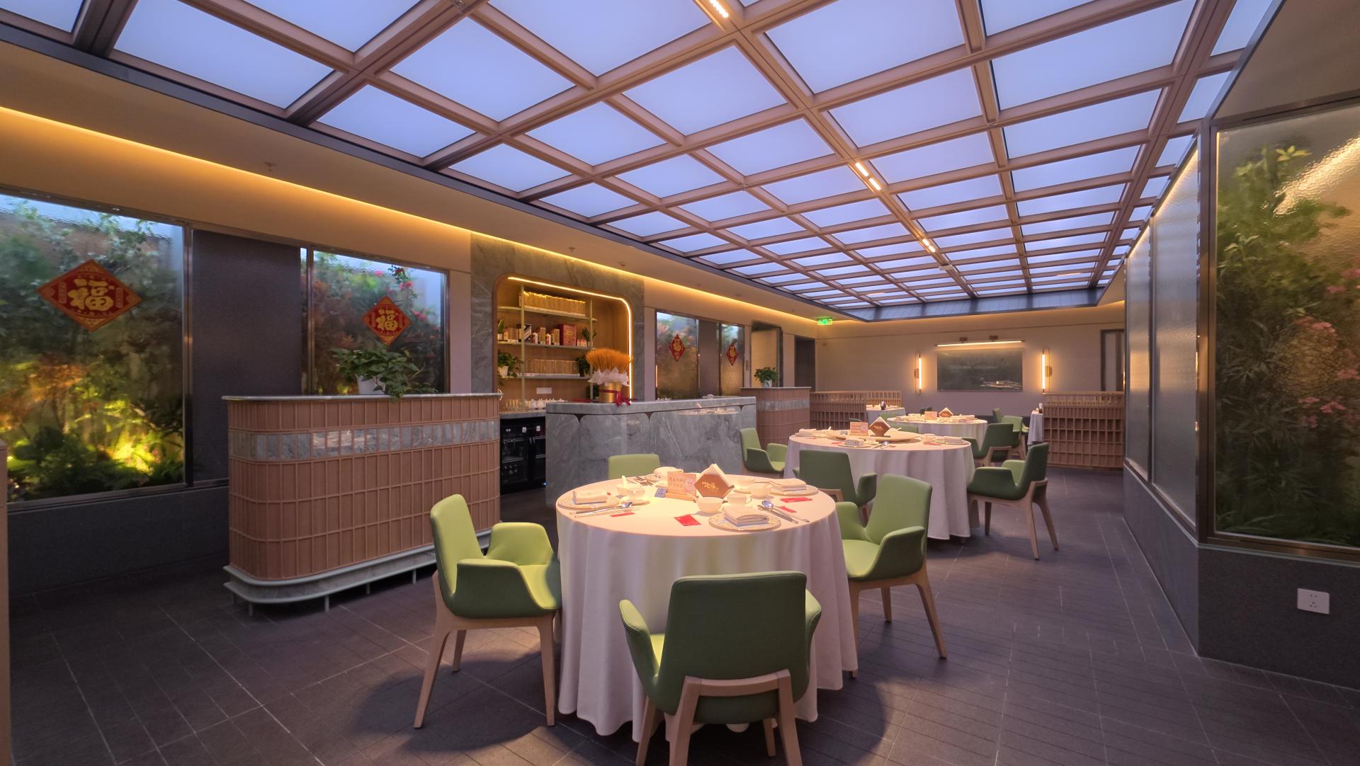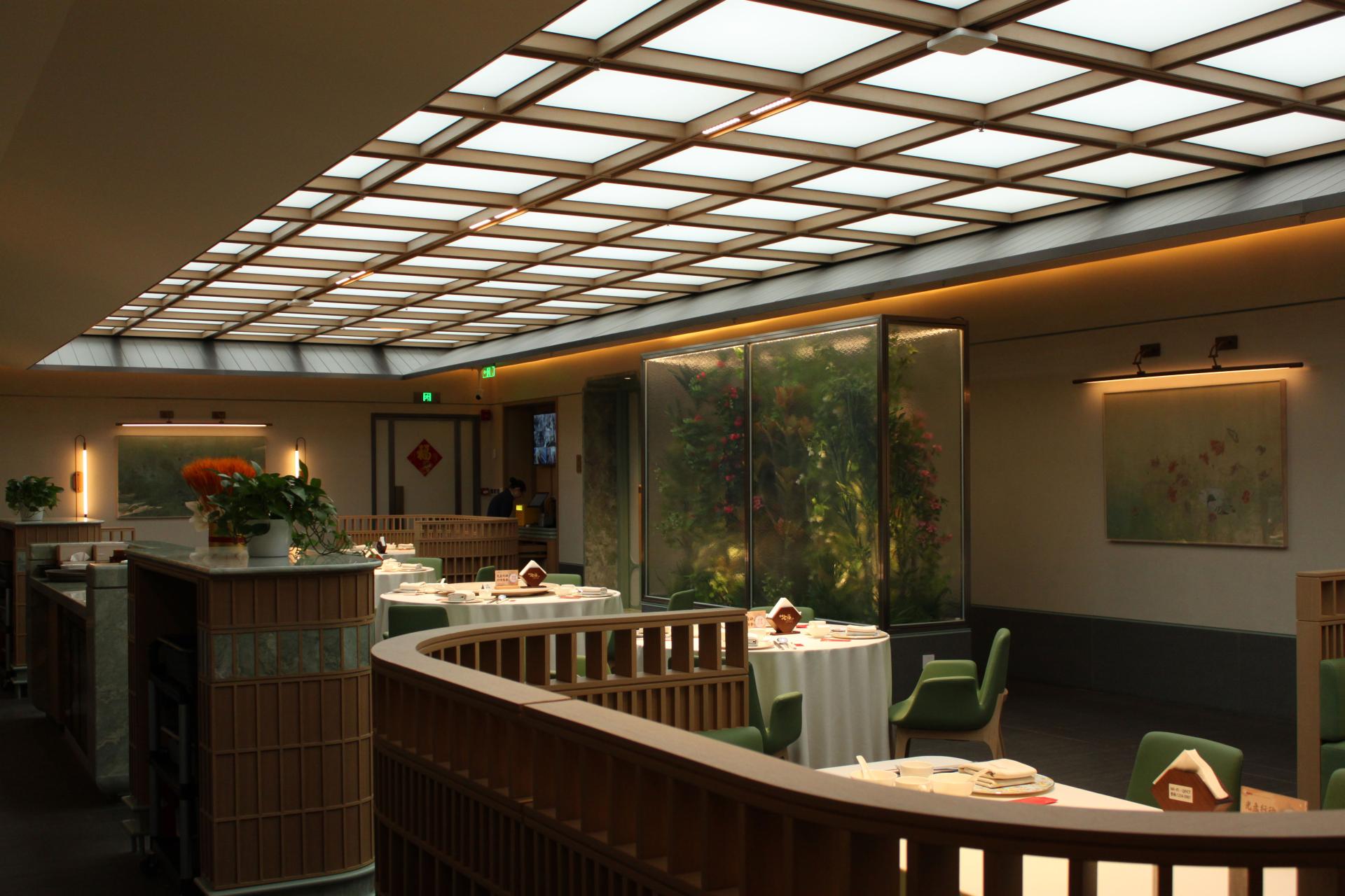 In the restaurant’s courtyard seating area, the ceiling lighting dynamically adjusts in brightness and color temperature to mirror the shifting hues of natural daylight throughout the day.
