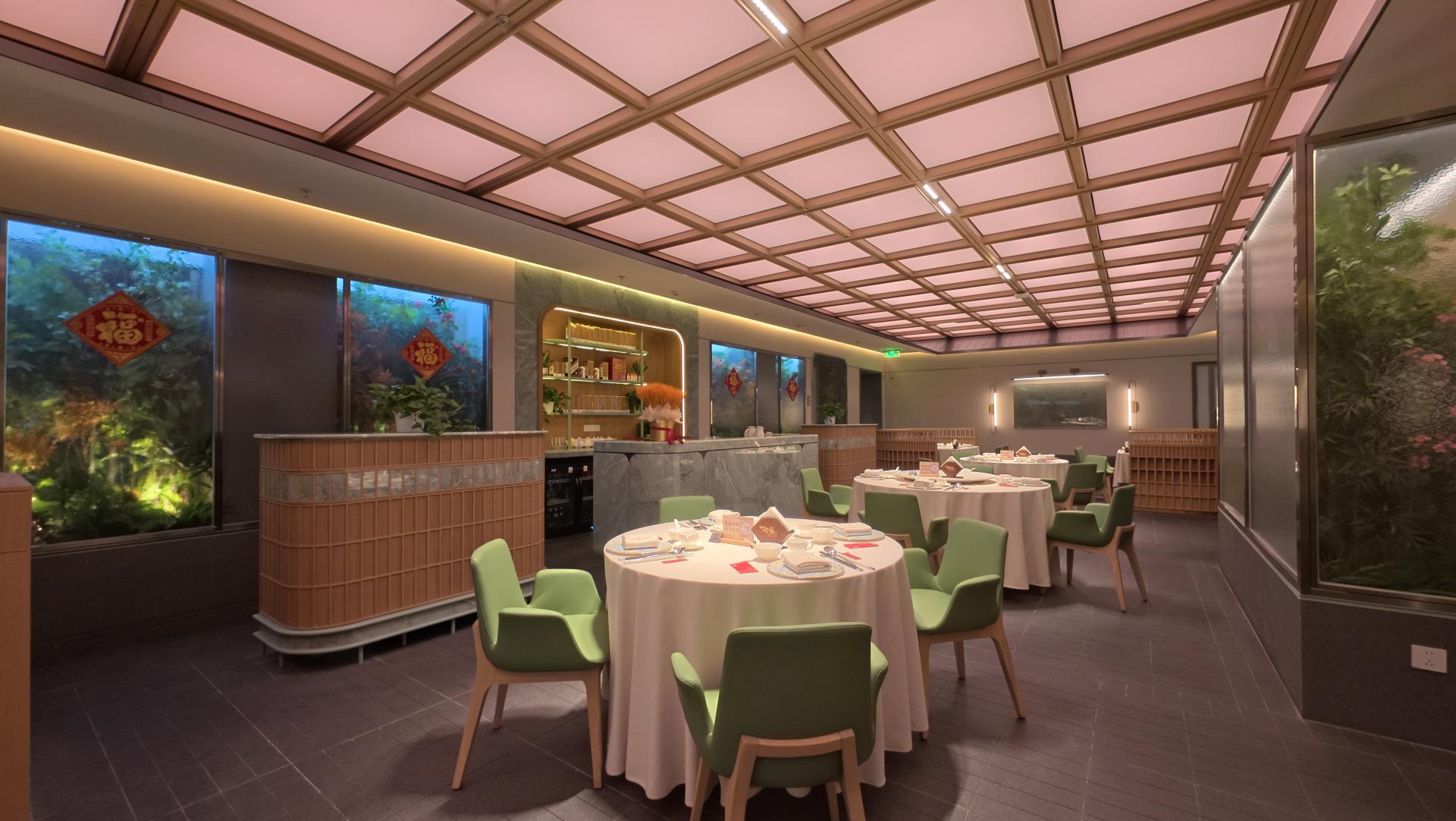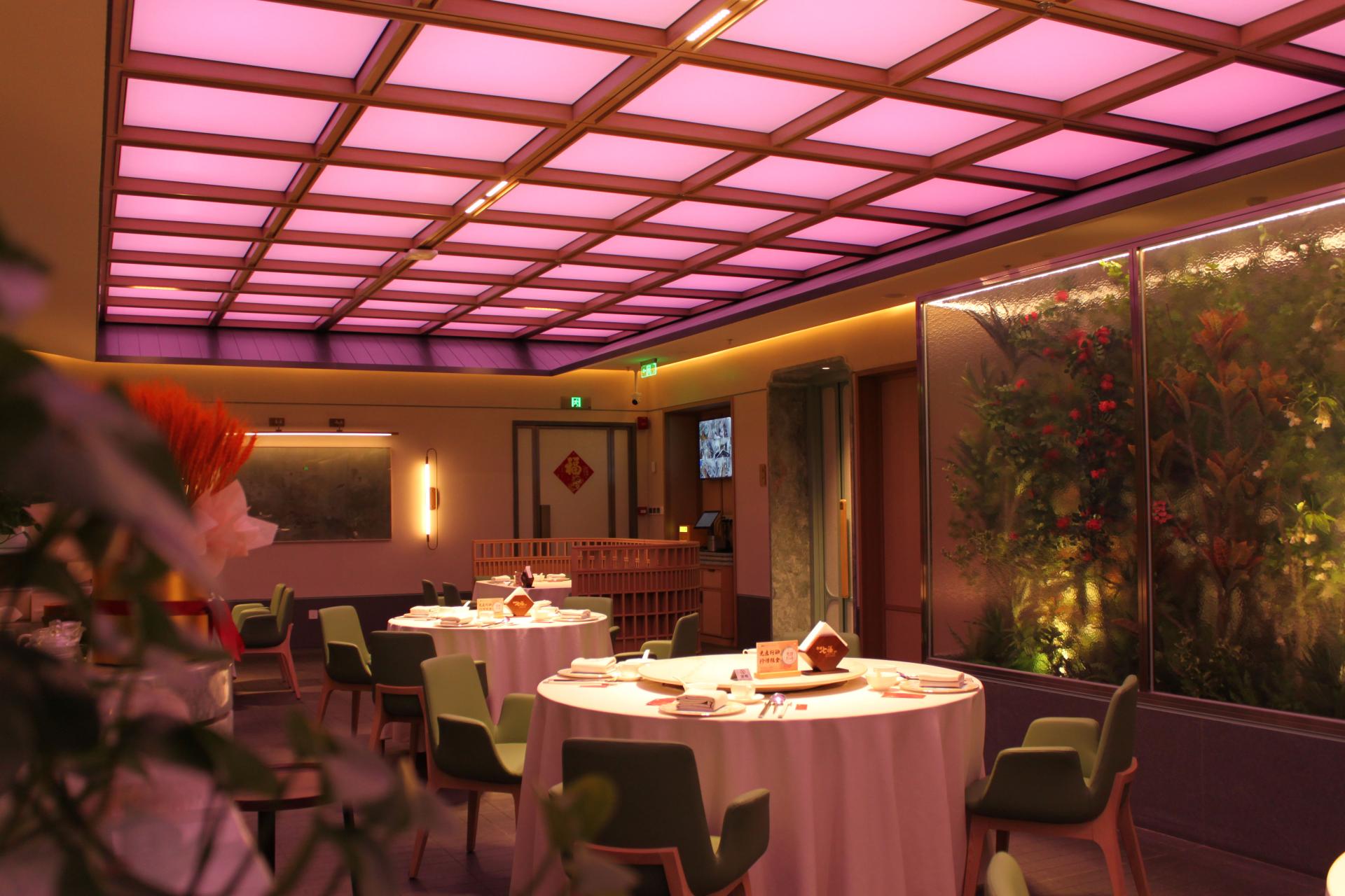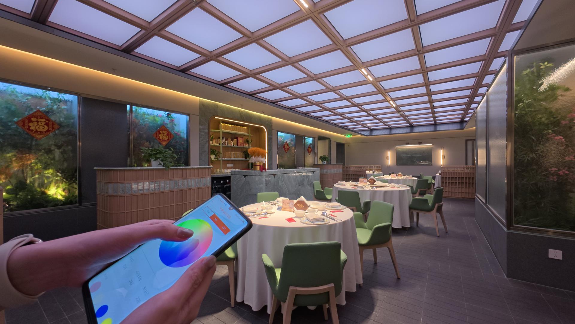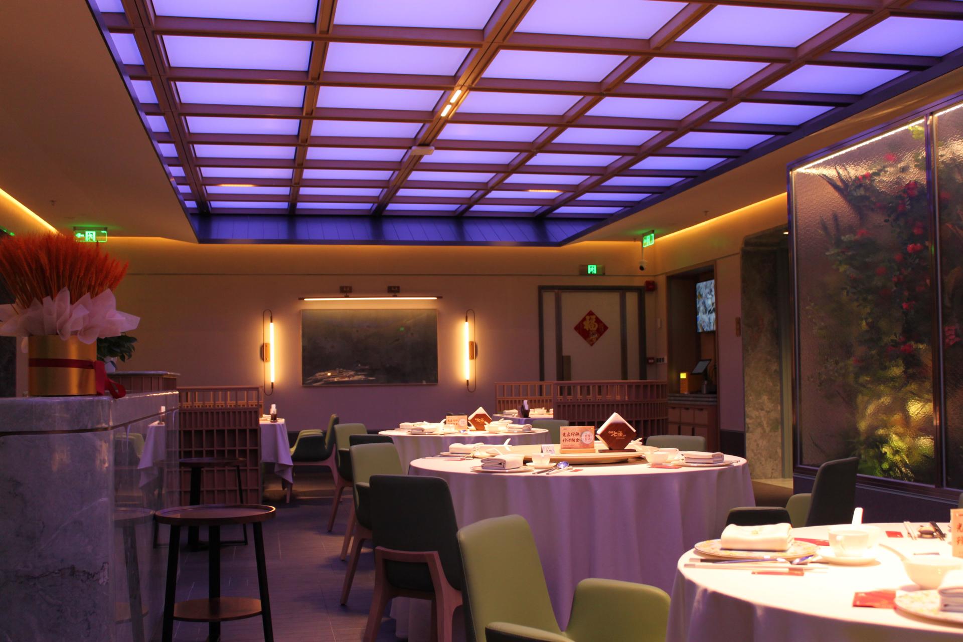 In addition to simulating natural sunlight scenes, the ceiling lights of the restaurant also have a flexible customization function. Whether for an intimate birthday party or a festive Spring Festival celebration, the lighting can be tailored to create a unique atmosphere that matches the theme of the event. After the event, with just a single press of a button, the system can swiftly revert to the regular daylight mode.