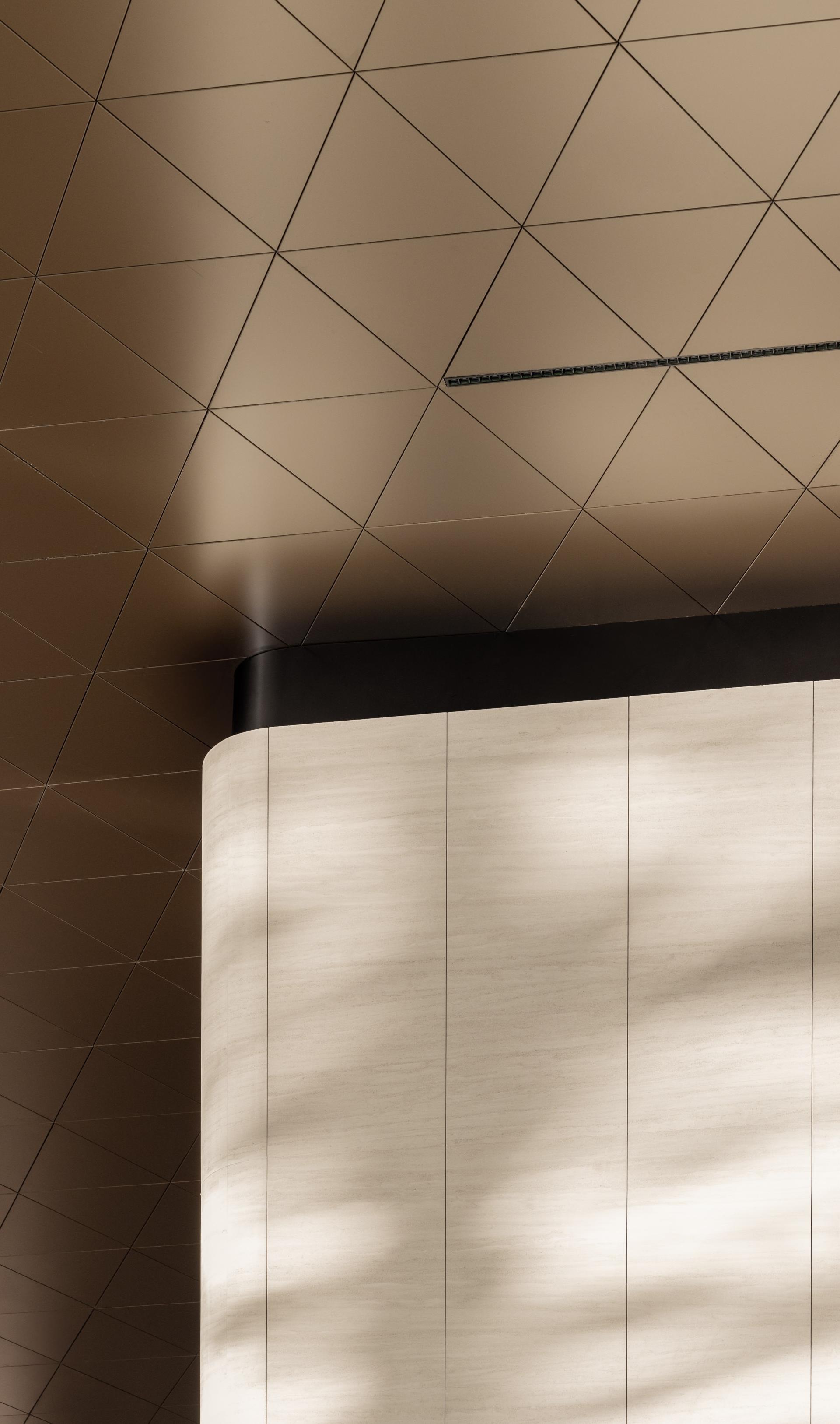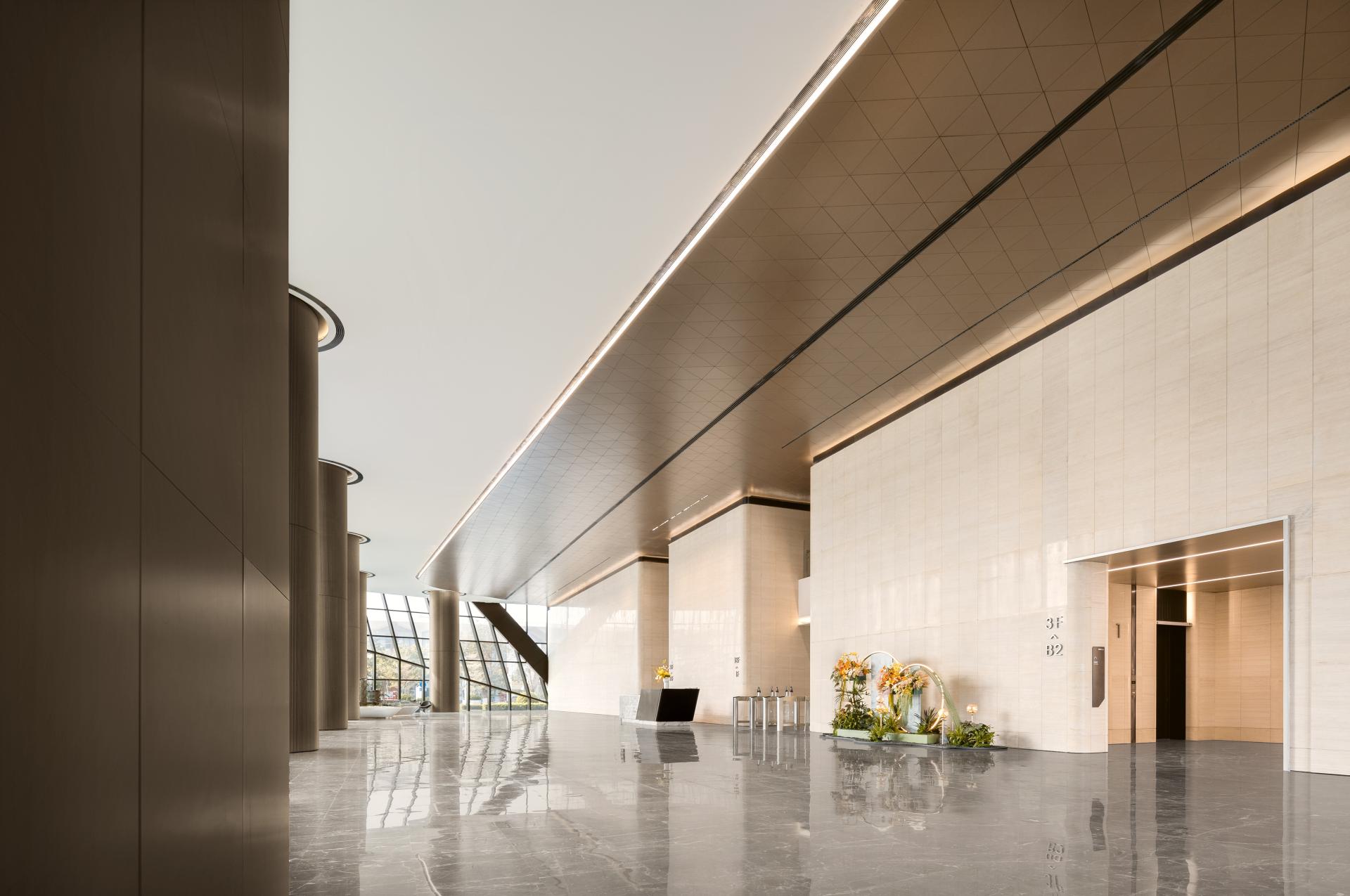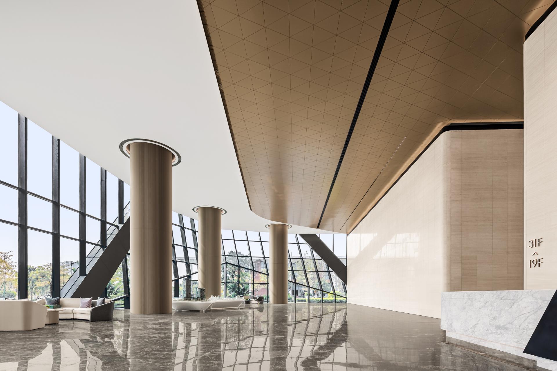The project highlights a "dual-tower + diamond-shaped façade" design, extending the geometric cutting language of the building's exterior to the interior. Adopting a unique structuralist style, the project constructs a solid yet artistic building appearance through the clever combination of lines and geometric shapes. The interior space continues this design philosophy, with streamlined metal lines on the ceilings and walls, and staggered stone finishes that echo the diamond cuts and symbolic lines of the exterior façade, creating a visual continuity between the inside and outside. The office area adopts an off-center core structure layout, freeing up a column-free open office space that maximizes a 270° panoramic river view. The bold lines of the building's exterior complement the soft atmosphere of the interior space, jointly creating a modern yet cozy business environment.