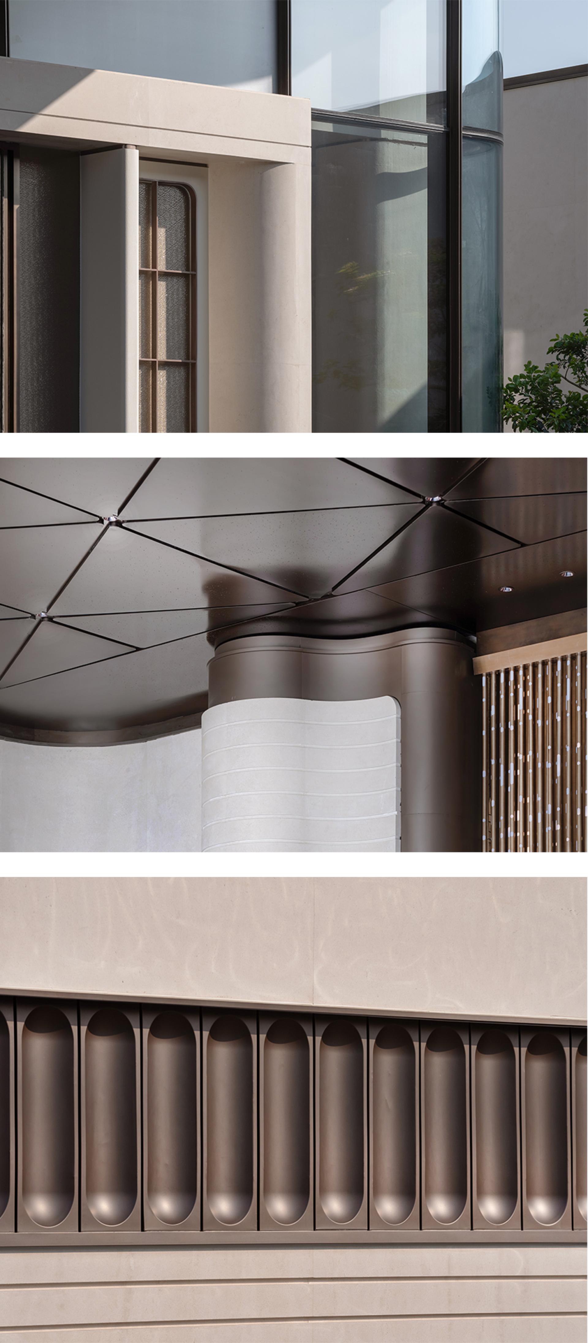 The façade of the Jinhai Tingyuntai stands as a striking visual centerpiece. Clad in Portuguese beige stone, the exterior walls radiate a warm, refined texture, imparting a noble and elegant character to the structure. The roofline is accentuated with copper-simulated aluminum panels, their metallic sheen infusing a contemporary technological flair. This bold material contrast achieves a harmonious unity, while the façade’s integration of Art Deco’s signature vertical lines and geometric patterns creates a dynamic interplay of depth and dimensionality under sunlight.