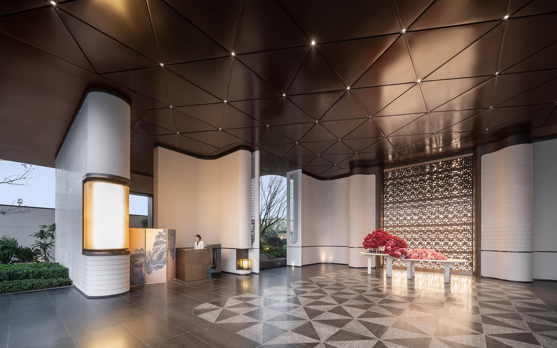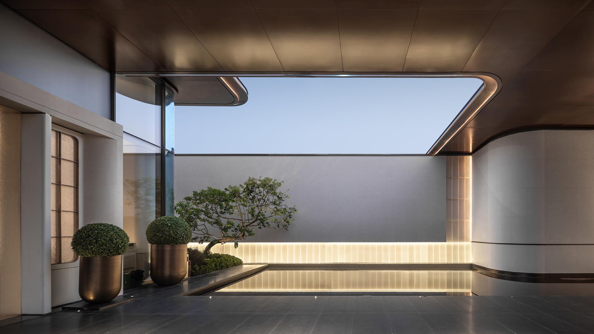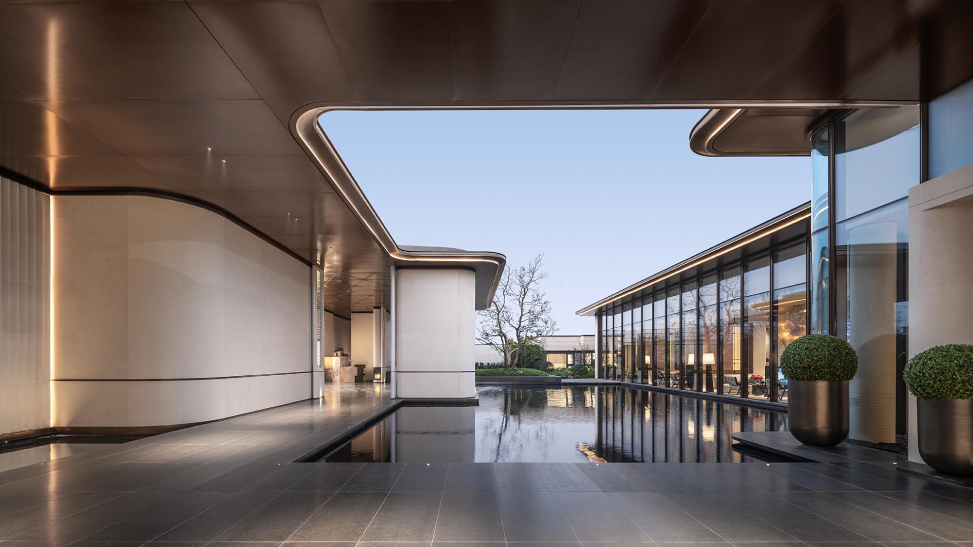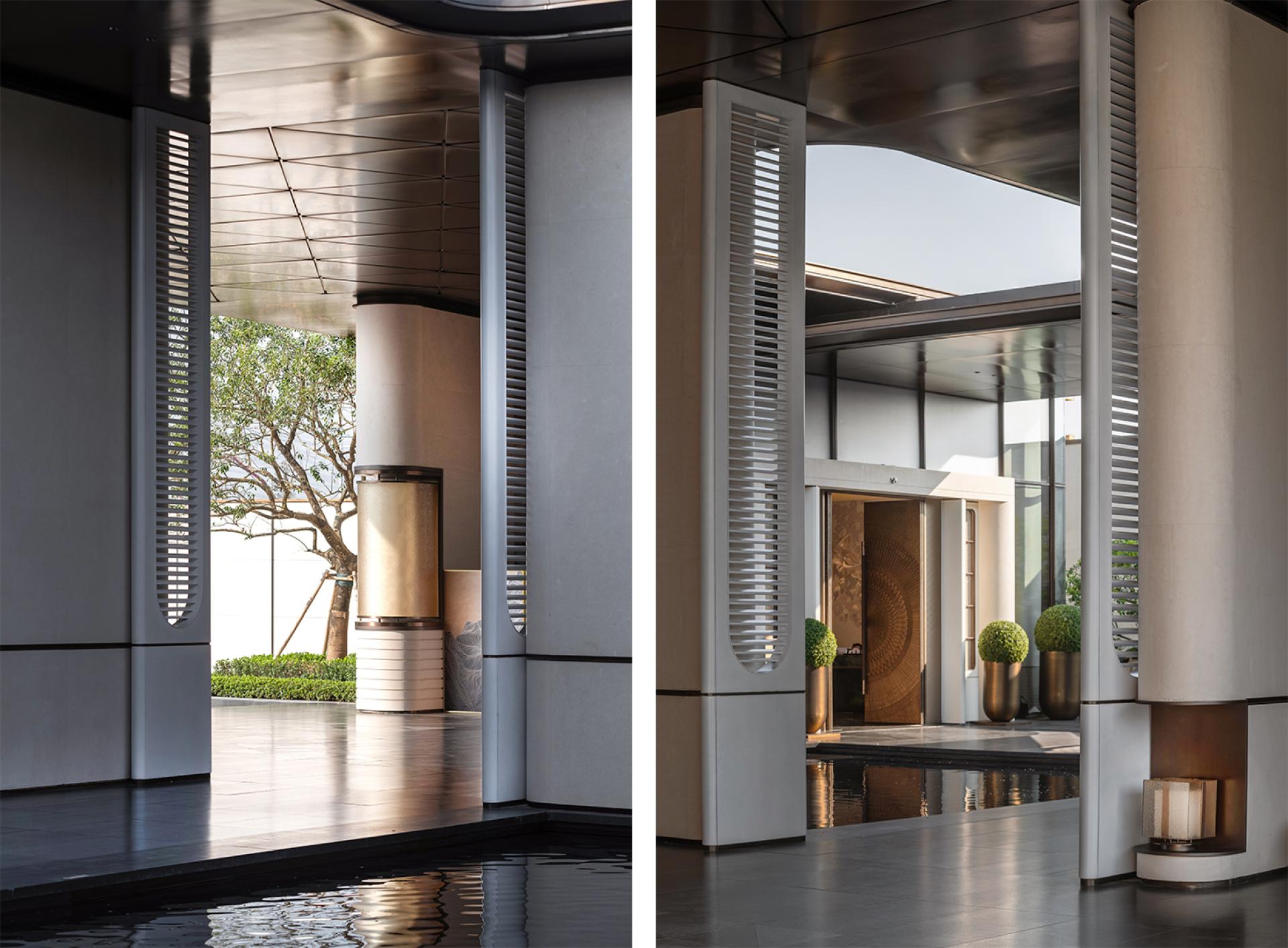 The entrance design is equally captivating. Spanning a 50-meter interface, it evokes an urban curtain wall, greeting visitors with an imposing sense of grandeur. The canopy features symmetrical carvings inspired by Haipai style, with modern minimalist lines woven into the details, striking a balance between historical gravitas and contemporary lightness. A water feature corridor extends from the entrance inward, its reflective surface mirroring the building’s silhouette and cultivating a serene, profound atmosphere. This entrance not only elevates the project’s ceremonial presence but also delivers a distinctive first impression through a fusion of visual splendor and sensory immersion.
