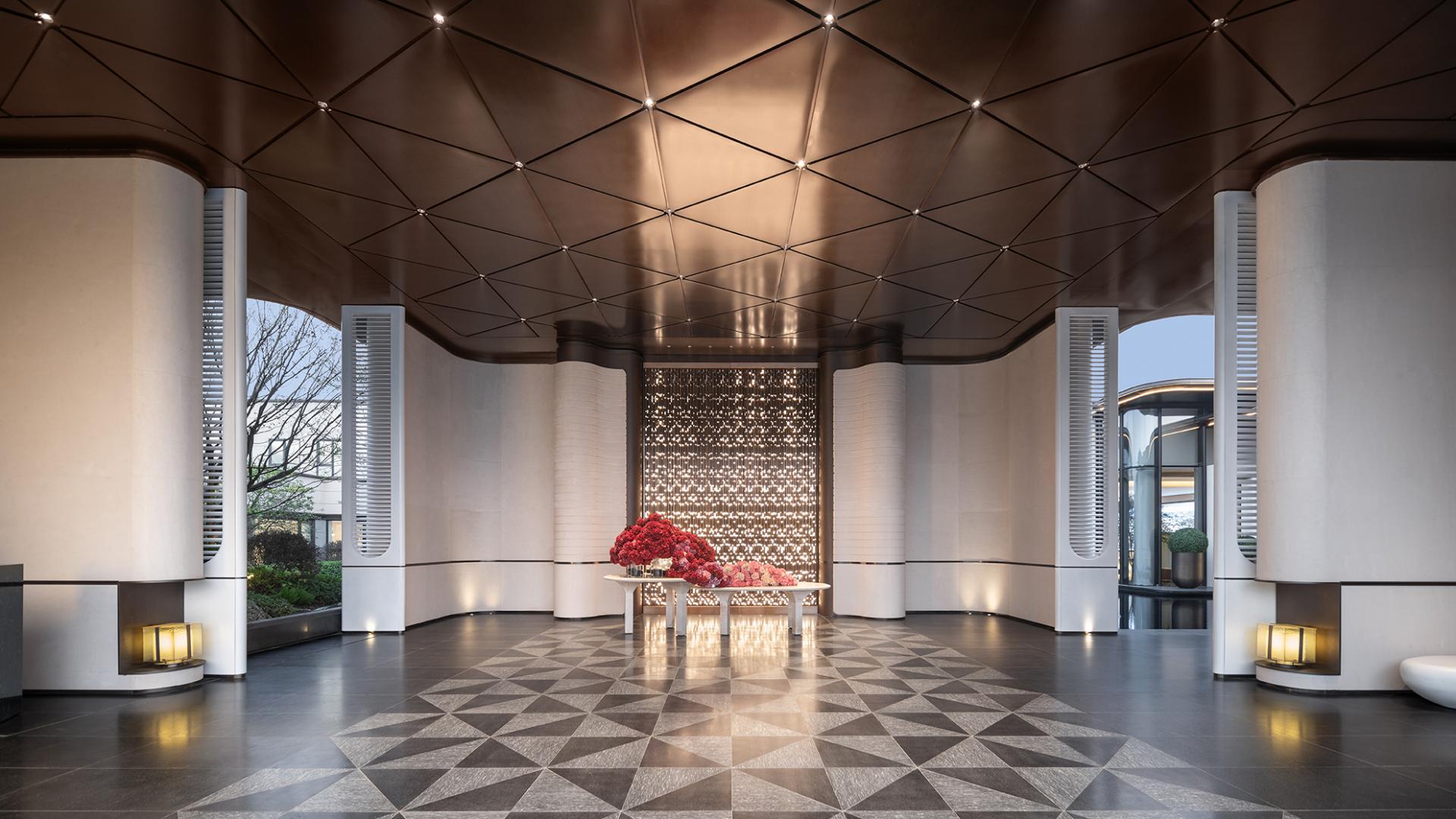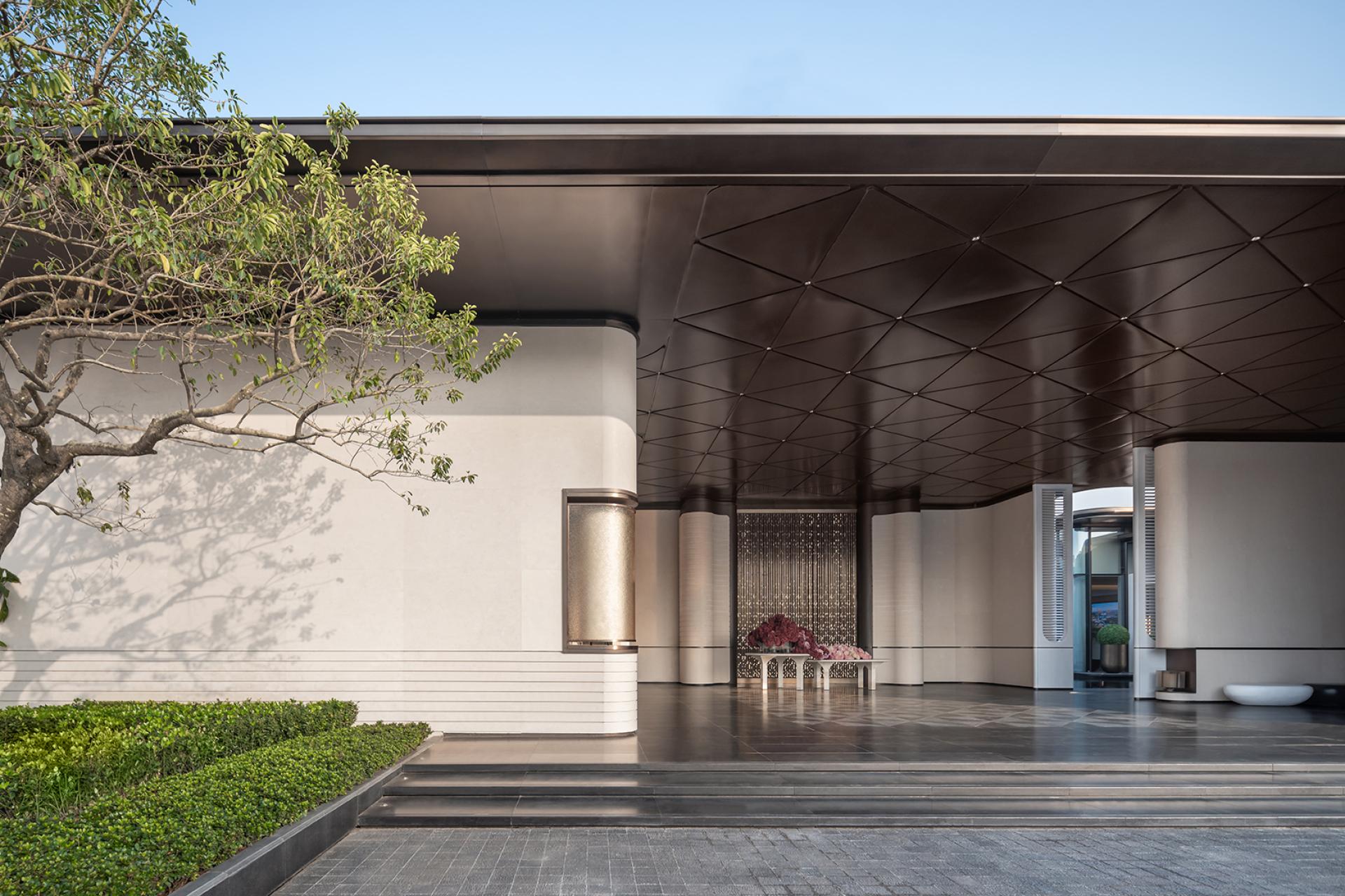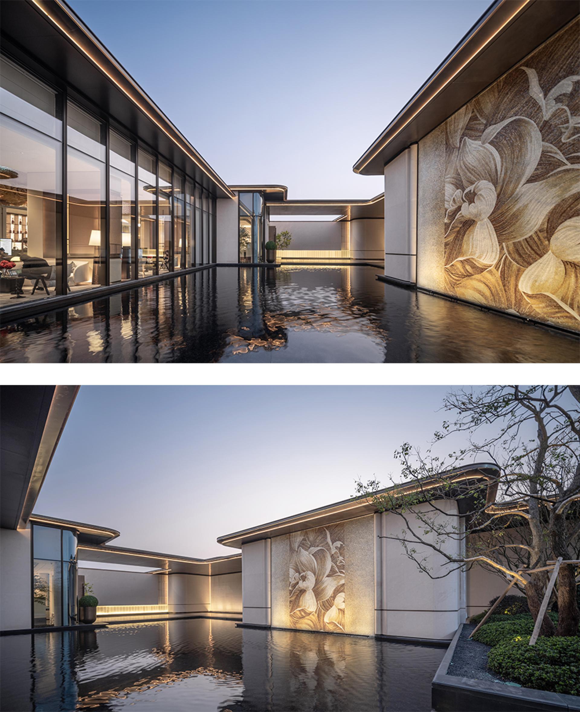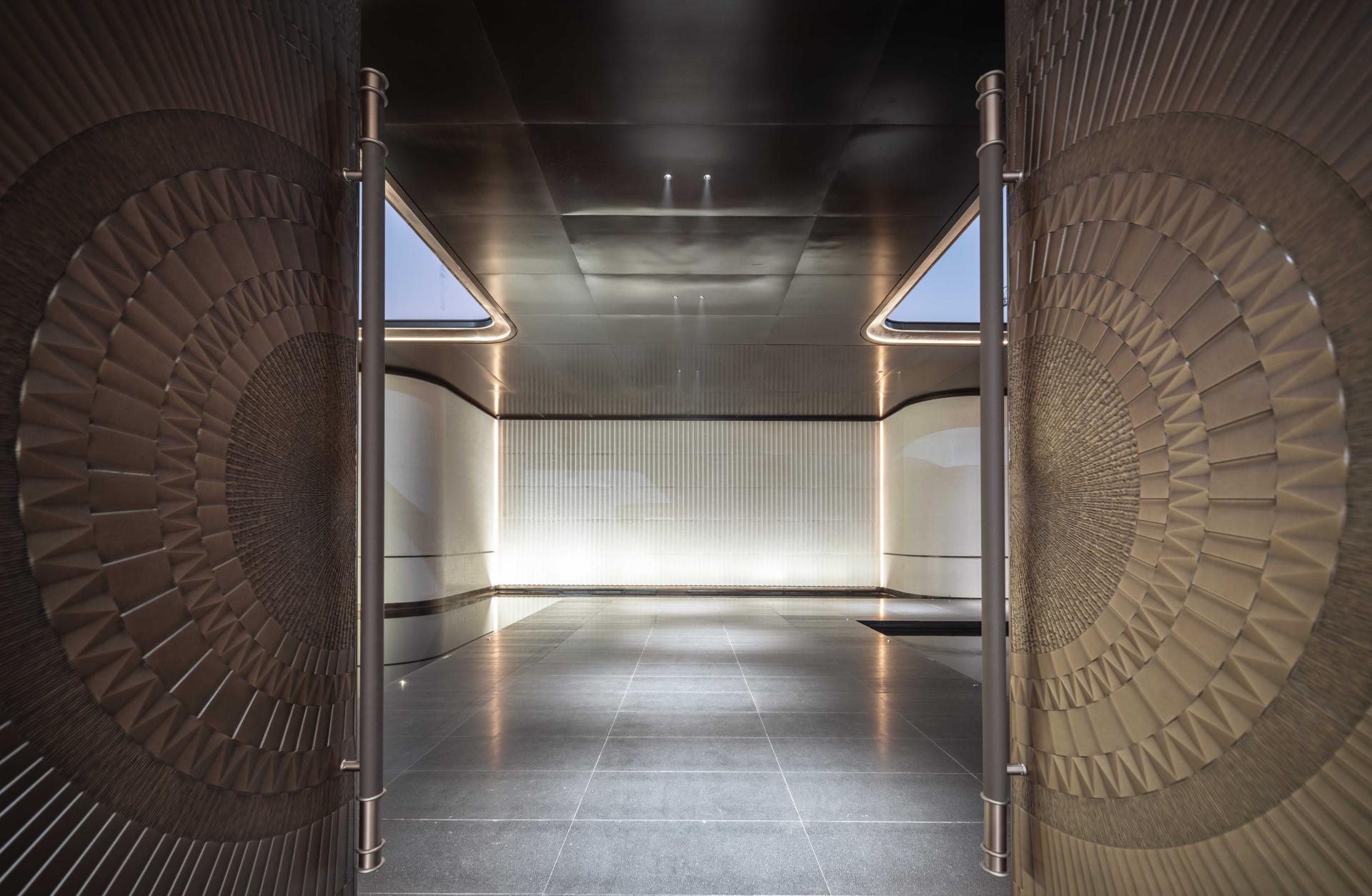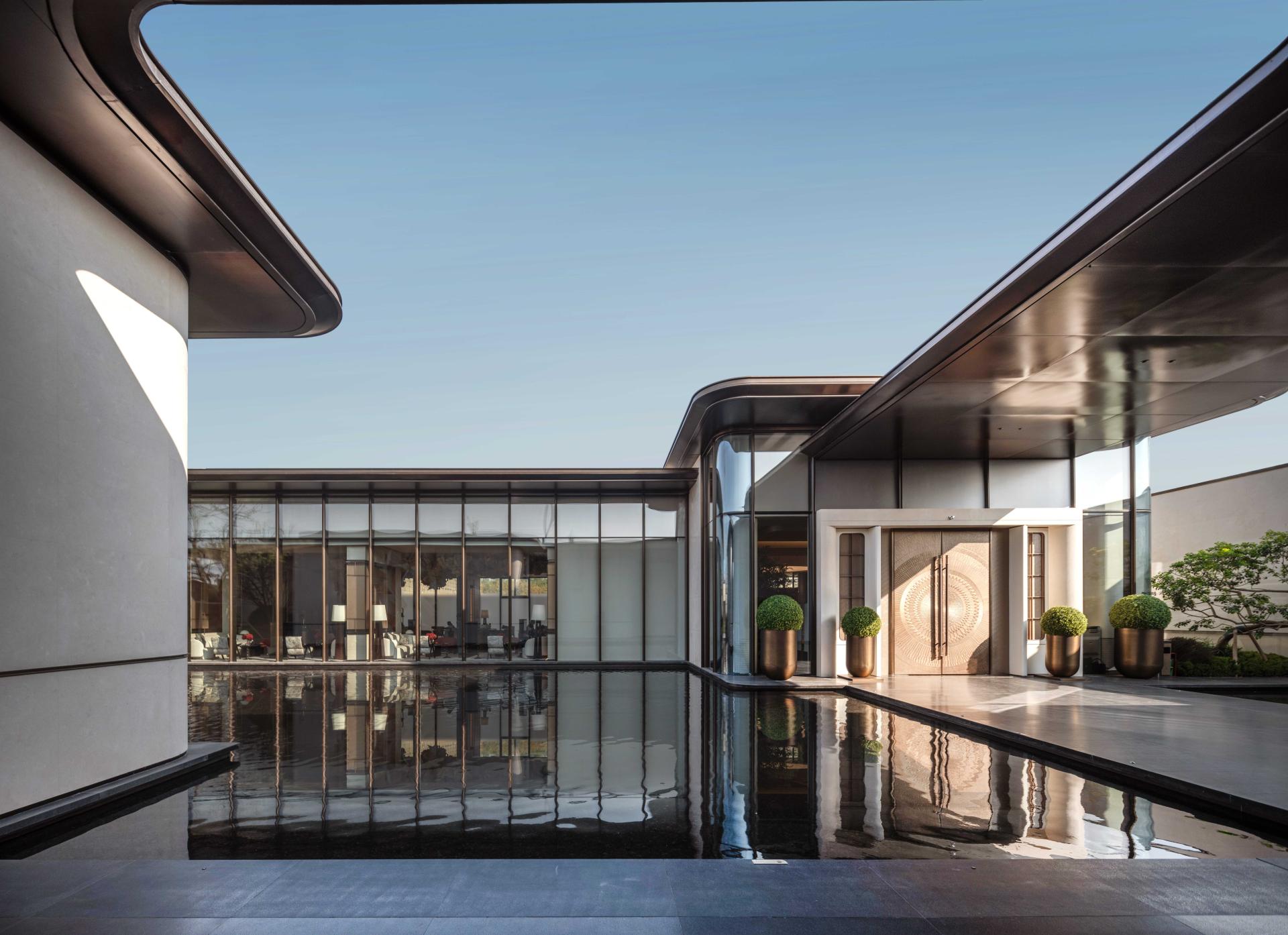 The entrance design is equally captivating. Spanning a 50-meter interface, it evokes an urban curtain wall, greeting visitors with an imposing sense of grandeur. The canopy features symmetrical carvings inspired by Haipai style, with modern minimalist lines woven into the details, striking a balance between historical gravitas and contemporary lightness. A water feature corridor extends from the entrance inward, its reflective surface mirroring the building’s silhouette and cultivating a serene, profound atmosphere. This entrance not only elevates the project’s ceremonial presence but also delivers a distinctive first impression through a fusion of visual splendor and sensory immersion.