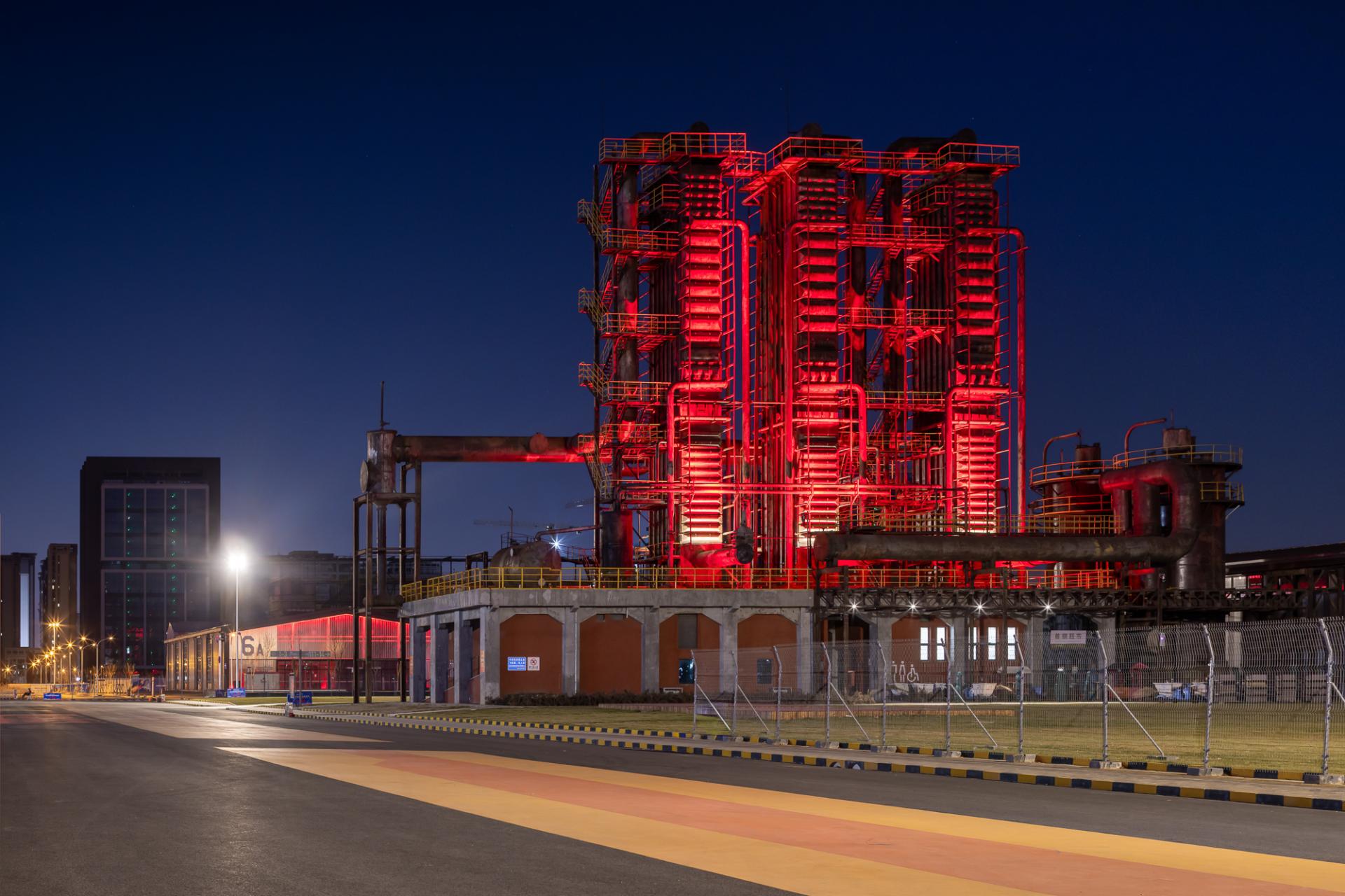 The lighting zeroes in on the old - equipment part all the way down to the eaves of the new construction. The rest of the place has a normal color temperature, just like modern buildings. The rusty iron - sheet eaves at the base are lit up by hidden, downward - facing linear lights. And the functional lights on the ladders? They totally break up that big, bold red color that dominates the place.