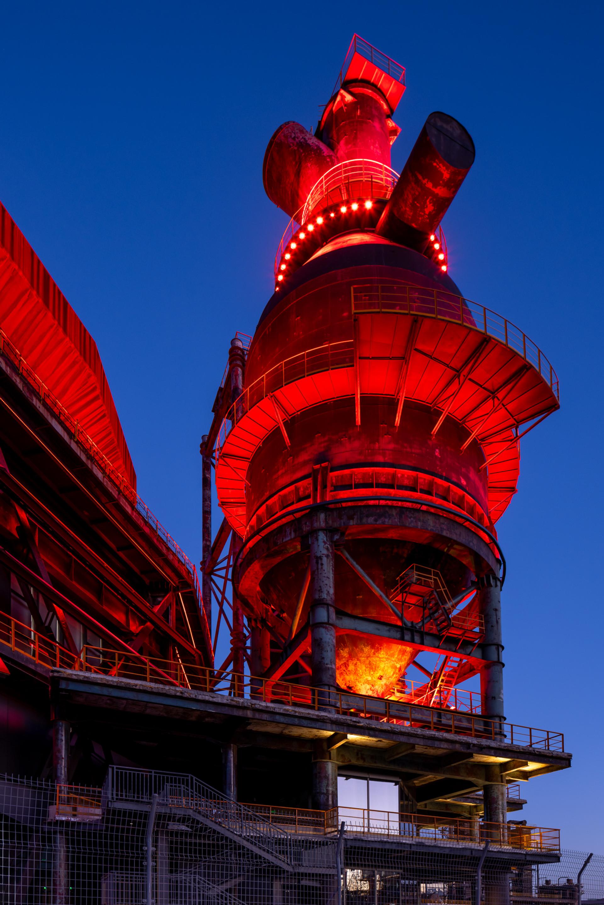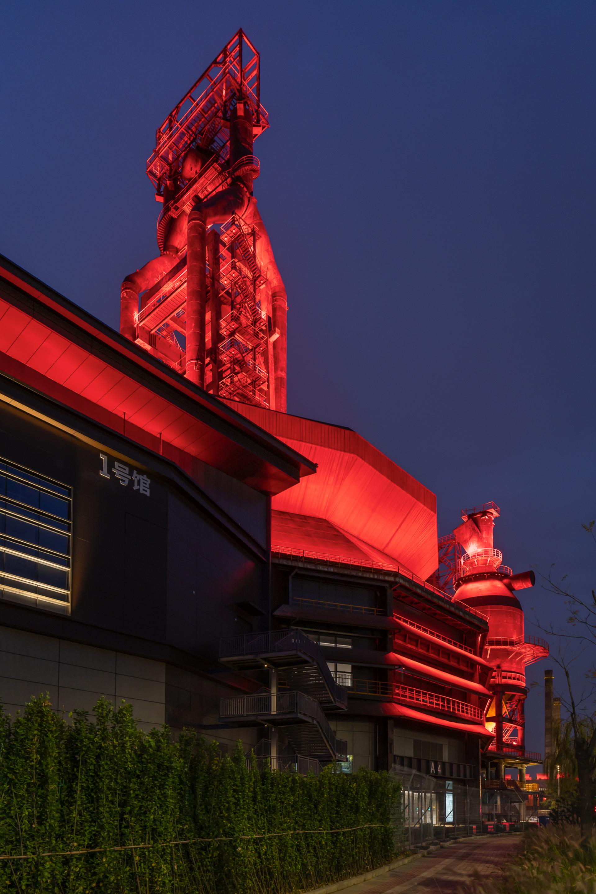 Our lighting design is on the same wavelength as the color schemes of other blast furnaces in the park. We've thrown in some really cool ignition - style scenes. When you're down on the street, it seriously feels like there's a flame cranking up the heat in the furnace. Up at the top, we installed a ring of lights that shine downward, mimicking the heating effect. For that tough - as - nails furnace frame, we light it up level by level from an internal suspension setup to really show off its structural muscle.