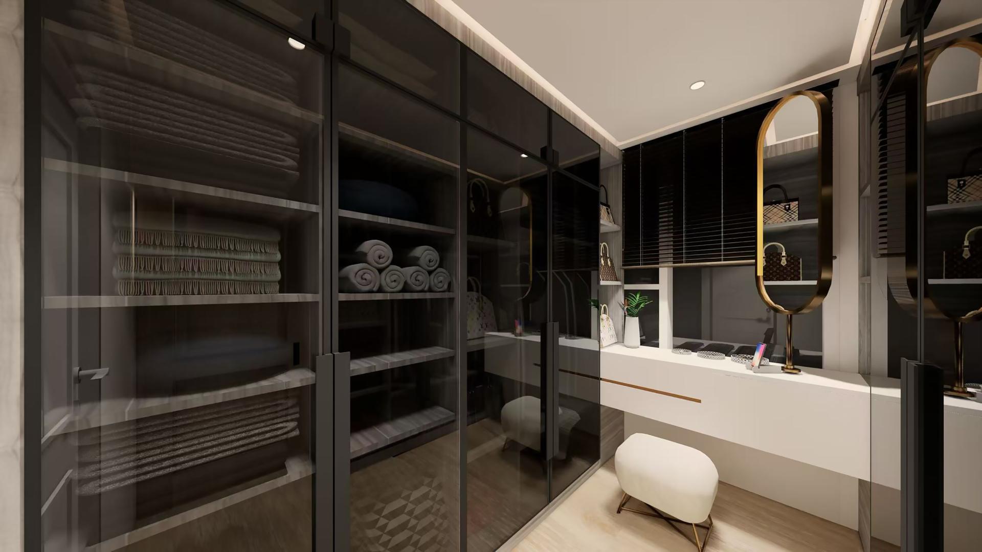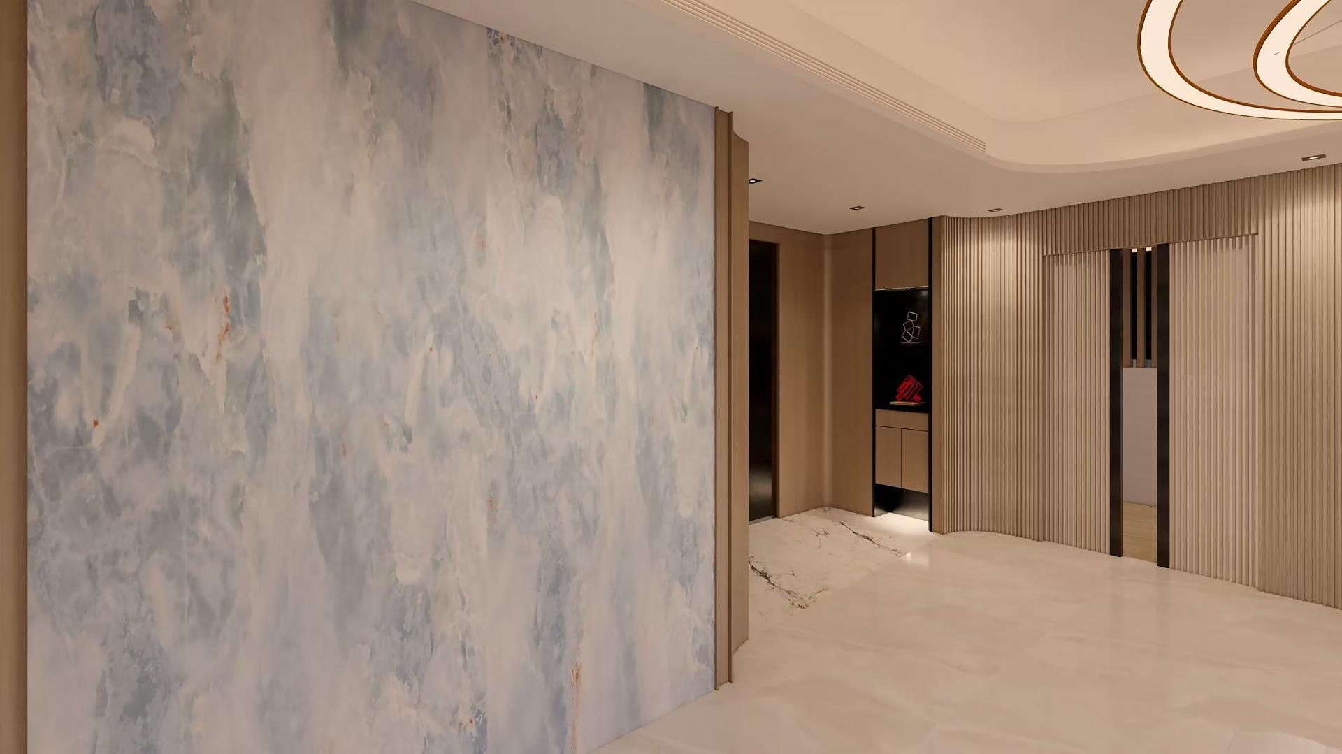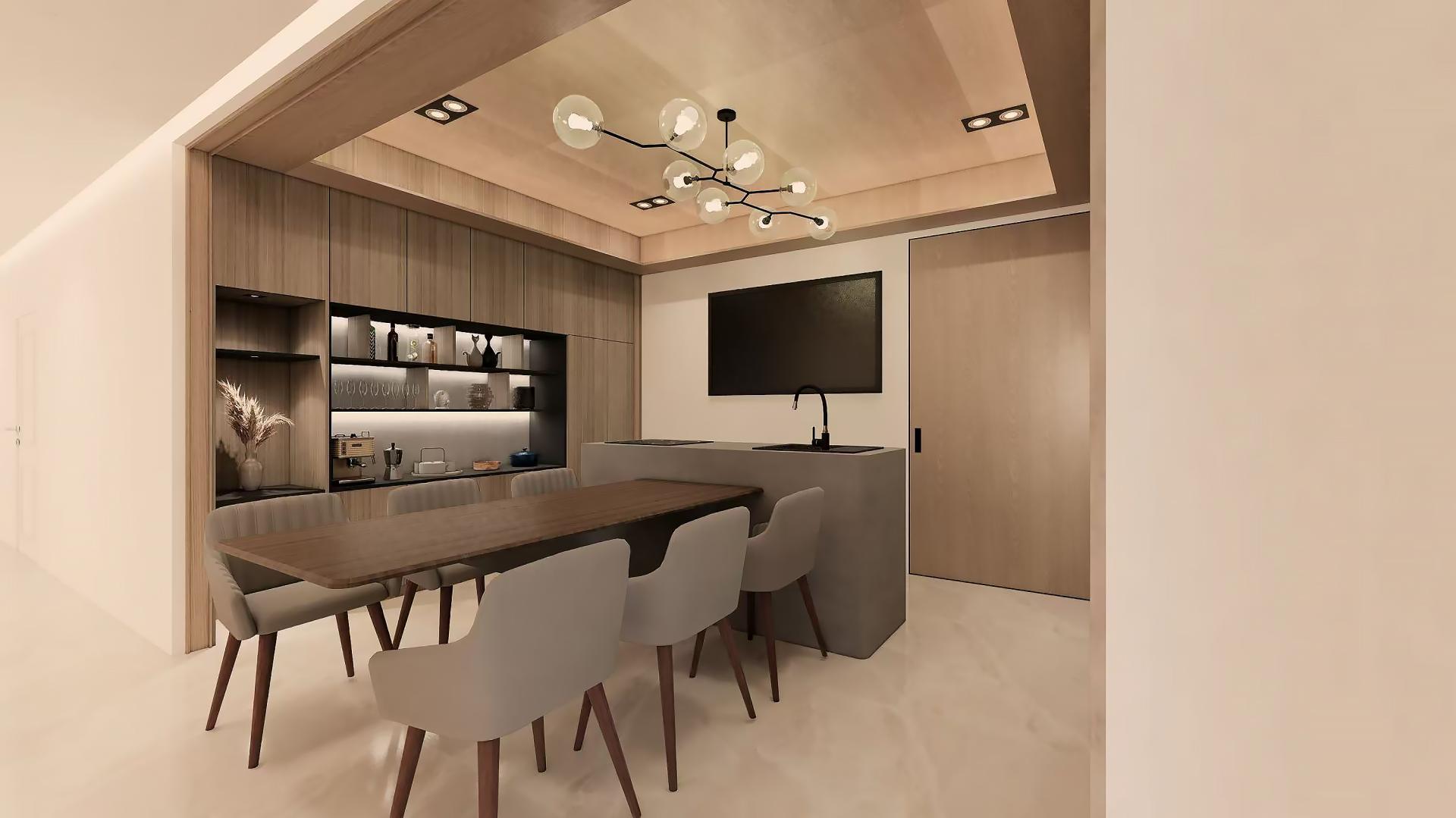 Materiality plays a crucial role in this design, meticulously selected to evoke warmth and sophistication. Brushed solid wood veneer introduces an organic touch, grounding the space with its natural grain and texture, while Spanish large-format tiles extend across the flooring, lending a refined and expansive visual appeal. These materials, combined with a delicate lacquer finish, create a harmonious contrast—soft, warm, and enduring. The thoughtful layering of these elements ensures not only an aesthetically compelling space but also a highly functional and sustainable living environment.
