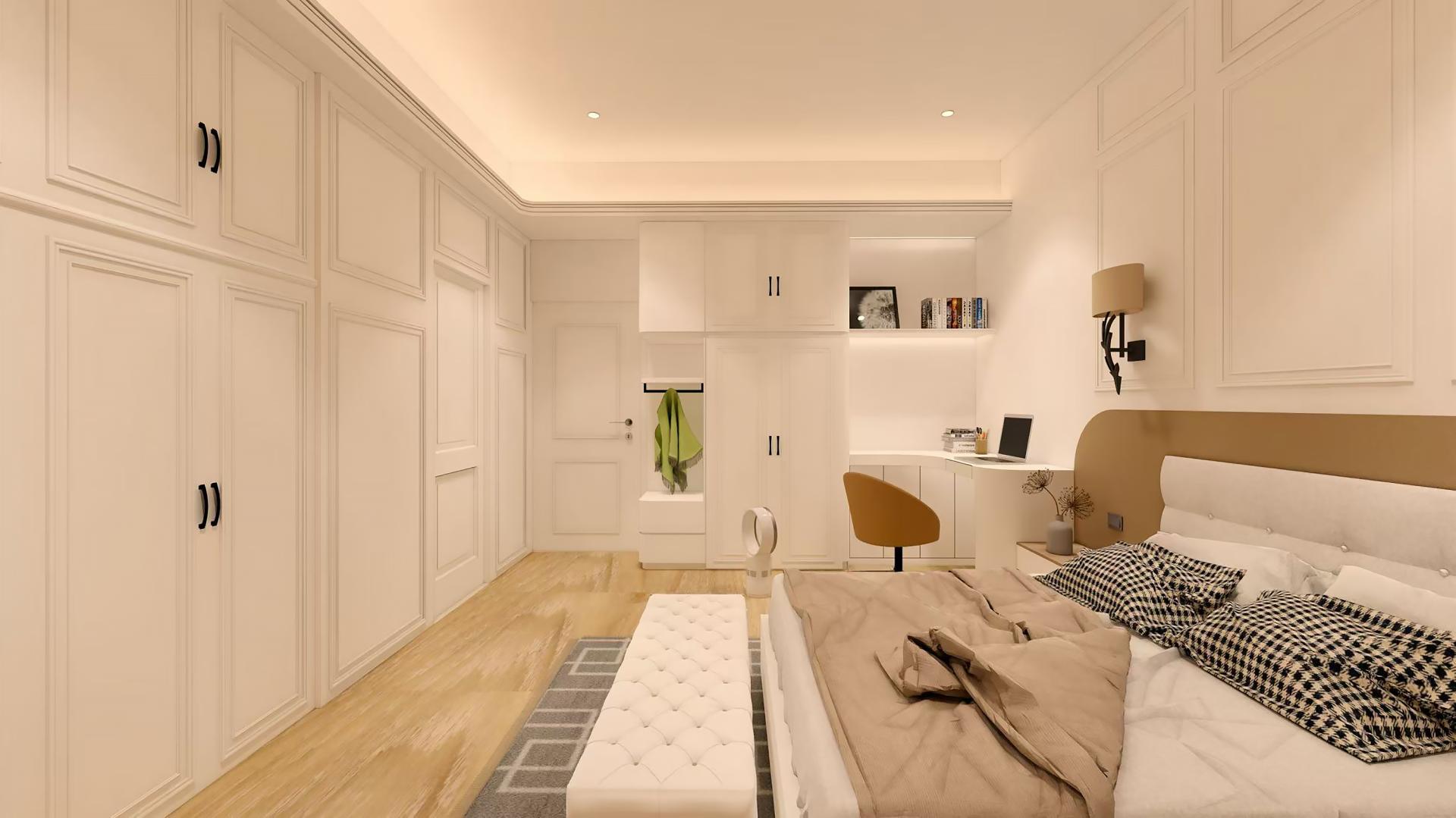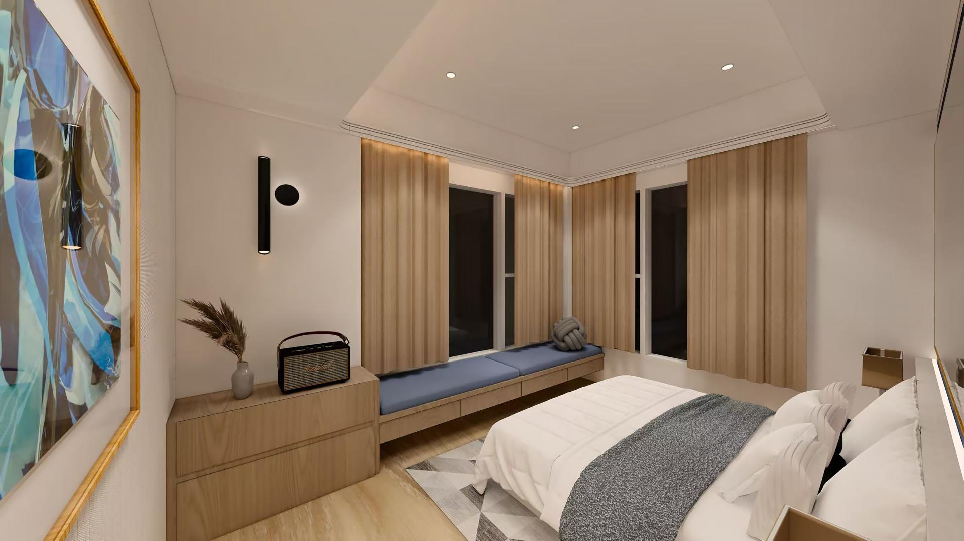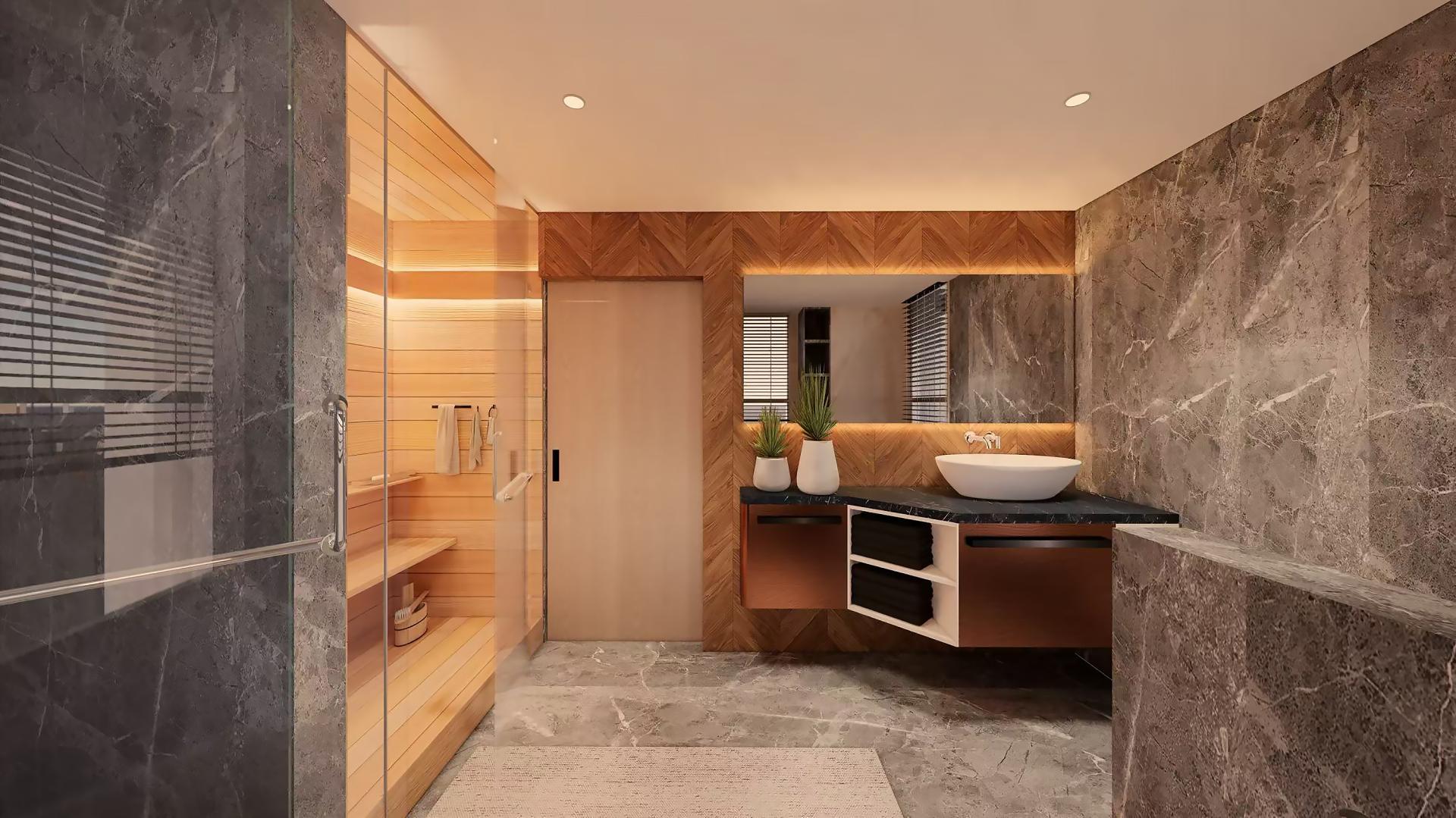 Materiality plays a crucial role in this design, meticulously selected to evoke warmth and sophistication. Brushed solid wood veneer introduces an organic touch, grounding the space with its natural grain and texture, while Spanish large-format tiles extend across the flooring, lending a refined and expansive visual appeal. These materials, combined with a delicate lacquer finish, create a harmonious contrast—soft, warm, and enduring. The thoughtful layering of these elements ensures not only an aesthetically compelling space but also a highly functional and sustainable living environment.
