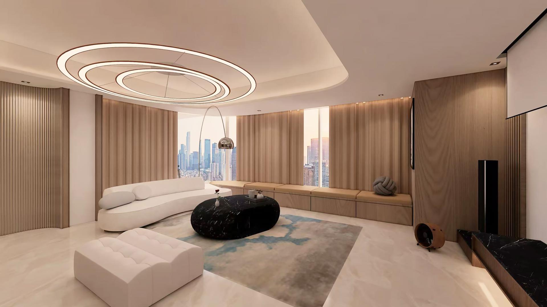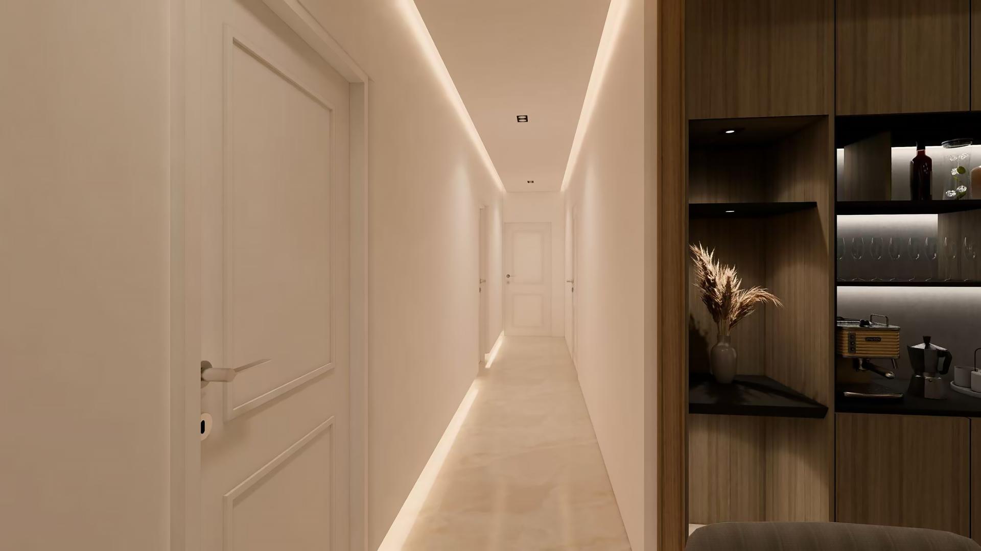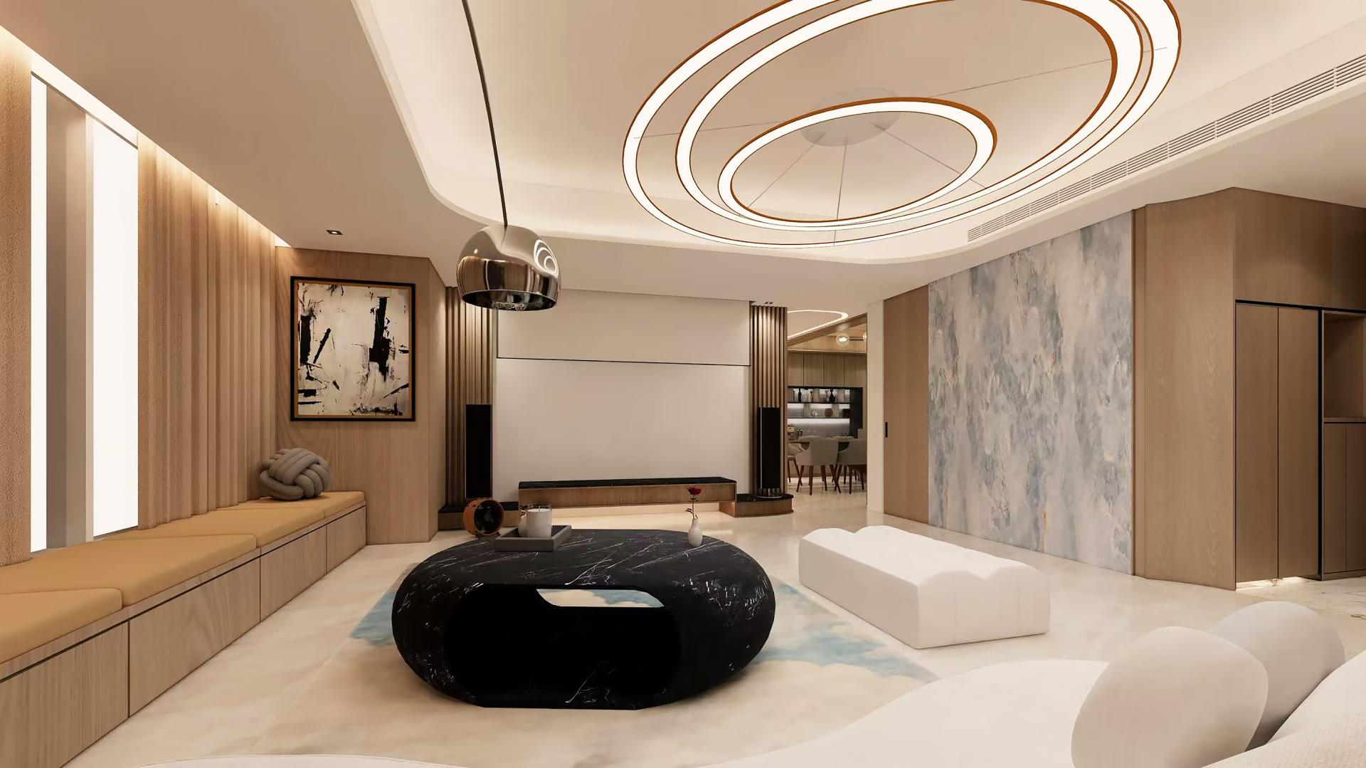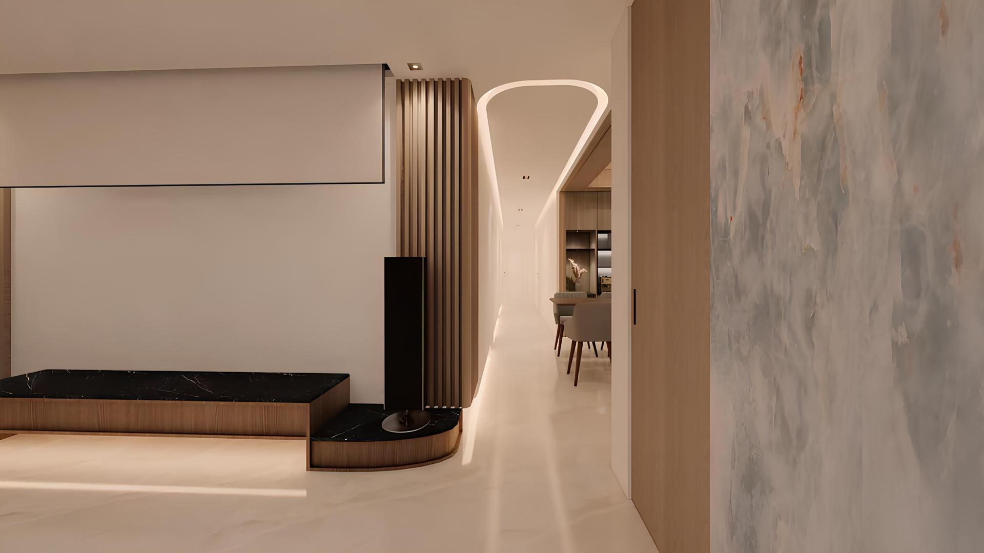 At the heart of the project lies an open and fluid spatial arrangement that fosters connectivity and effortless movement. Expansive sightlines eliminate visual barriers, allowing the interplay of natural light and shadow to enrich the ambiance. Subtle yet deliberate use of curved forms not only mitigates the heaviness of structural beams but also enhances the home’s rhythm, evoking a sense of tranquility and cohesion. The integration of rounded edges in walls and ceilings further dissolves harsh boundaries, creating a seamless transition between spaces and reinforcing an atmosphere of serenity.
