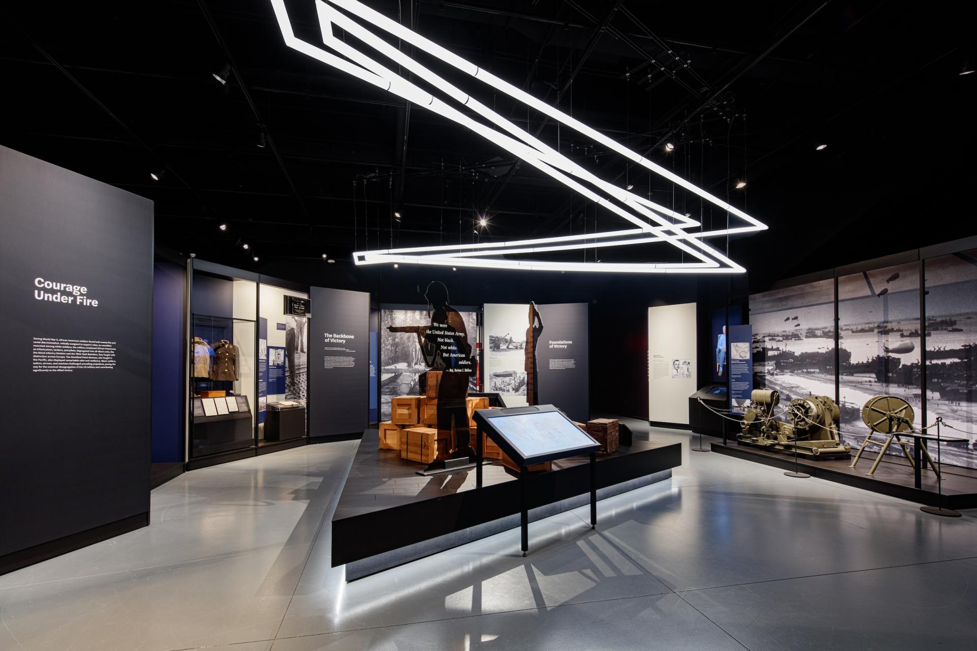 The notion of a “Double Victory” informed both the physical design and graphic direction of the exhibit, which can be seen through expressions of angles and shapes that refer back to the 1942 “Double Victory” campaign by Black service members. From a narrative perspective, the exhibition tackles an often under-told story of African American military experiences that is inherently complex and vast through an engaging, nuanced, and moving experience. This exhibition is based on the interplay of big ideas, such as freedom, service, and racism, and of personal stories and key events to paint a more comprehensive picture of the depth and breadth of African American military and socio-political lives.