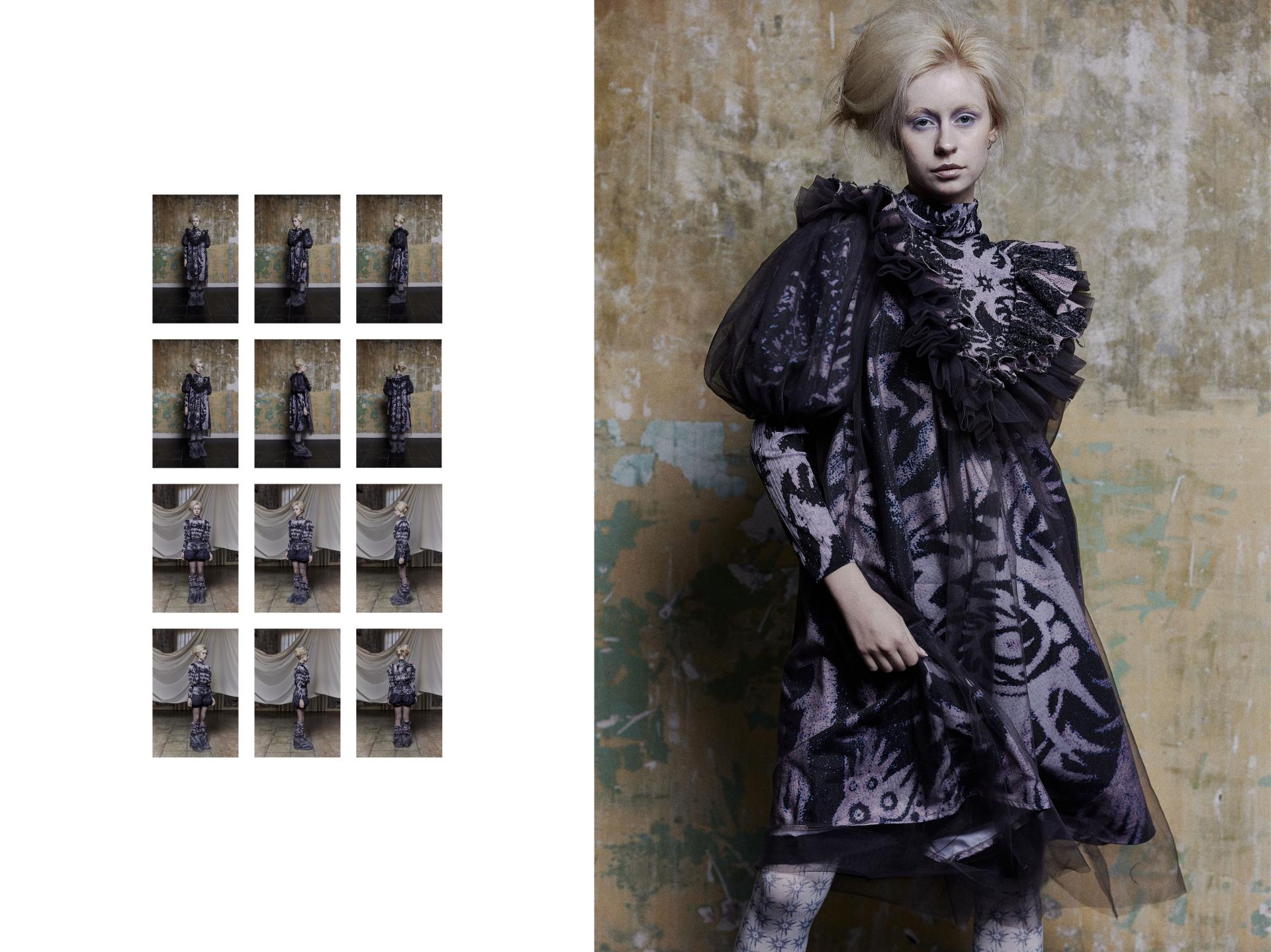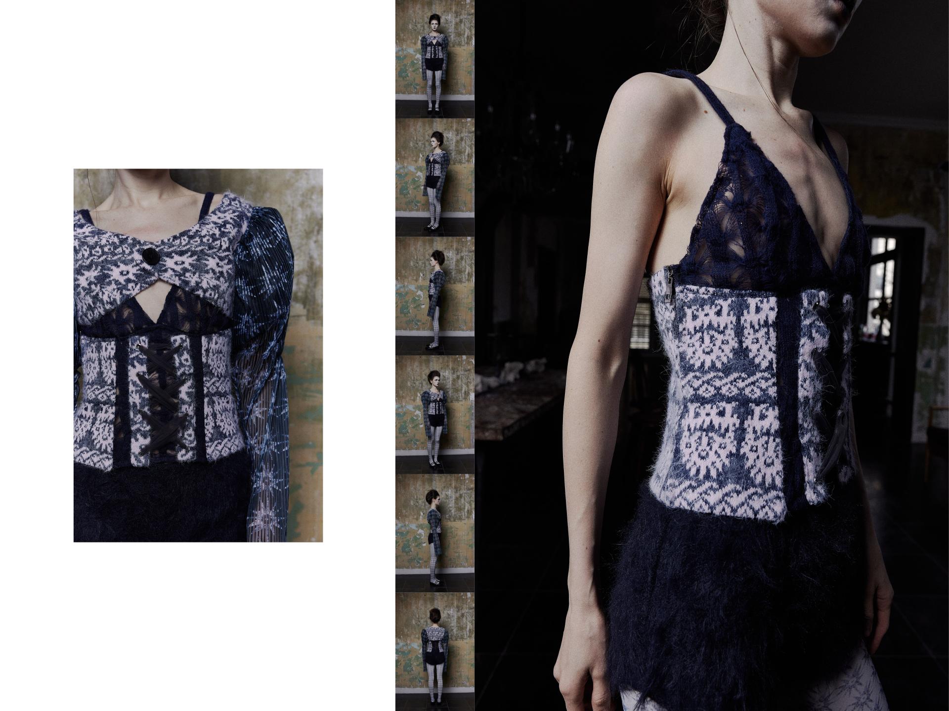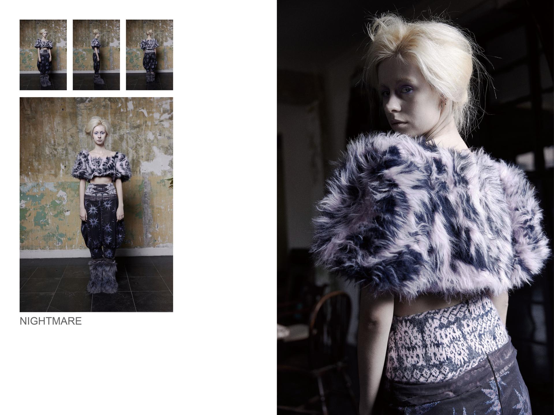 Nightmare is inspired by my fear of birds. The textile design focuses on individuals with niche phobias and psychological disorders. Through my personal experience of this fear, I express it artistically in the form of illustrations, which are then transformed into patterns and prints. These are combined with knitwear design to explore innovative visual presentations. For the yarn selection, I primarily used fluffy yarns to create a soothing, childlike texture.