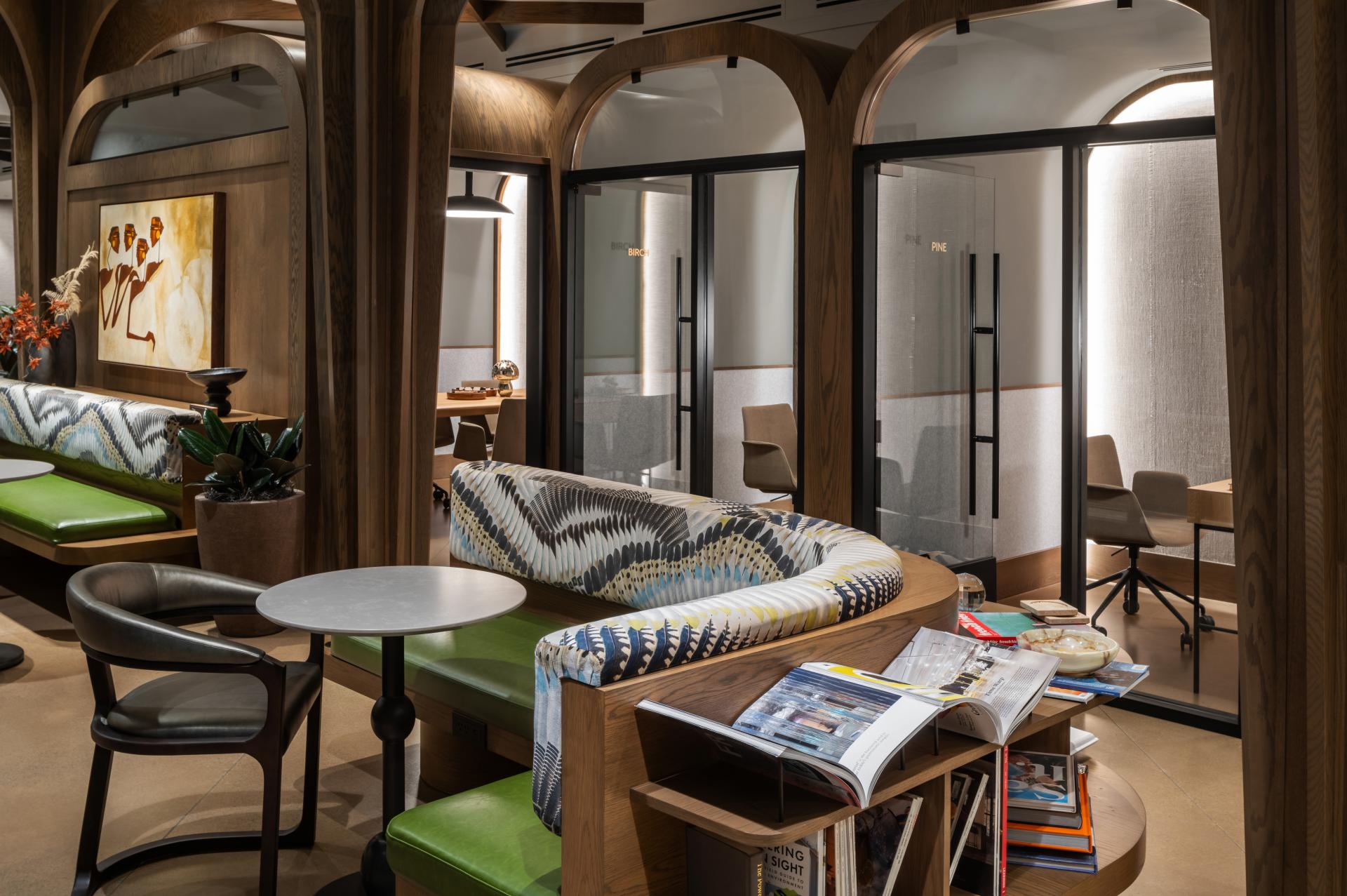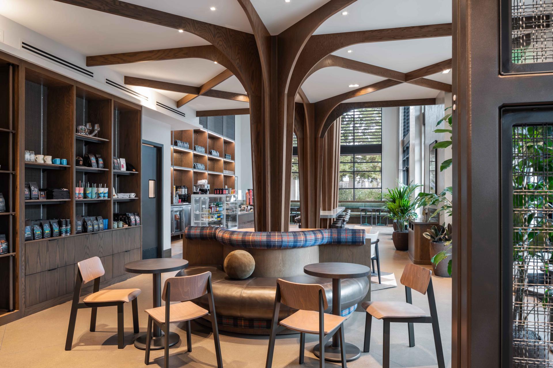 The design is focused on warmth and comfort, with sculptural trees and teleconference pods that make the space feel welcoming and functional. Large windows allow natural light to flood the interiors and frame beautiful views of the surrounding green spaces. The wood finishes throughout add texture and depth, creating a space that feels lived-in and comfortable. Hartwood’s location makes it easy to access both San Francisco and Silicon Valley, but at its core, it’s a place to feel connected and at home.