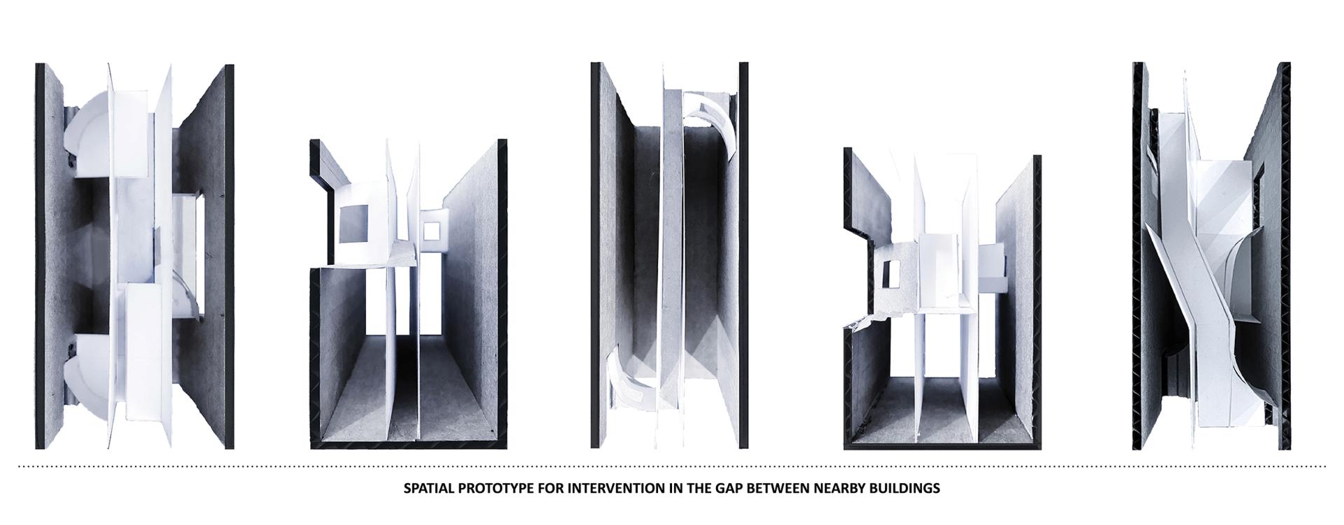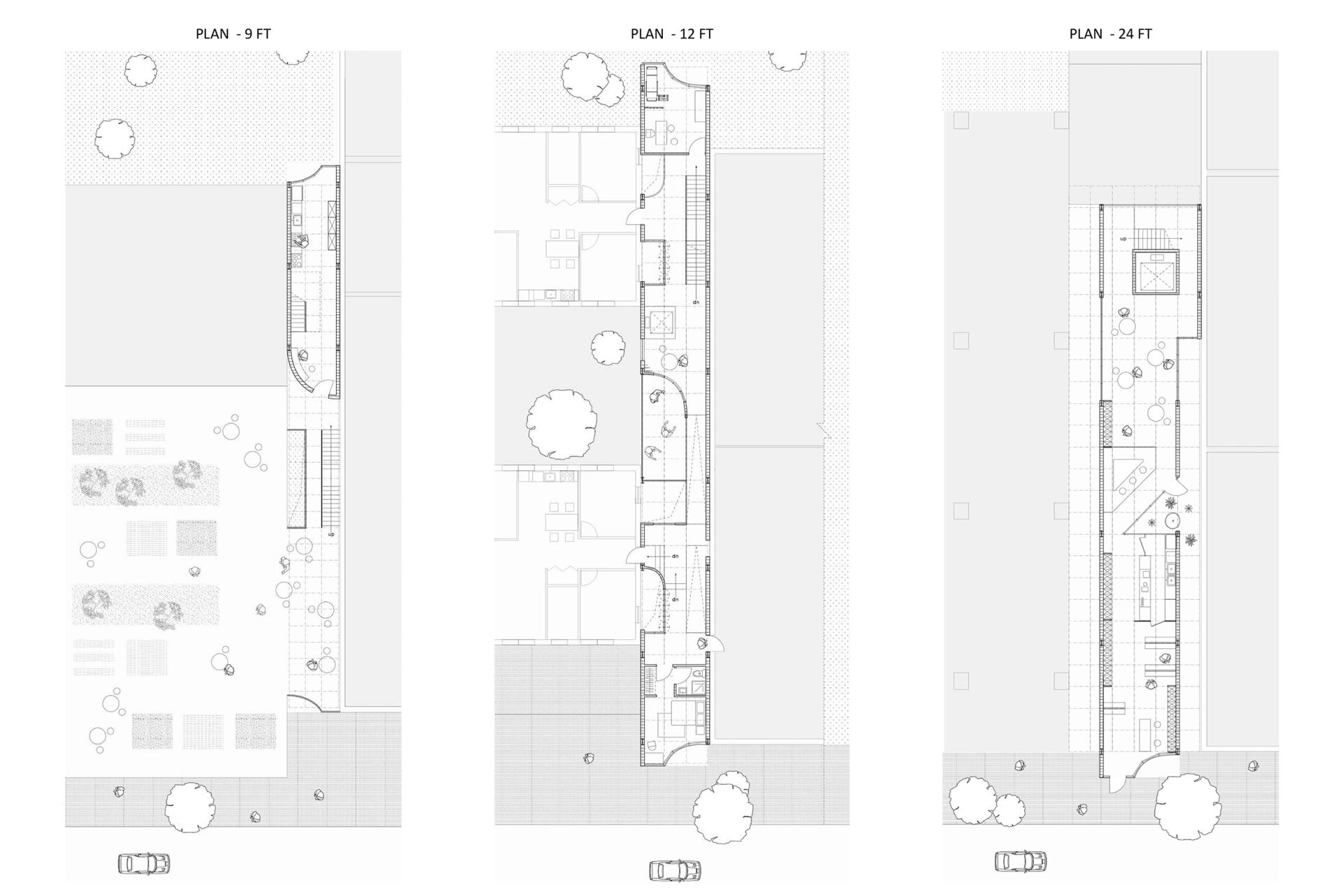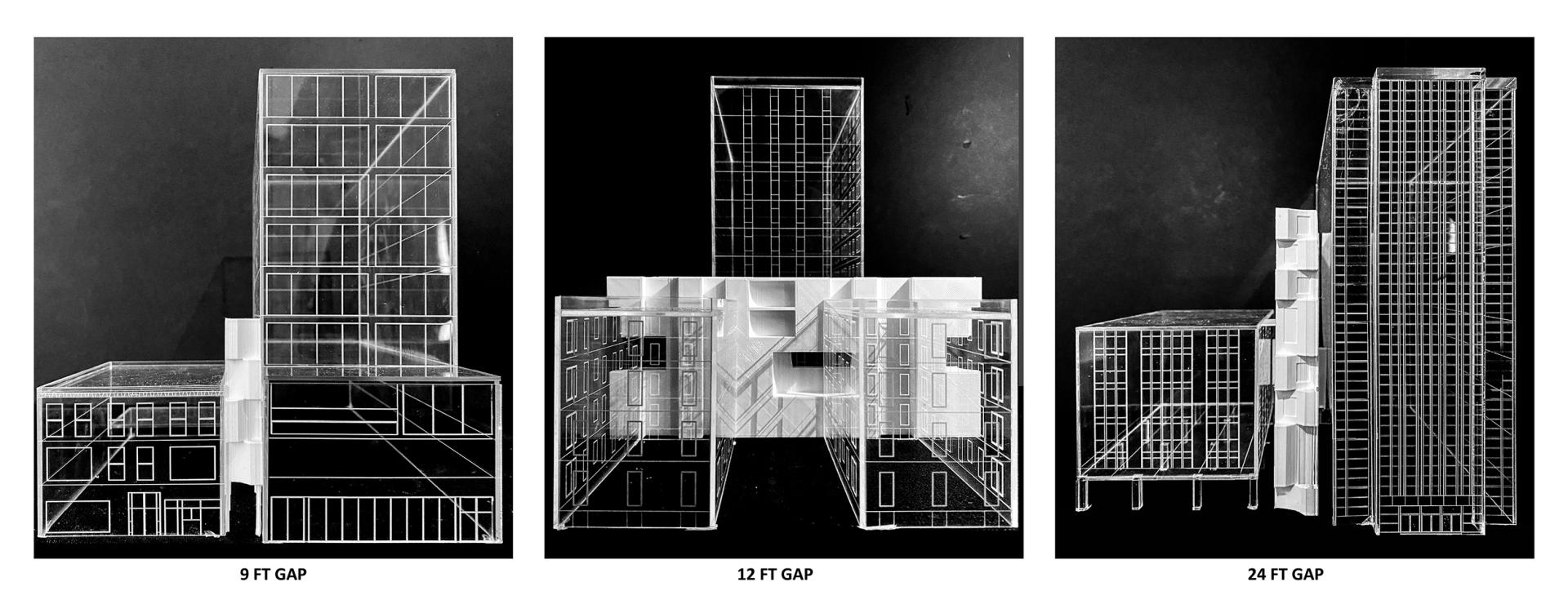 The project adapts to the three primary gap widths found in Flushing—9 feet, 12 feet, and 24 feet—with distinct spatial strategies: