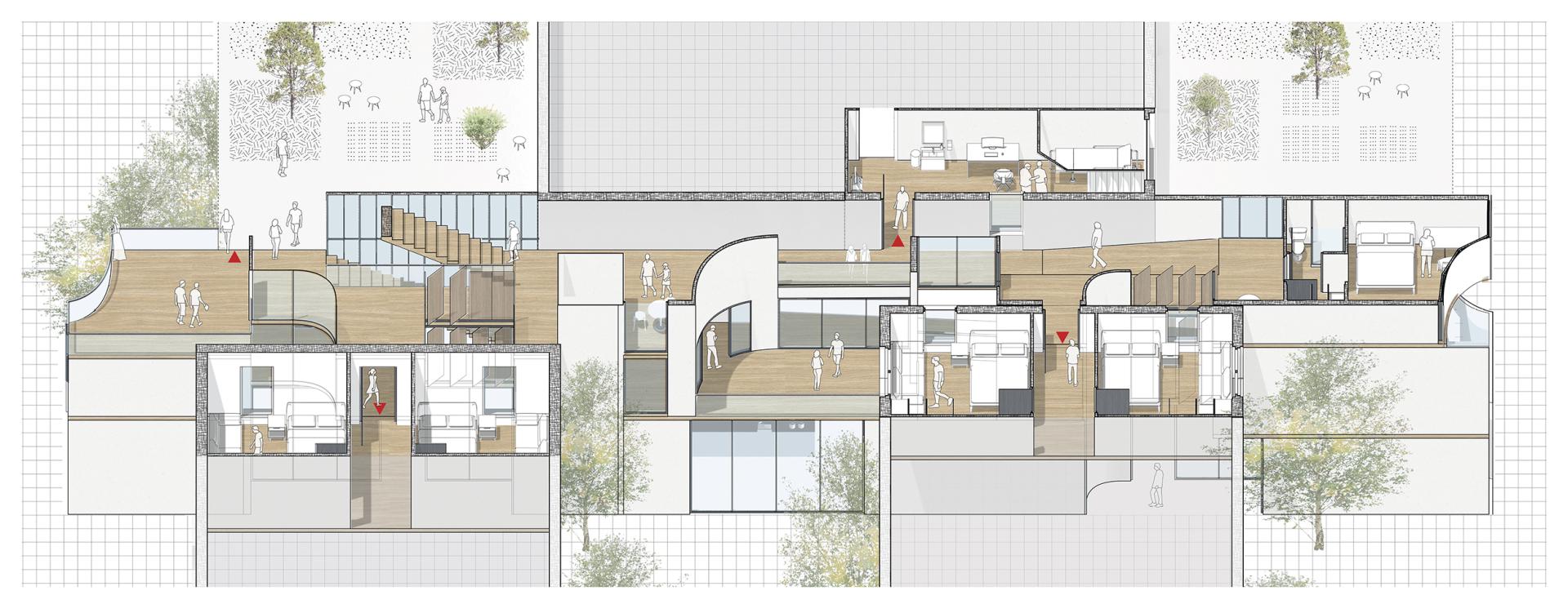 These spaces support long-term shared housing for healthcare workers, while semi-open areas and vertical rehabilitation corridors integrate light, air, and social interaction to enhance well-being.