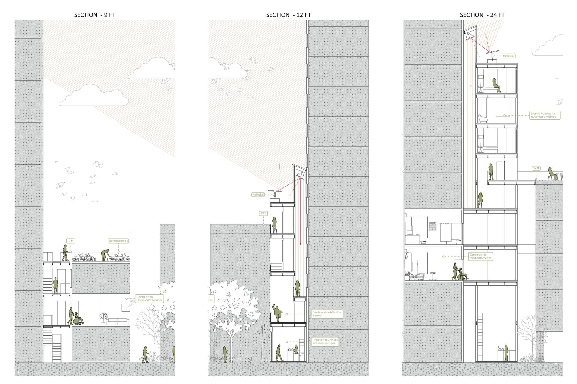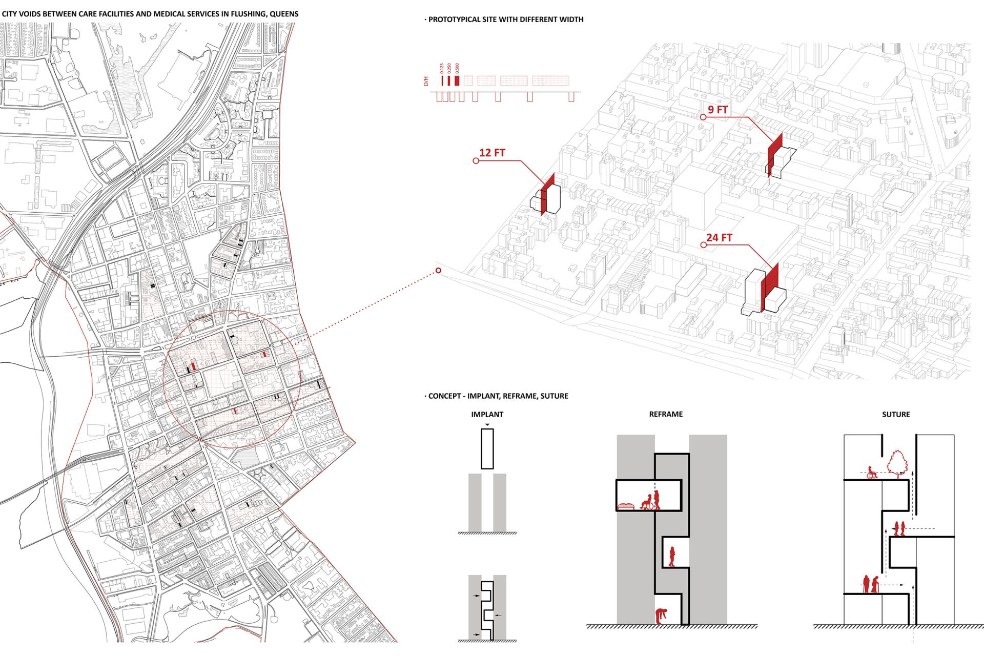 Suture proposes a prototypical intervention—a supplementary healthcare infrastructure tailored to three different gap widths, providing treatment spaces, shared housing, and better accessibility to existing healthcare services to improve wellness.