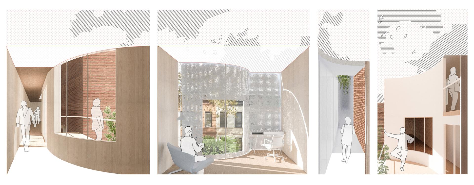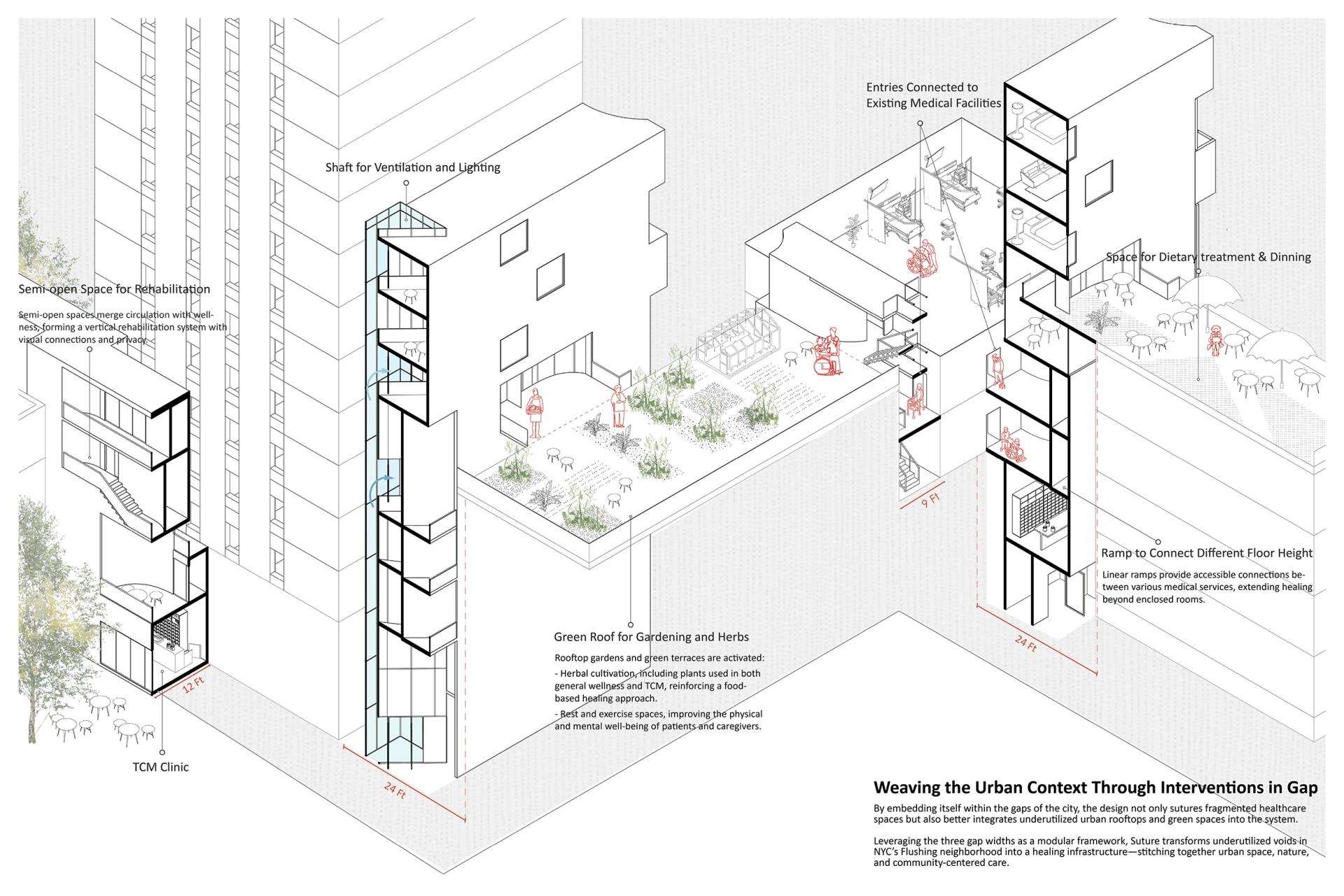 By leveraging the three gap widths as a modular framework, Suture transforms underutilized voids in NYC’s Flushing neighborhood into a healing infrastructure—stitching together urban space, nature, and community-centered care.