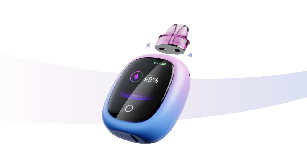 The PressO is equipped with pressure and gravity sensors, so users can get instant tactile feedback by pressing the soft button on the back, or enrich the experience through interactive games on the screen. The screen shows the user the battery status and remaining fume level in real time