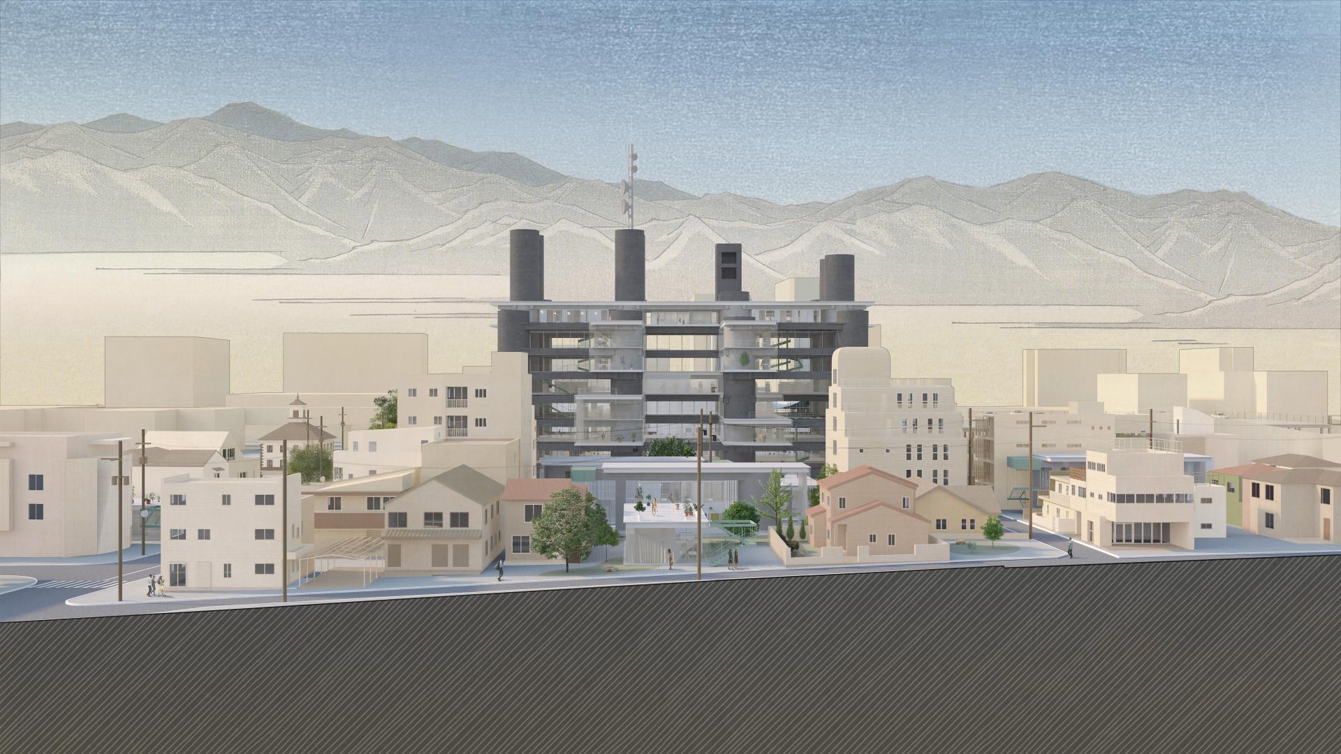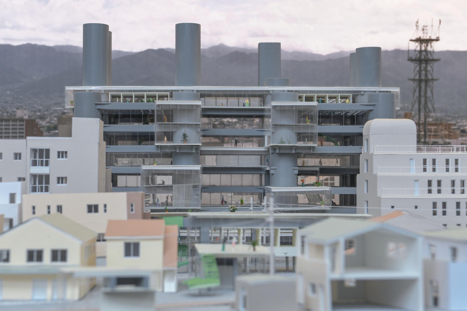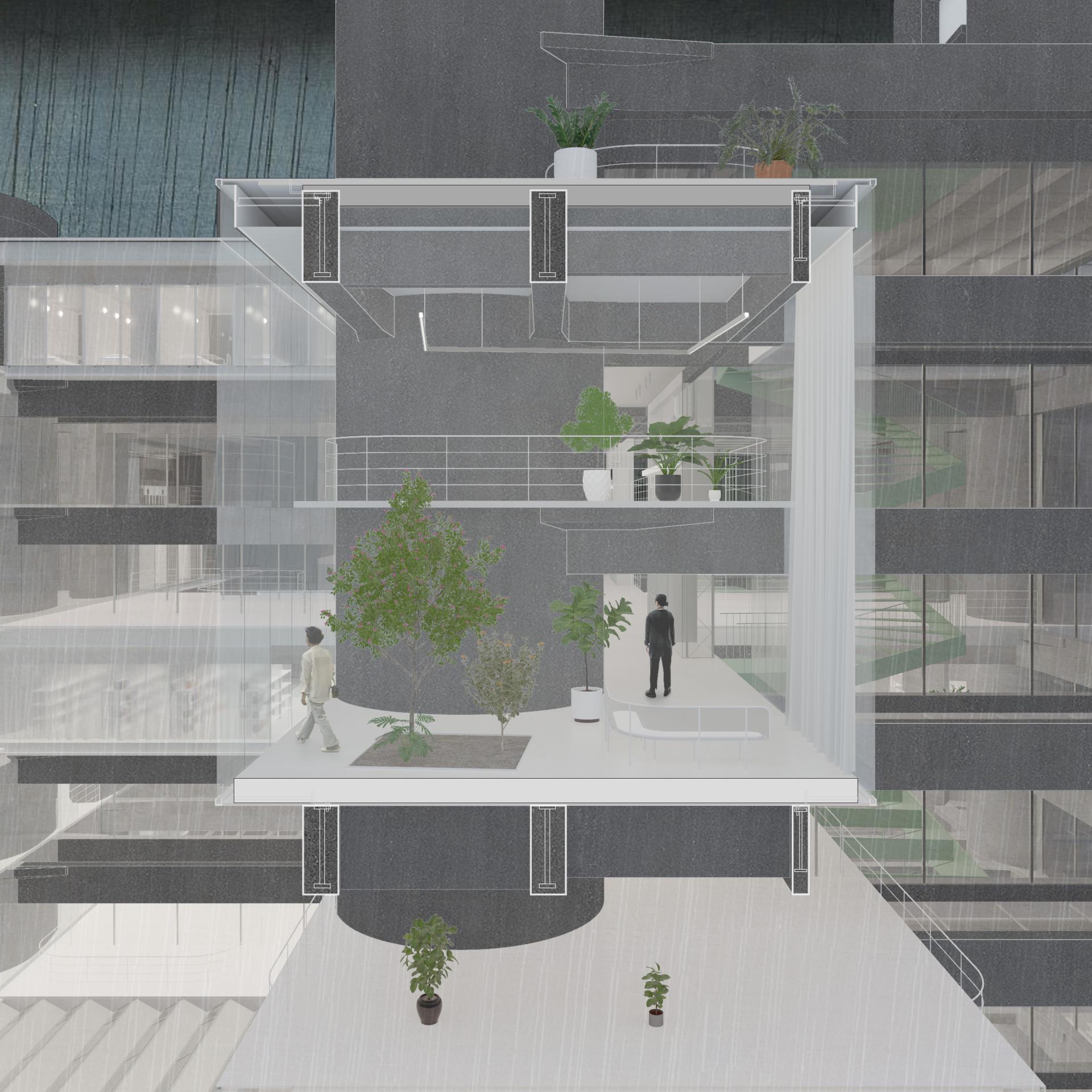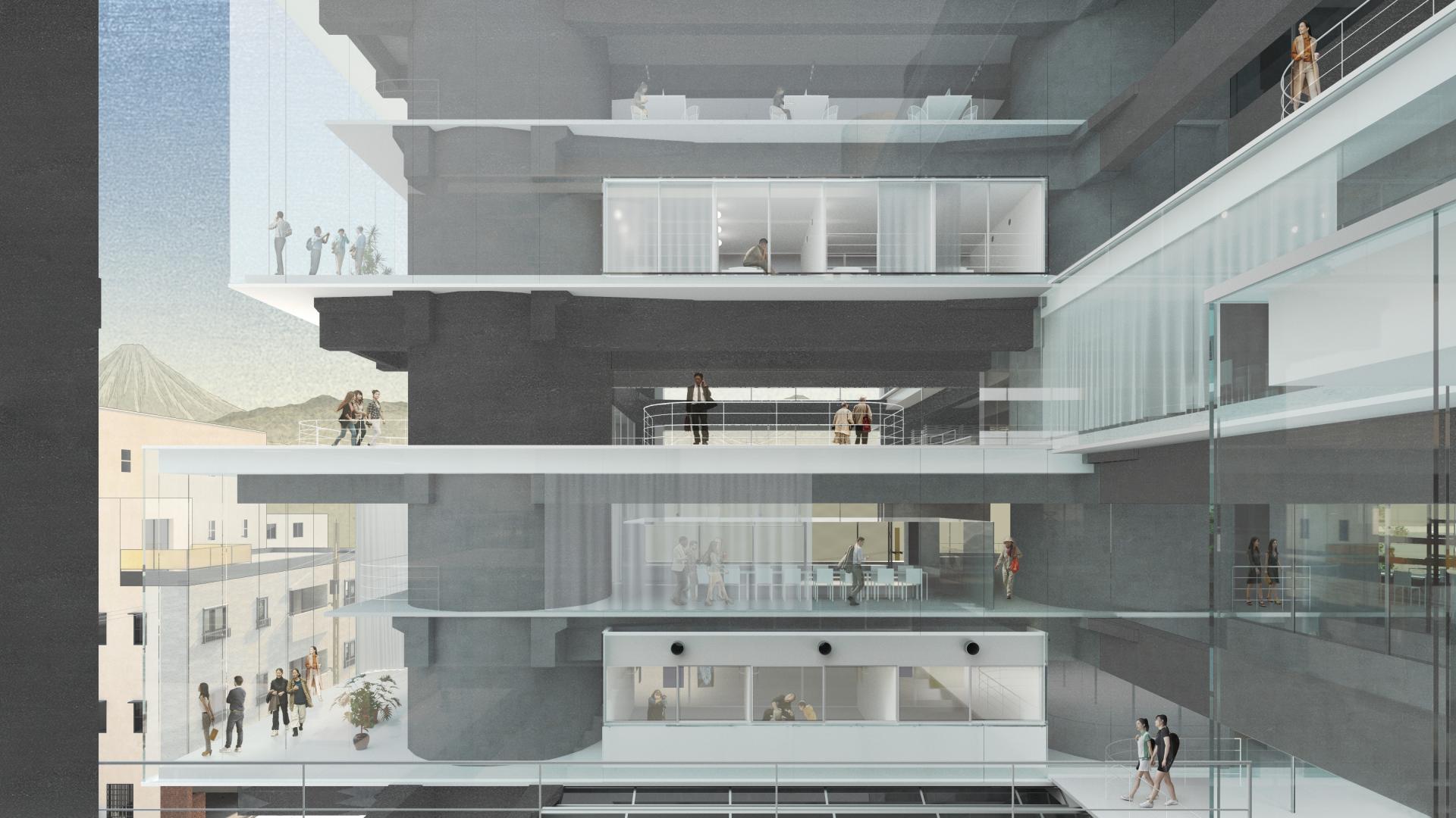 This project attempts to adapt the existing concrete structure to reengage with the contemporary social and urban context. The re-hybridization of the production-centric program, through reintroducing a lifestyle of production, living, and consumption, reinstates the visibility and dynamics of production. Aiming to reactivate the building vertically, the proposal challenges the construction of servant space by Tange, decentralizing the structure through liberating circulation and redefining the boundary of public and private. By occupying the surface of structure, the intervention creates a transparency that contrasts with the historical image at multiple scales, attracting a population of diverse ages. The new slab will be directly built on the existing structure as a plug-in, echoing the philosophy by metabolism architects of developing flexible spatial organizations. The non-flashing of interior space and exterior skin, the no-mullion double laminated glazing, and the non-flashing of new concrete slab on original structure, introduce a contrast and transparency that could be visible both inside and outside. The new volume and the space that it implies, become a series of orthogonal plug-in on the original structure. At an urban scale, the adaptation physically and programmatically mediates the institutional scale urban renewal and adjacent neighborhood, reinvigorating vacant blocks. Public programs will connect the architecture with local train station and civic center. Once an iconic urban concrete relic, the Yamanashi Building becomes an urban incubator that celebrates the history of production with a contemporary fashion.