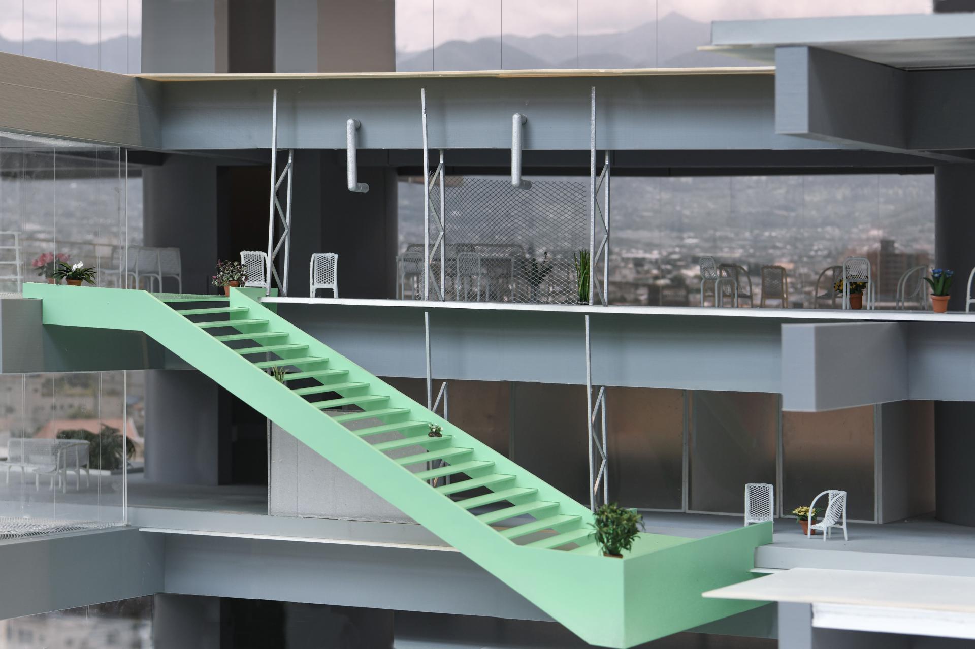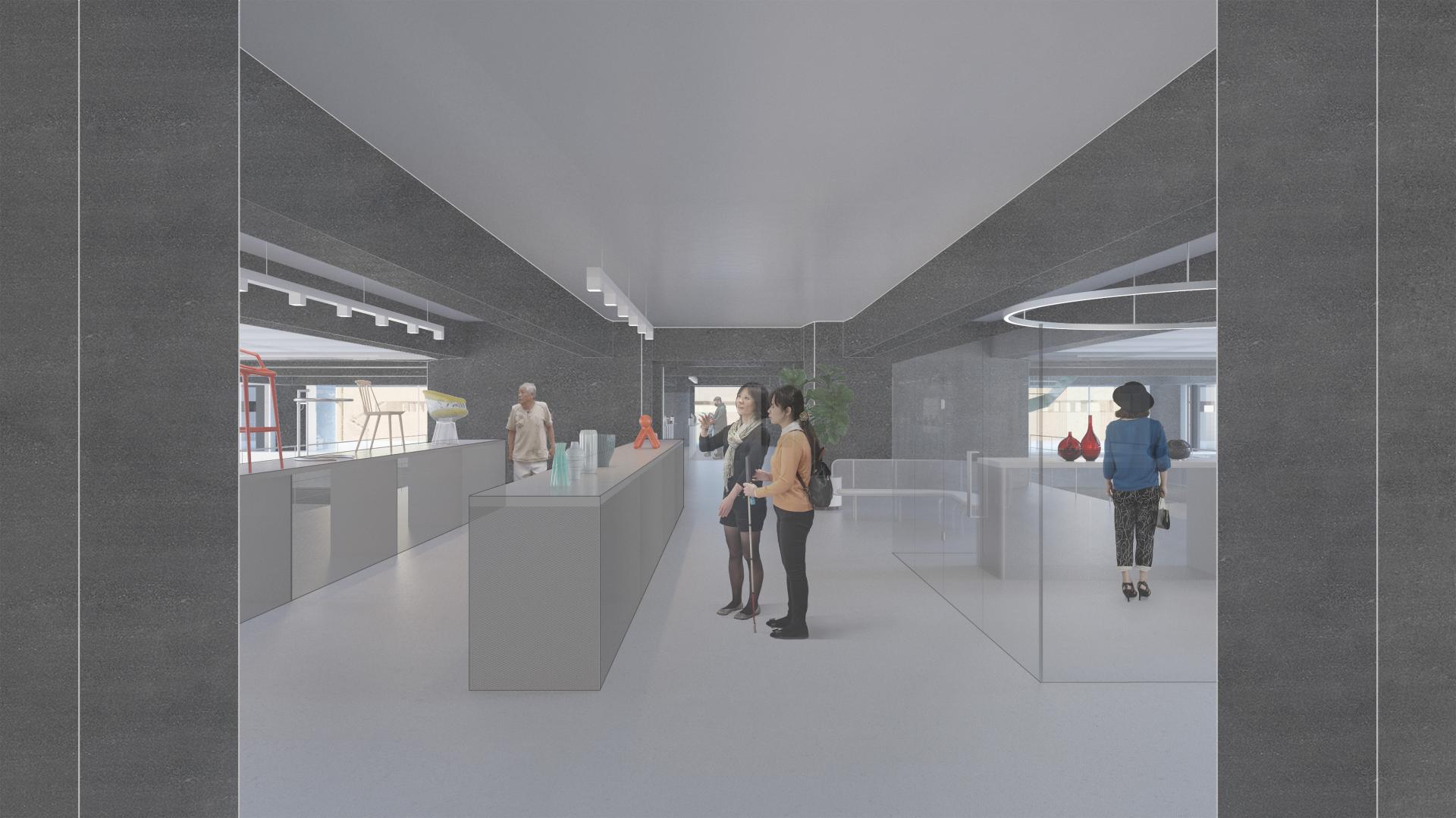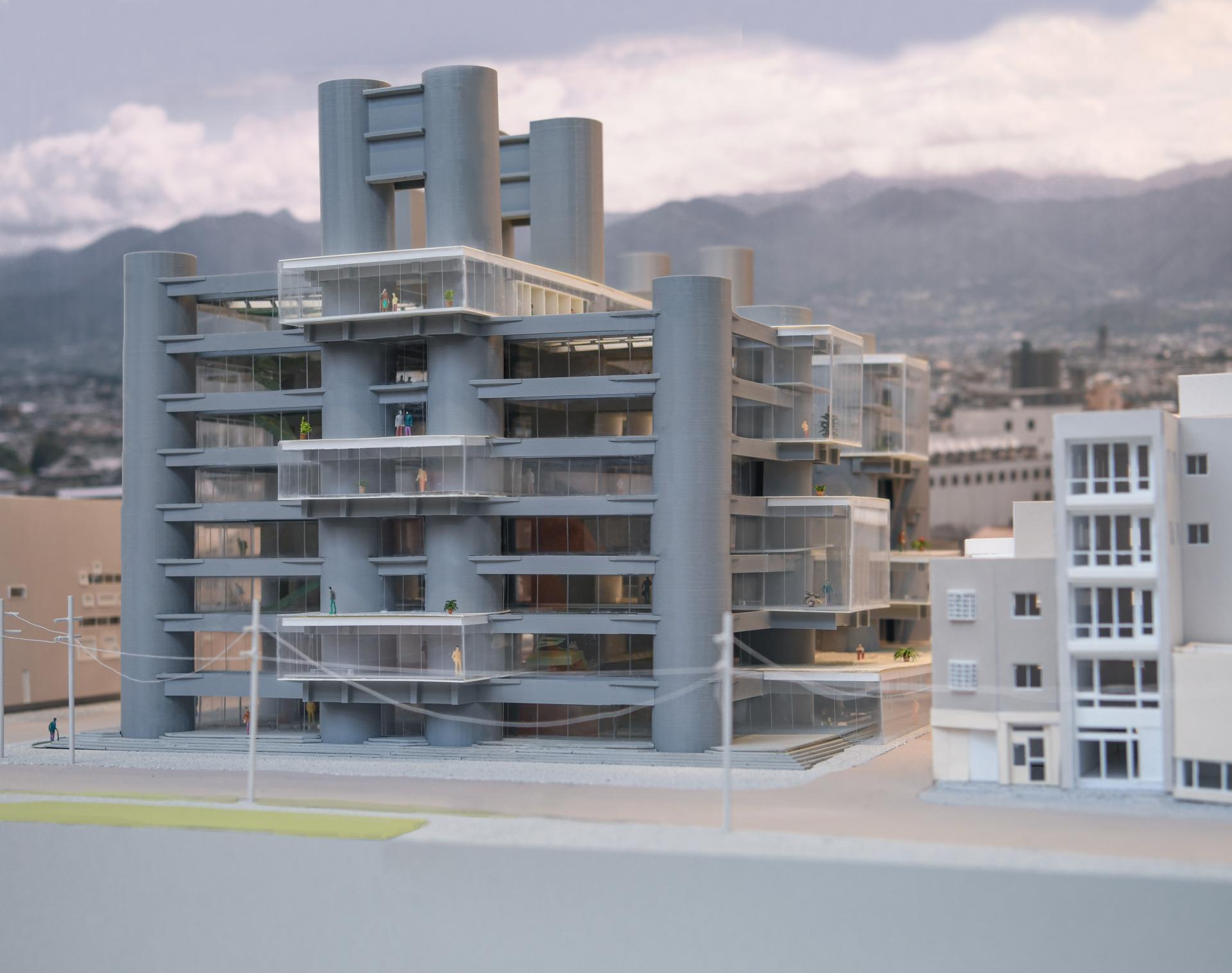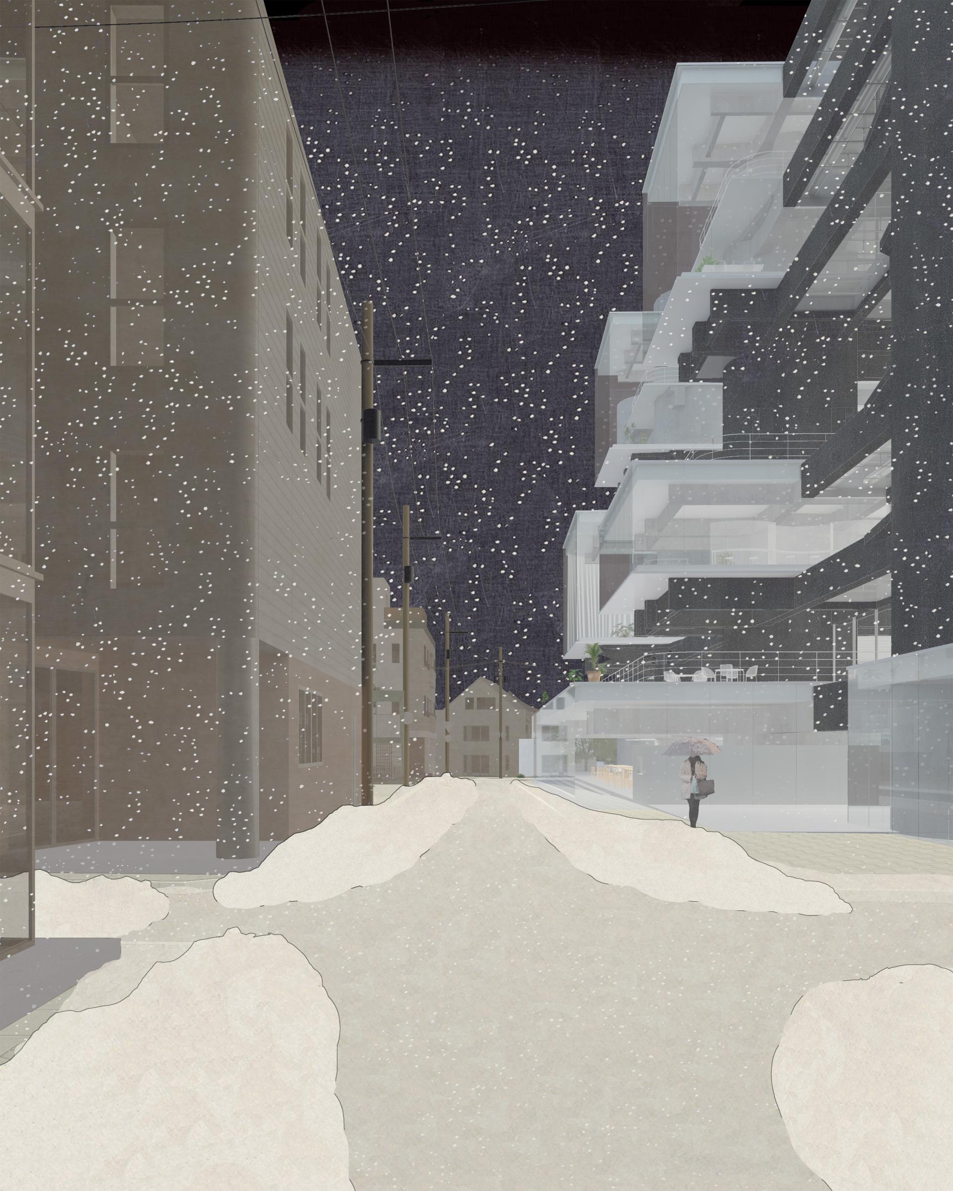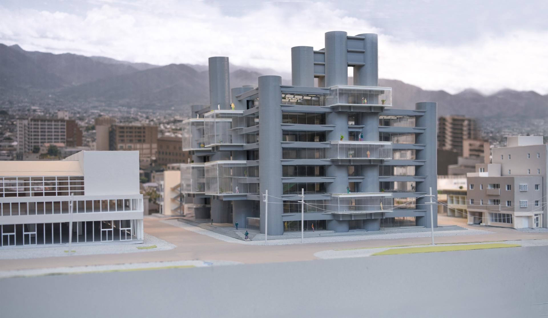 This project attempts to adapt the existing concrete structure to reengage with the contemporary social and urban context. The re-hybridization of the production-centric program, through reintroducing a lifestyle of production, living, and consumption, reinstates the visibility and dynamics of production. Aiming to reactivate the building vertically, the proposal challenges the construction of servant space by Tange, decentralizing the structure through liberating circulation and redefining the boundary of public and private. By occupying the surface of structure, the intervention creates a transparency that contrasts with the historical image at multiple scales, attracting a population of diverse ages. The new slab will be directly built on the existing structure as a plug-in, echoing the philosophy by metabolism architects of developing flexible spatial organizations. The non-flashing of interior space and exterior skin, the no-mullion double laminated glazing, and the non-flashing of new concrete slab on original structure, introduce a contrast and transparency that could be visible both inside and outside. The new volume and the space that it implies, become a series of orthogonal plug-in on the original structure. At an urban scale, the adaptation physically and programmatically mediates the institutional scale urban renewal and adjacent neighborhood, reinvigorating vacant blocks. Public programs will connect the architecture with local train station and civic center. Once an iconic urban concrete relic, the Yamanashi Building becomes an urban incubator that celebrates the history of production with a contemporary fashion.