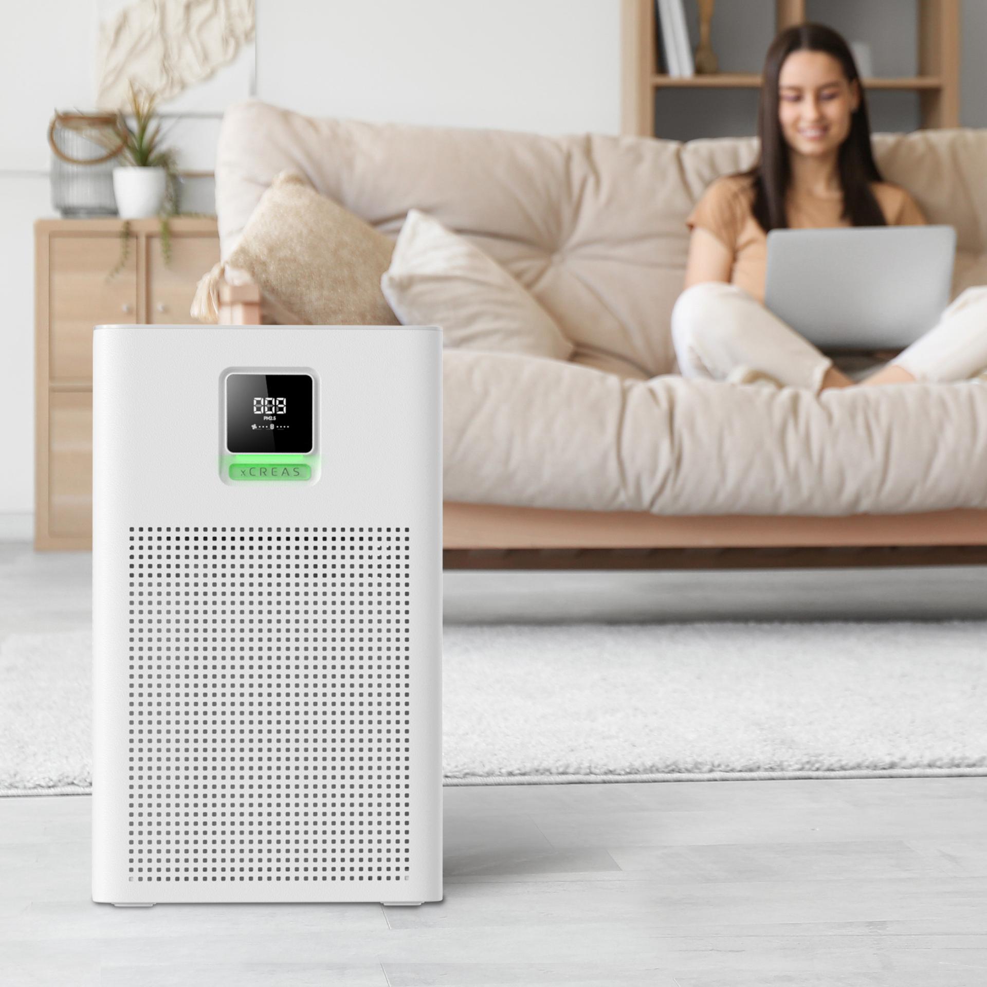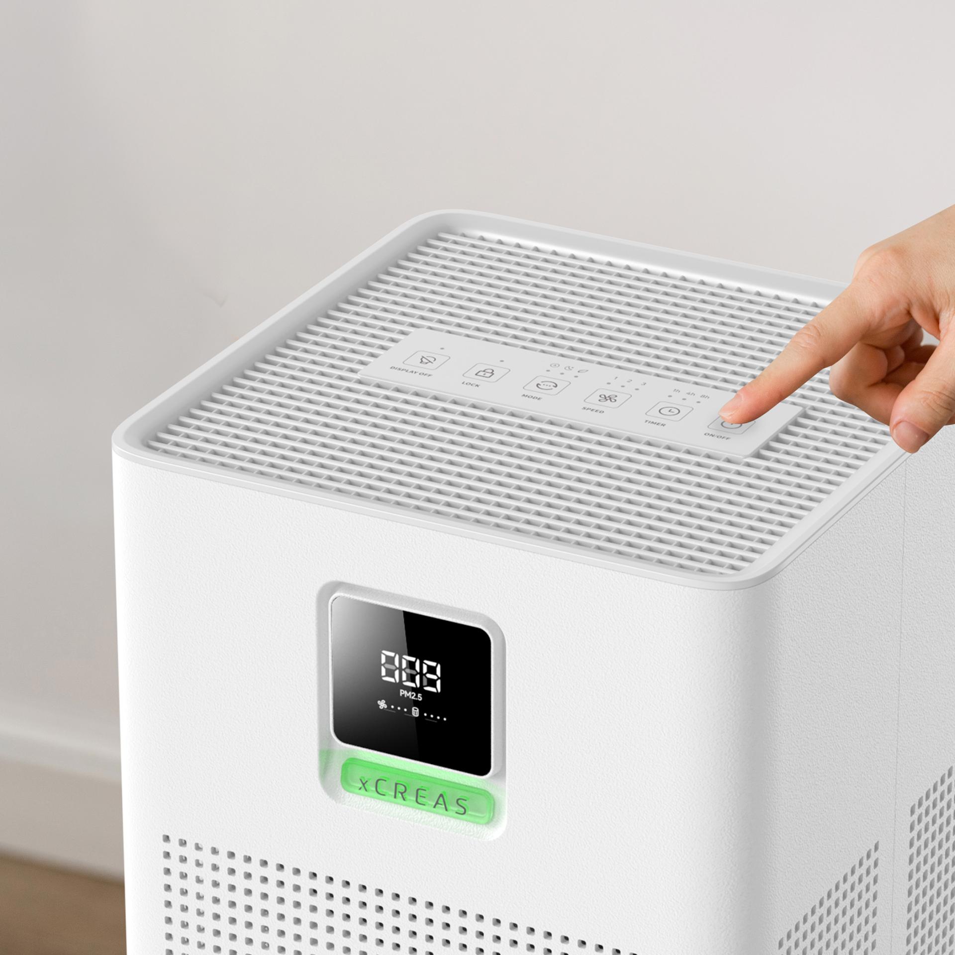 xCREAS B1 Air Purifier: Merges minimalist design and smart tech for modern homes. Its "square-rounded" silhouette defies norms, while quad-side vents boost airflow/hide internals. Features a floating screen, spotlight logo, and cross grilles for 23%+ airflow efficiency—redefining clean air with avant-garde precision.