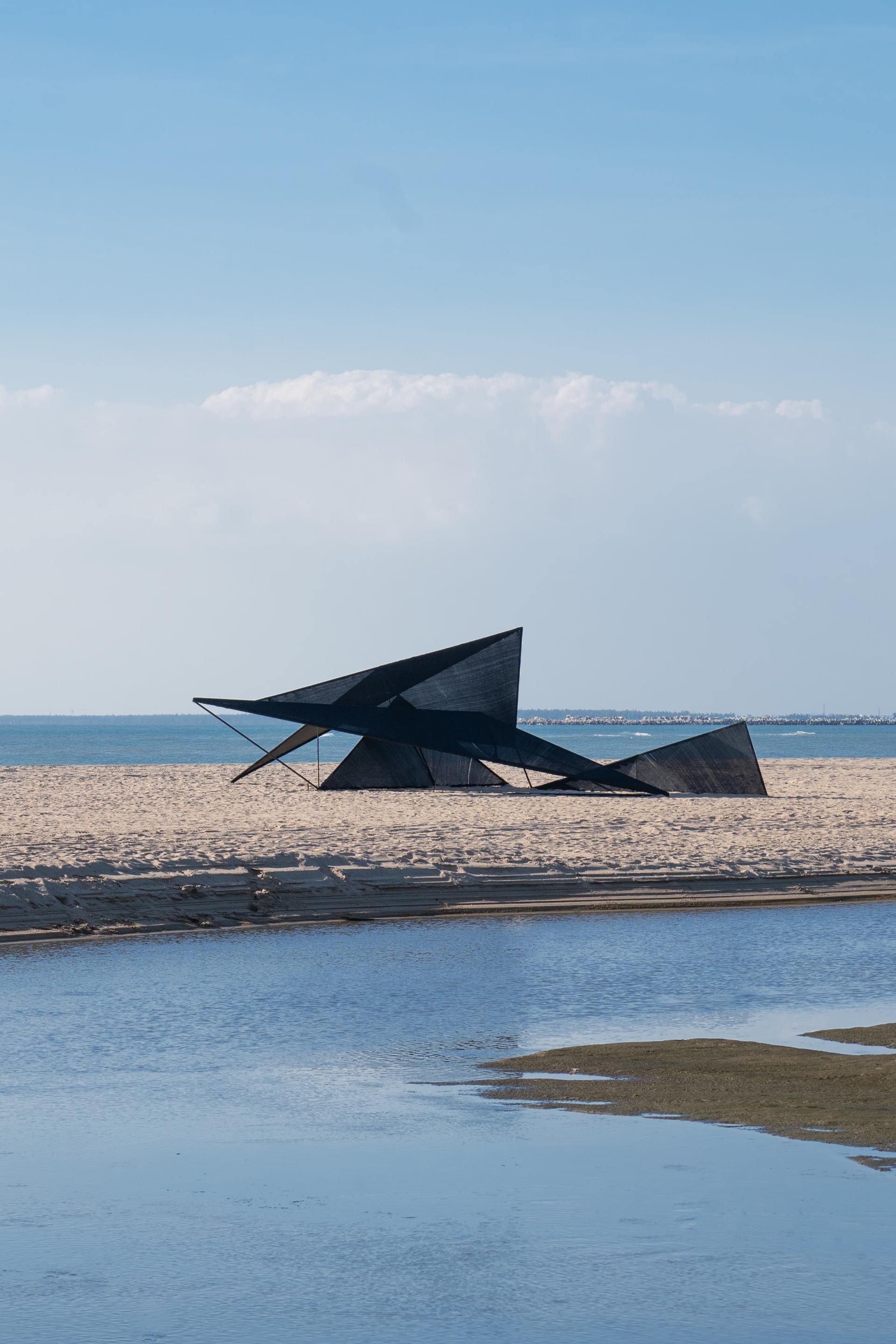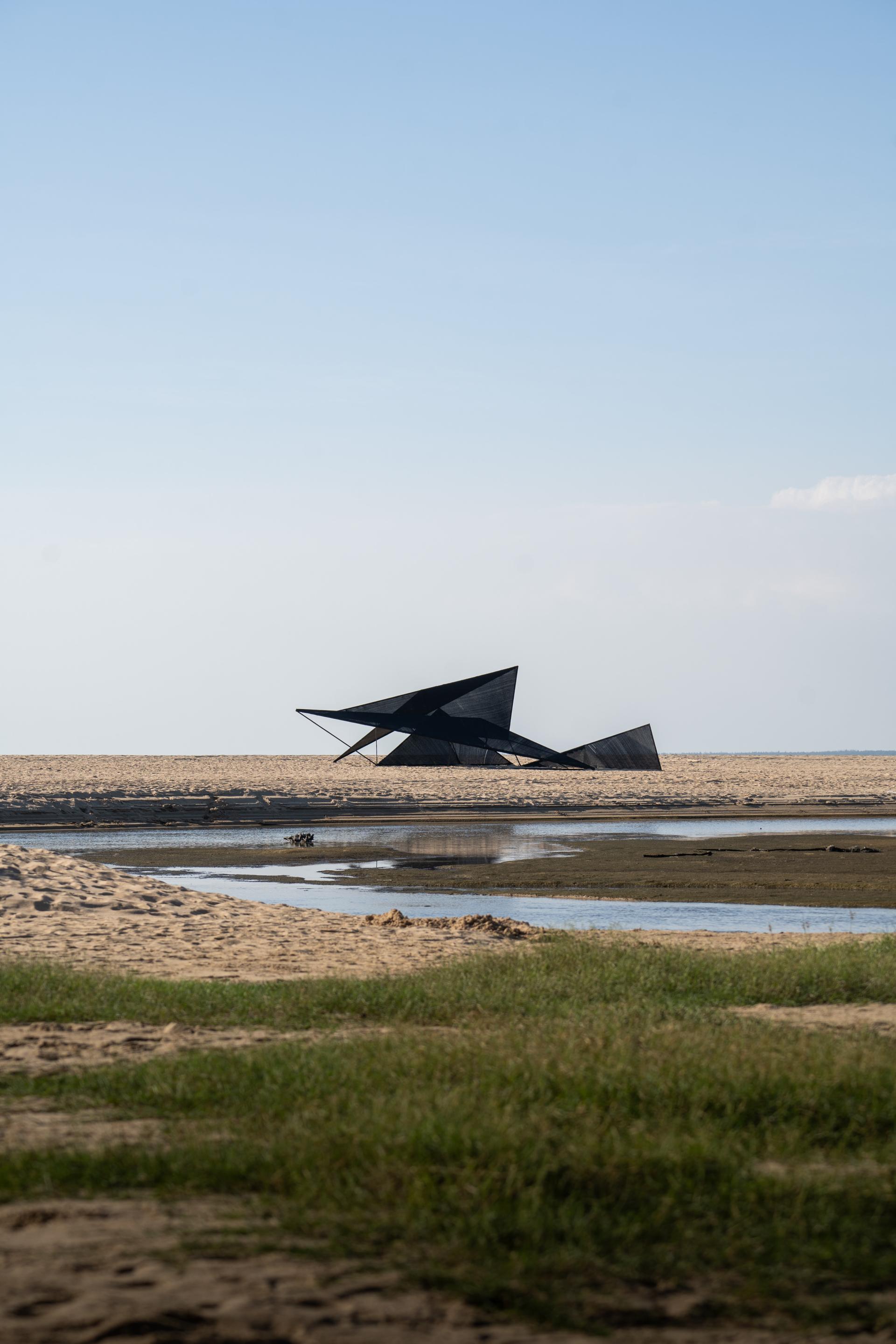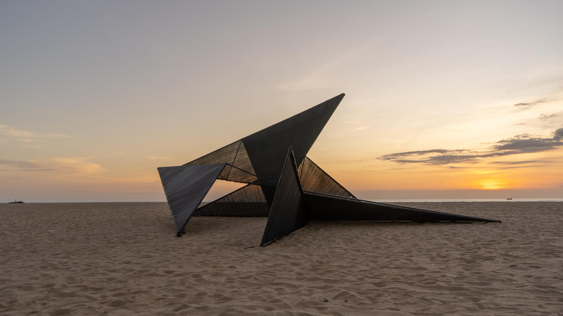 The structure's form is futuristic yet rooted in nature, resembling a bird lying on the sand or a spaceship from the future. Its black shade cloth material, traditionally used by local fishermen, links ancient practices with futuristic vision, conveying a powerful dialogue between the past and the future. This material choice enhances the work's environmental connection, highlighting a sustainable and symbiotic relationship with nature.