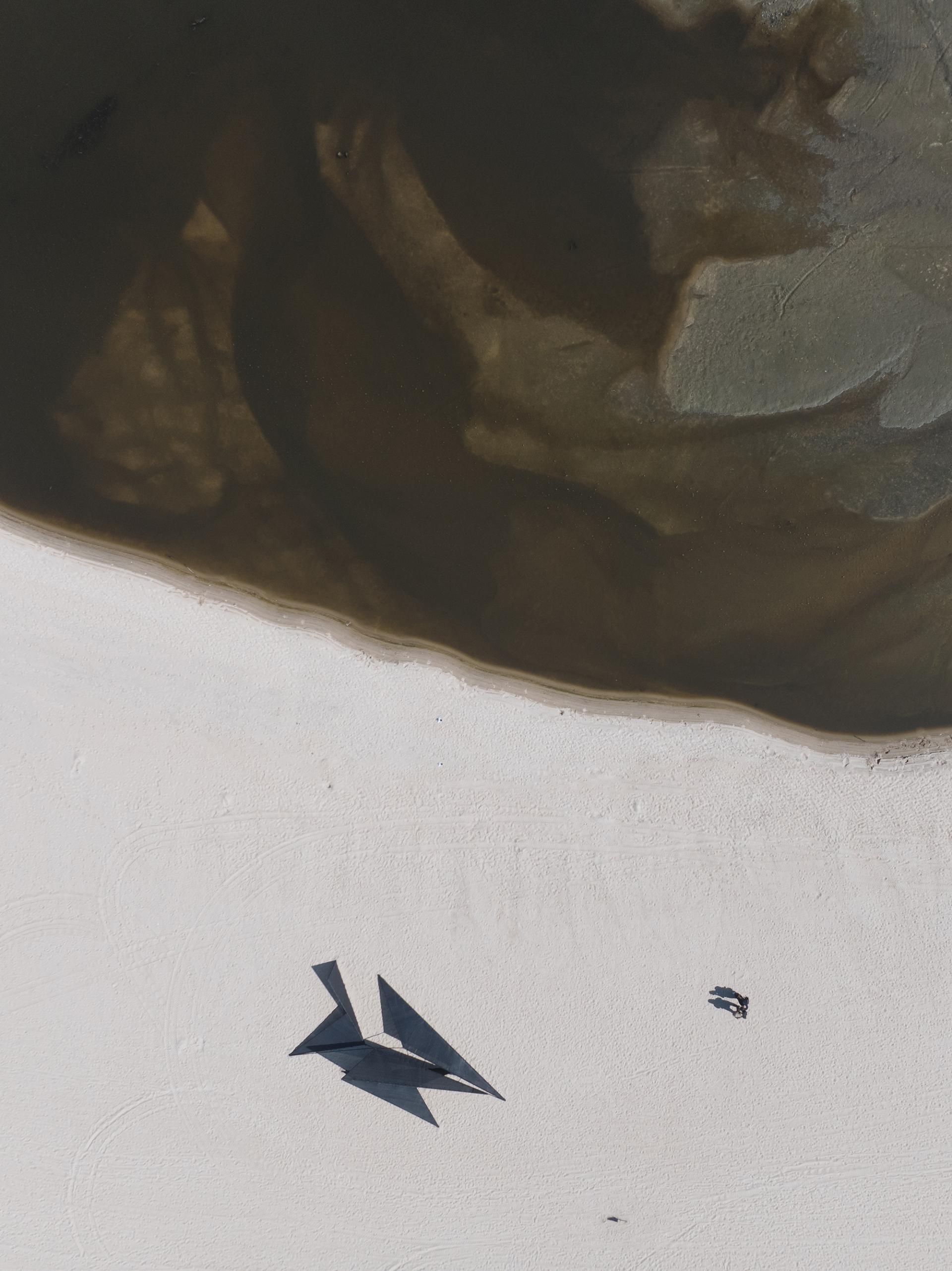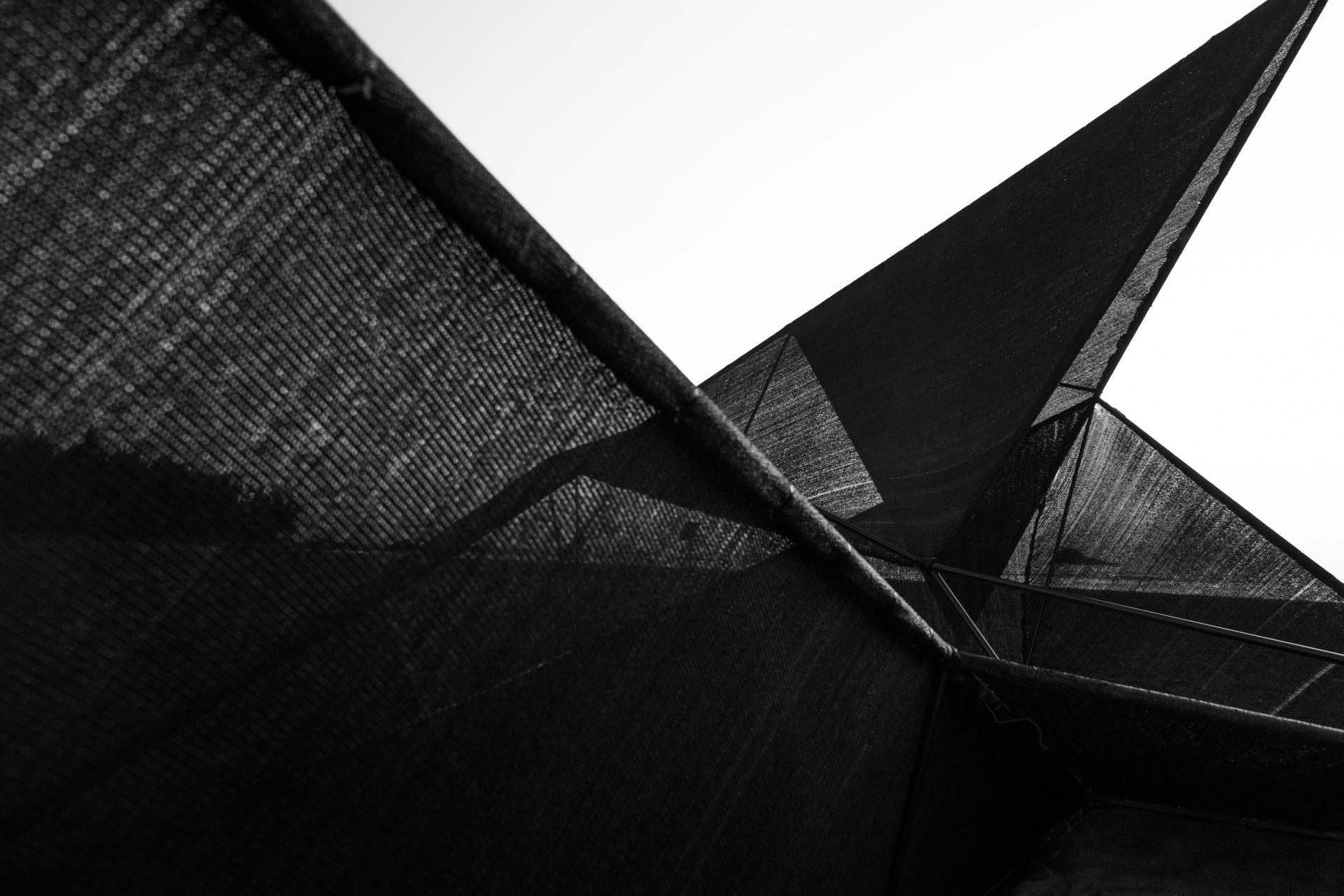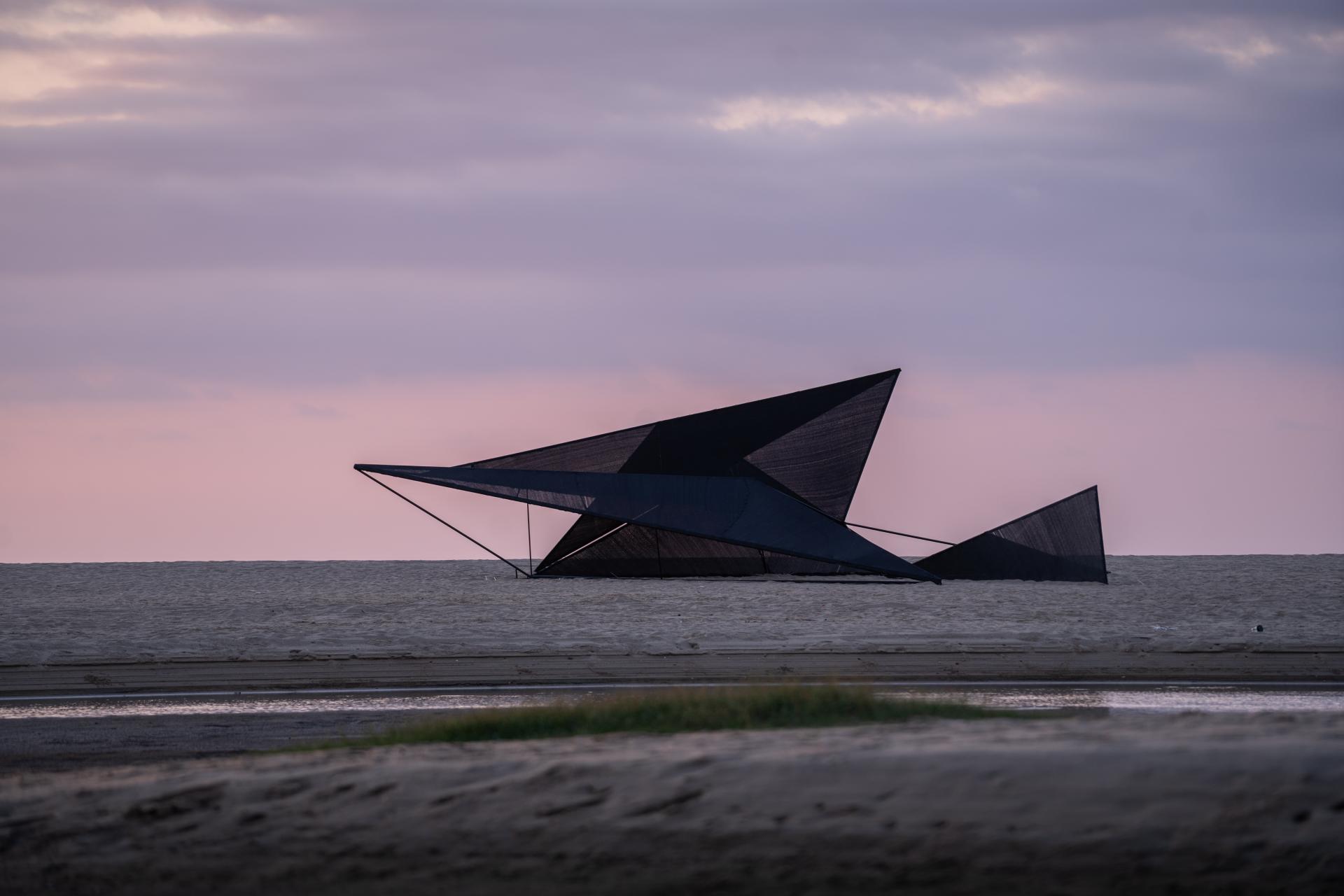 The structure's form is futuristic yet rooted in nature, resembling a bird lying on the sand or a spaceship from the future. Its black shade cloth material, traditionally used by local fishermen, links ancient practices with futuristic vision, conveying a powerful dialogue between the past and the future. This material choice enhances the work's environmental connection, highlighting a sustainable and symbiotic relationship with nature.