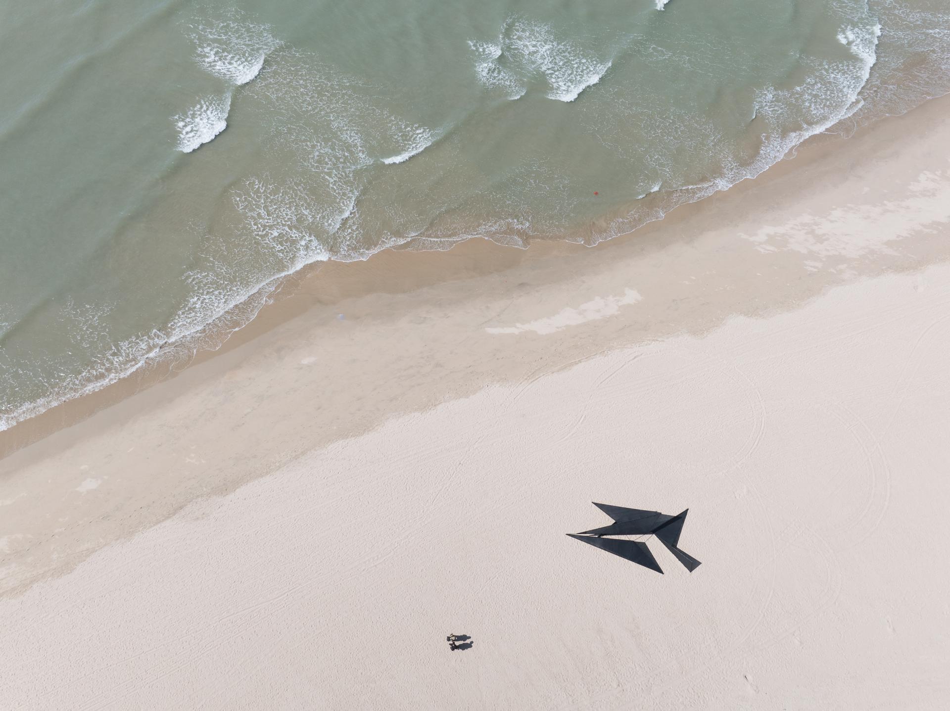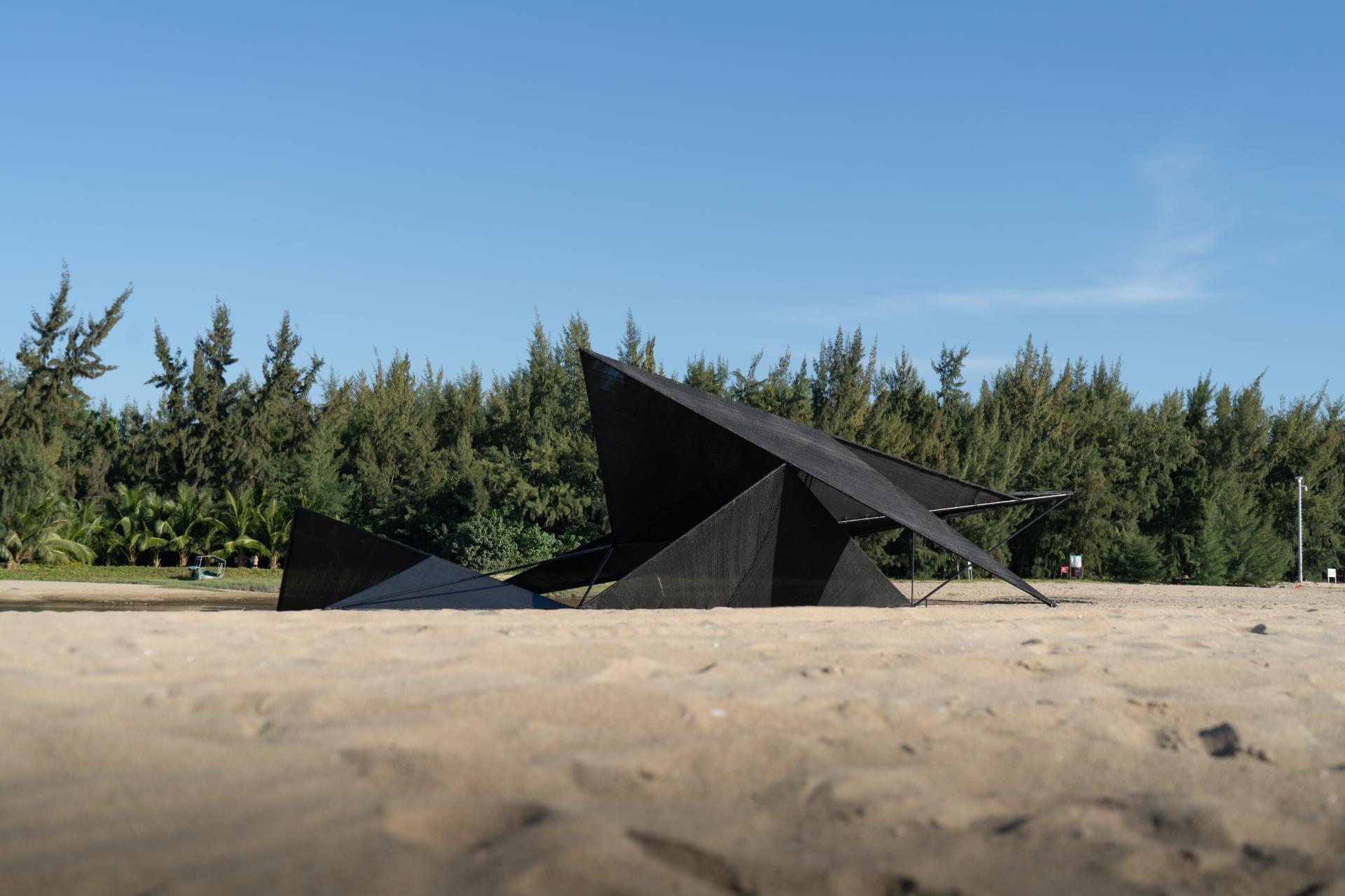 The installation’s design is deeply responsive to its surroundings. Positioned facing southwest, it interacts dynamically with the varying natural environments around it. From different perspectives, the installation transforms. At noon, the piece appears as a massive black bird resting on the beach, with its sleek design evoking awe and innovation. Its triangular sail-like form captures the essence of both fluidity and strength, mirroring the movement of the ocean and the expansive sky.