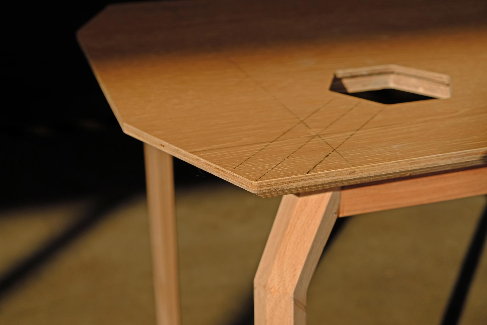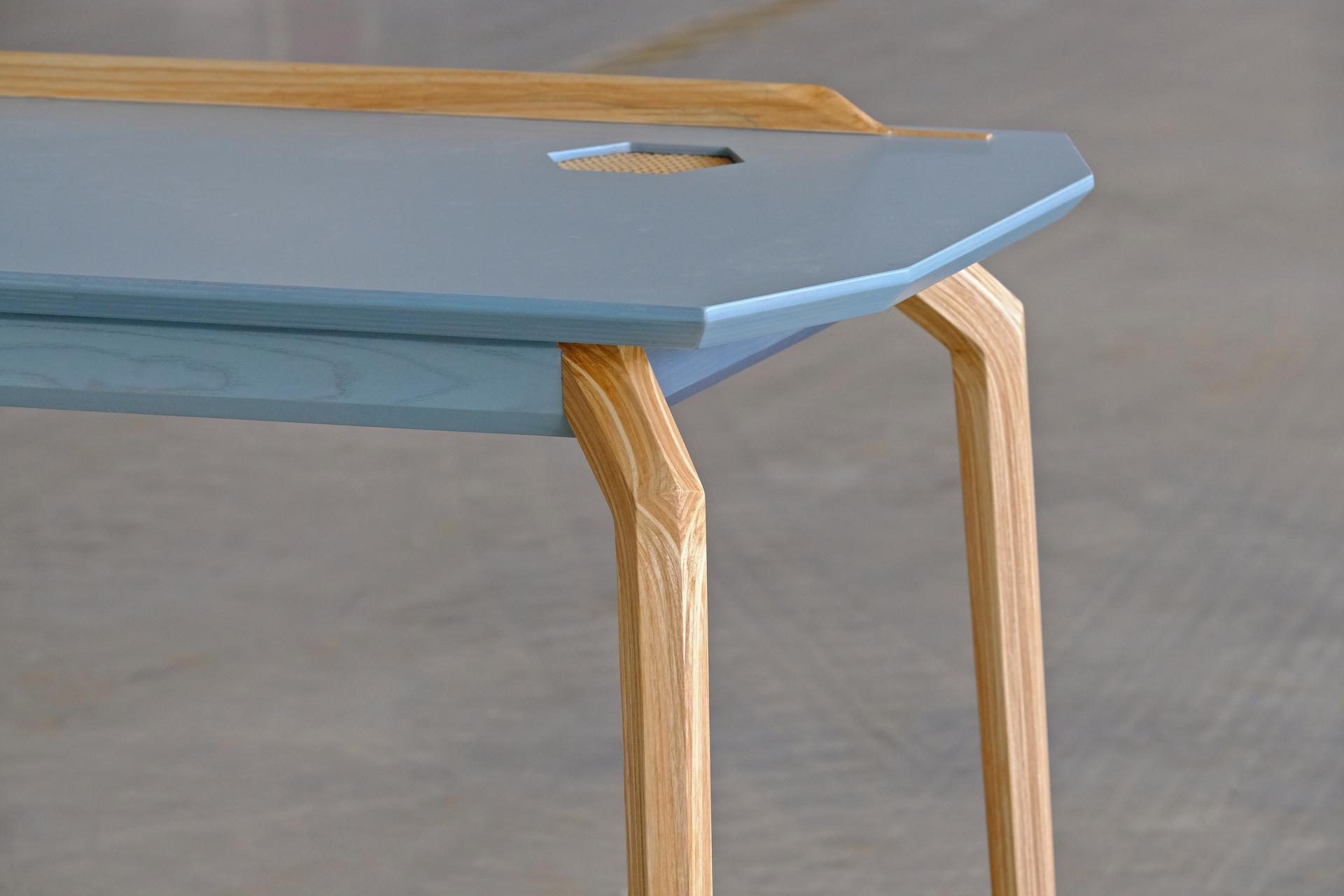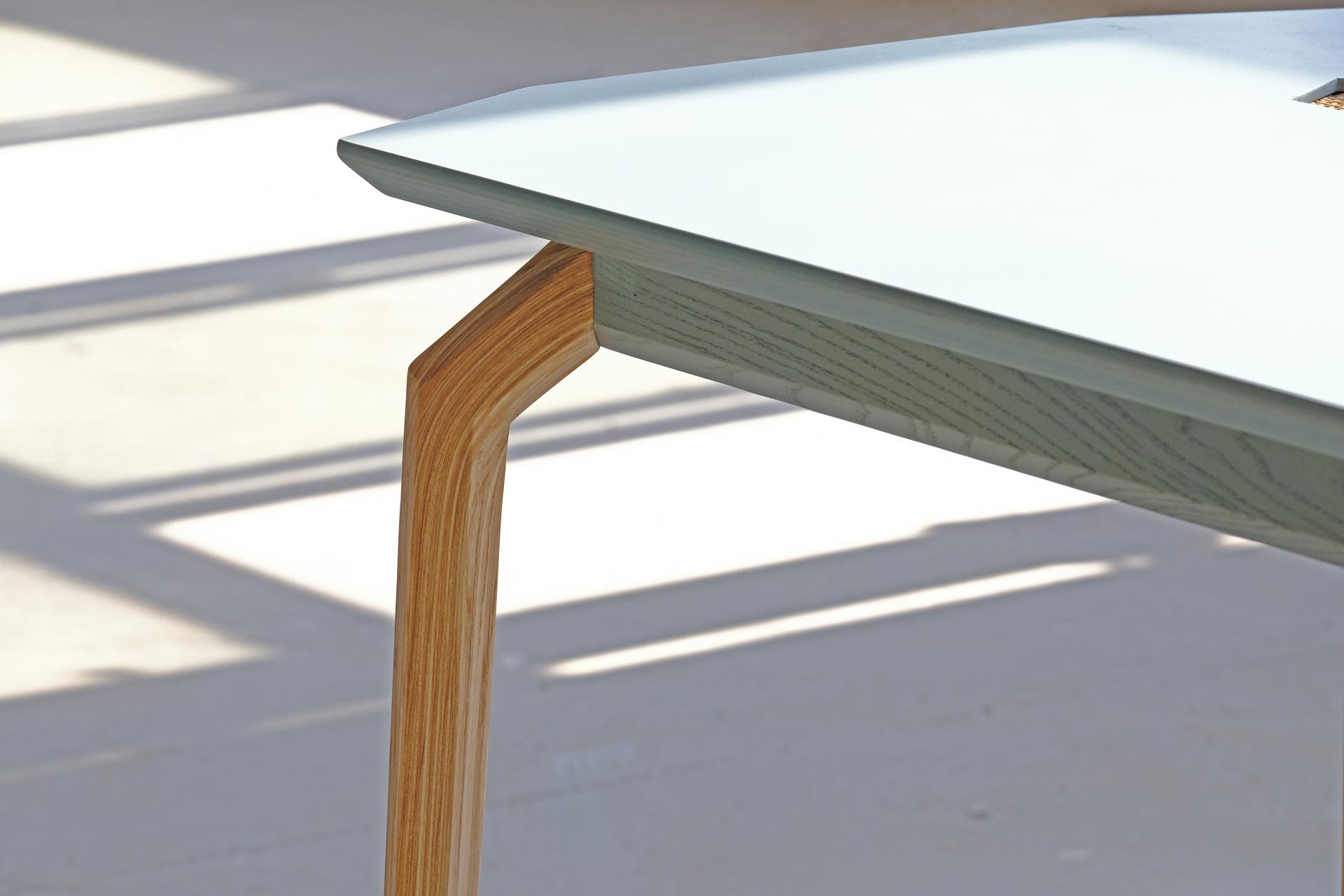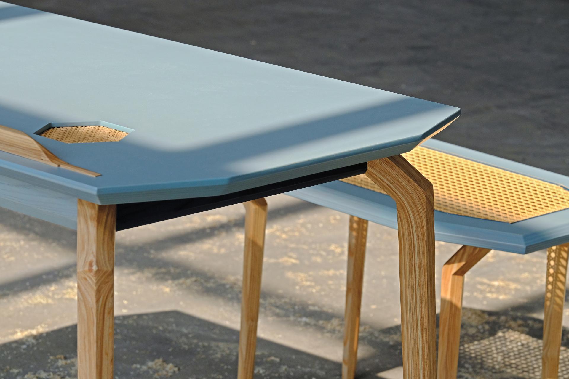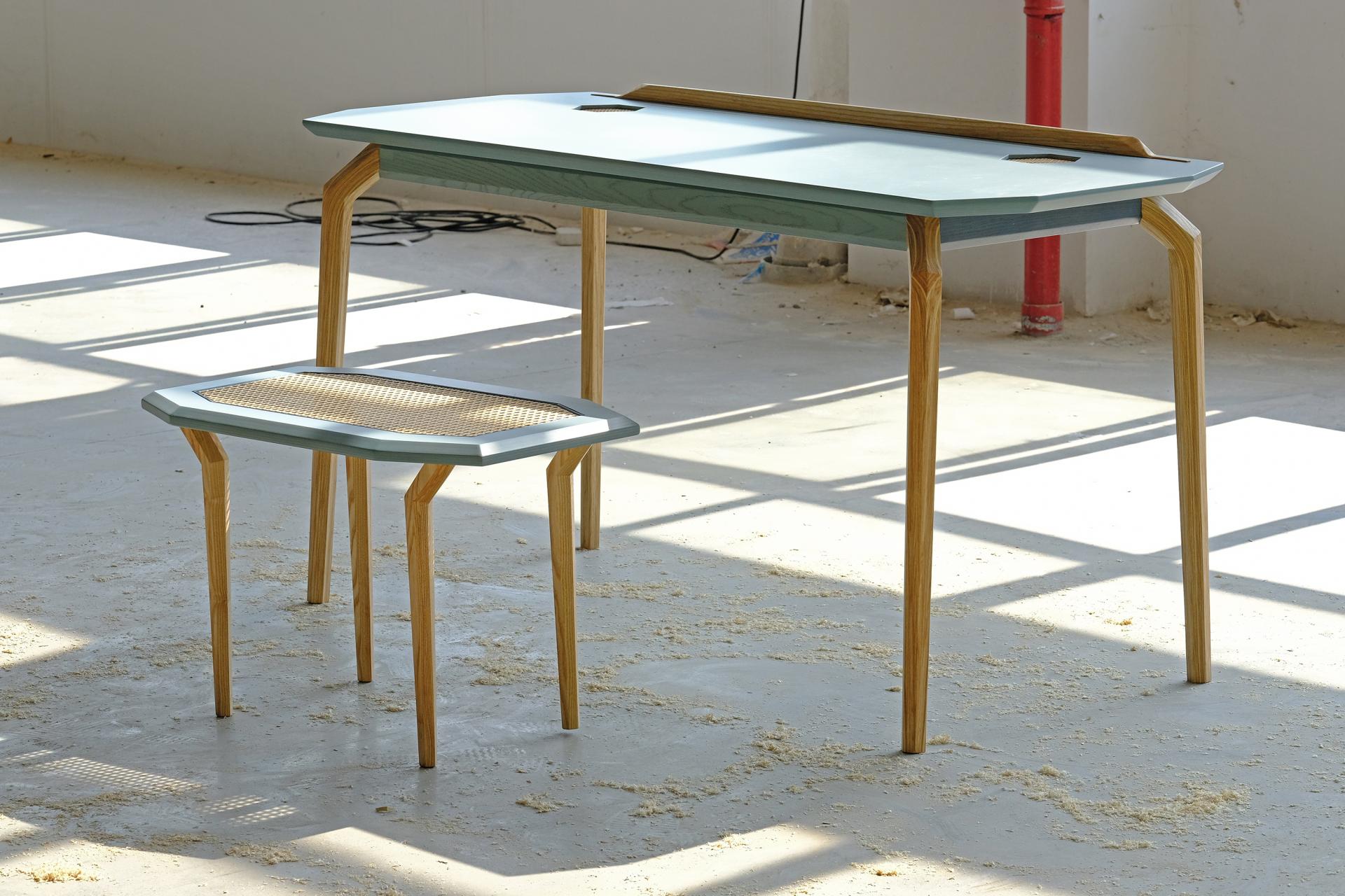 The creation of these lightweight pieces utilizes advanced production techniques, with both the desk and chair legs crafted from layers of 1.5mm beech veneer sheets laminated, molded, machined, and polished to shape. This method not only allows precise control over the wood grain to maximize strength—particularly at the critical 45-degree folding angle—but also enhances aesthetic appeal by introducing a distinctive diamond pattern at the fold’s outer edge.