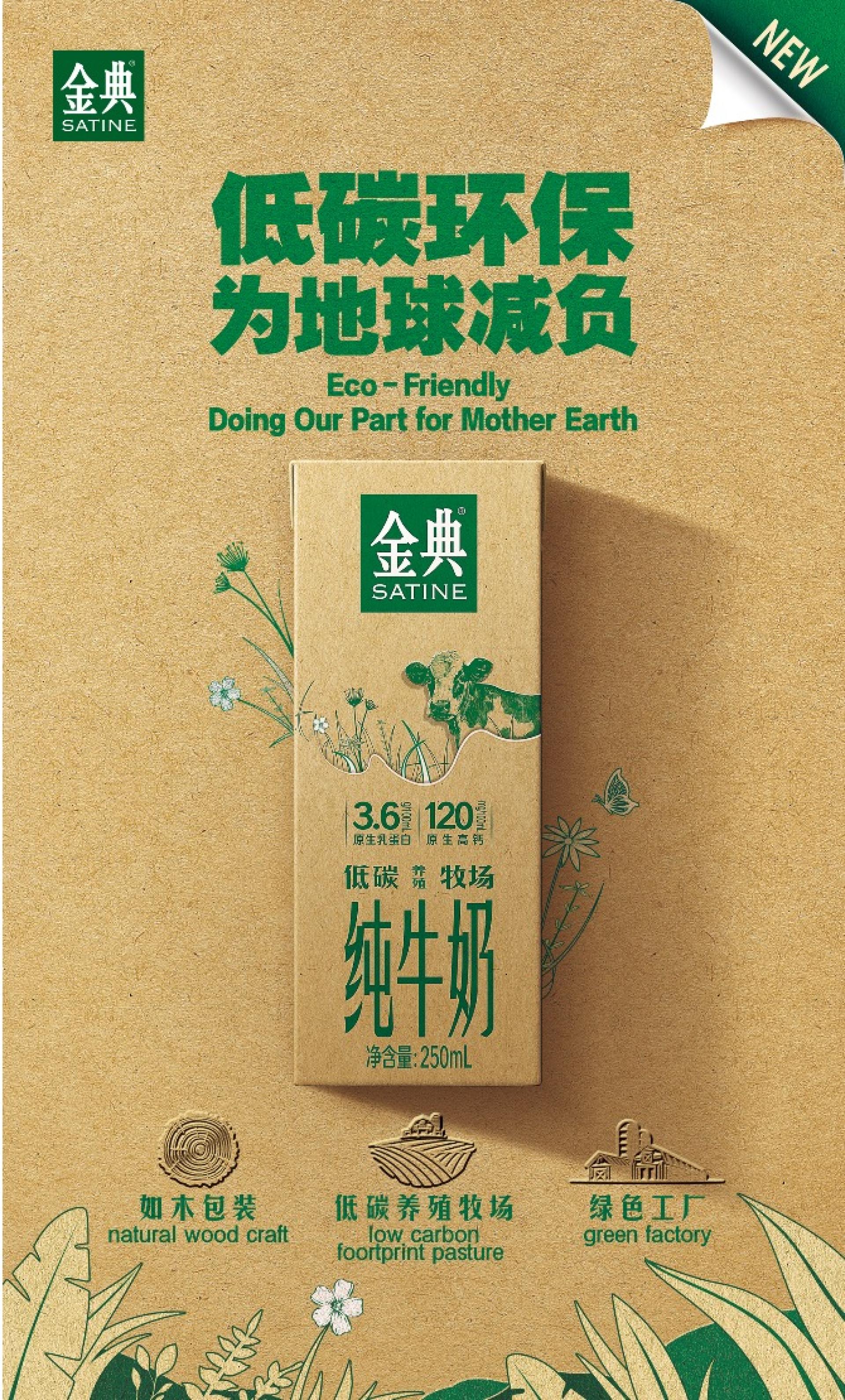 SATINE Carbon-reduced Pure Milk (Eco-friendly Pack) contains nutrients of 3.6 g/100ml of raw milk protein and 120mg/100ml of raw high-calcium. The whole chain from pasture farming to factory production achieves low-carbon environmental protection, from soil improvement to carbon-reducing diets for cows, pastures implement 6 types of 11 low-carbon and carbon-reducing technologies to achieve green control at source, fSC-certified paperboard supports sustainable forest management and uses less ink kraft paper for packaging. Third, energy-efficient production in green factories effectively reduces carbon emissions.