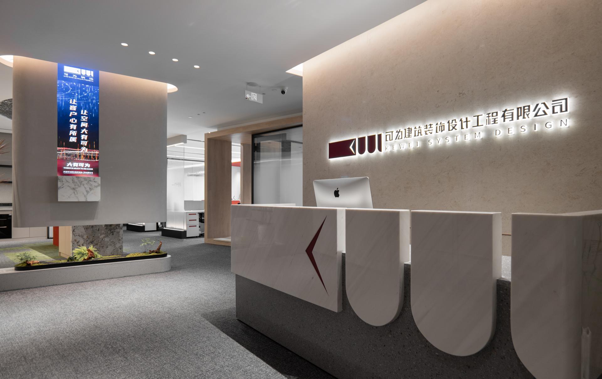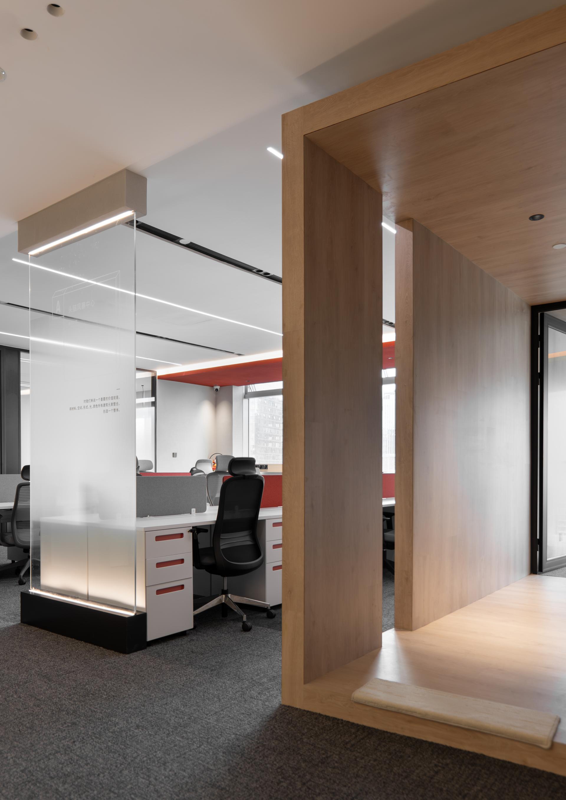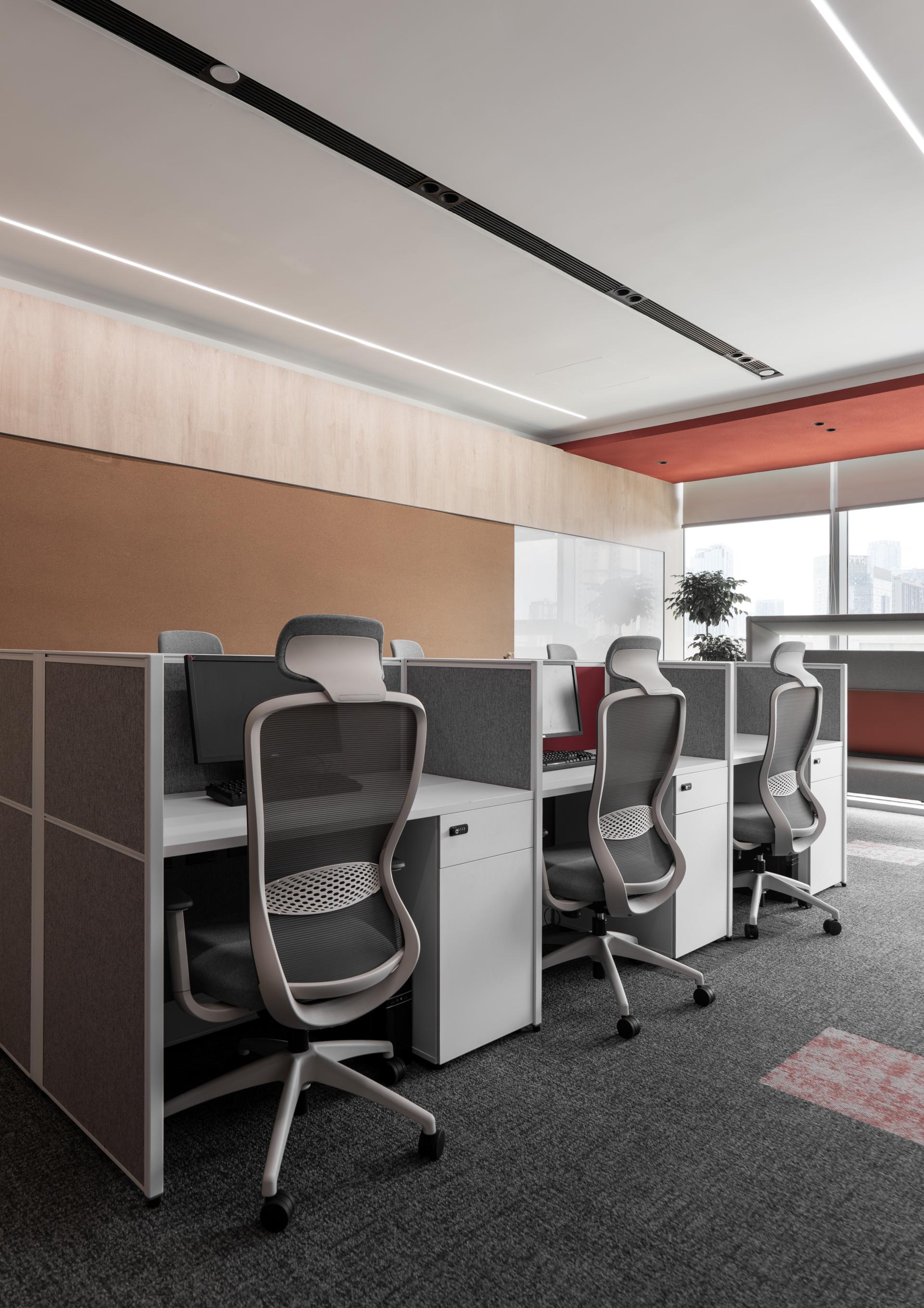 The space is dominated by a vast expanse of gray, maintaining harmony and continuity throughout. This subdued color palette enhances the space’s elegance and depth, while avoiding overly flashy or chaotic tones that could disrupt the simplicity of the design. To counterbalance the potential monotony of the gray, accents of the brand's logo color and wood elements infuse the space with a fresh, vibrant energy. Red accents, like a subtle flame, bring warmth and intensity, creating a visual focal point and adding a layer of depth to the space.