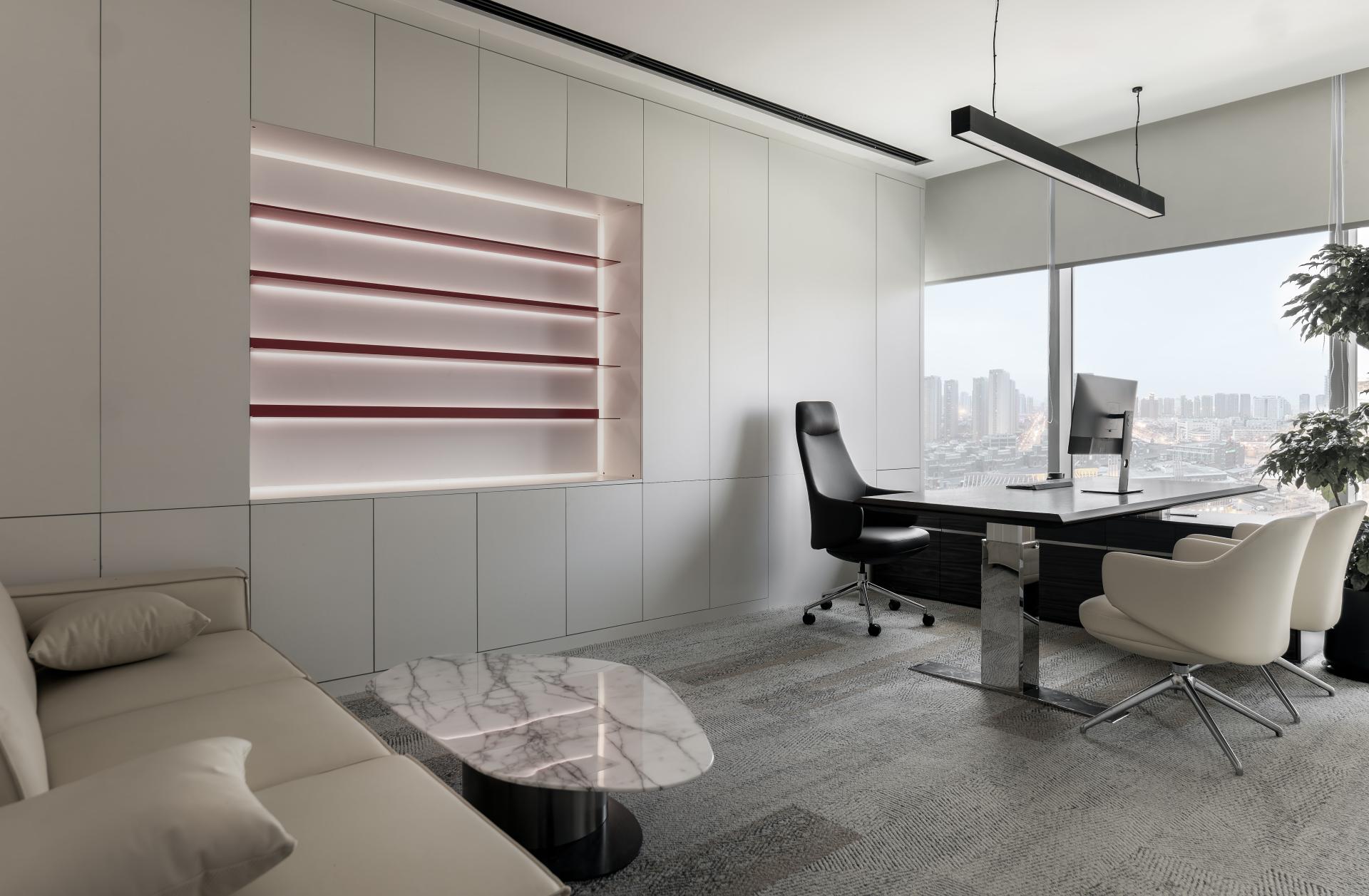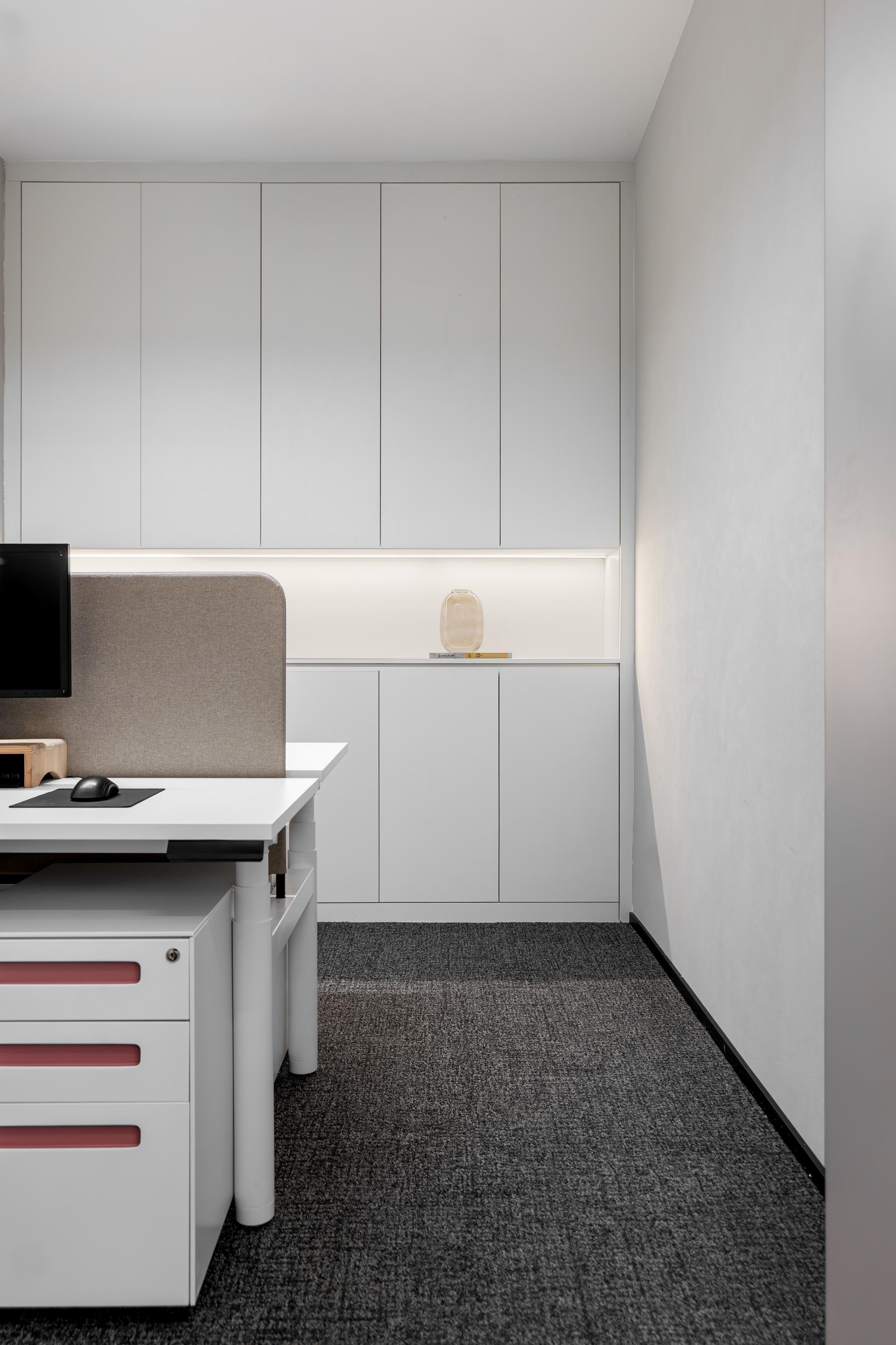 The design draws inspiration from the gentle radiance of moonlight, with soft gray tones reflecting the calm and peaceful nature of its glow. It embraces minimalism, following the principle of "less is more" to eliminate unnecessary elements, and focuses on pure materials and spatial essence. The aim is to create a unique, non-traditional, and creative work environment that encourages inspiration and innovation.