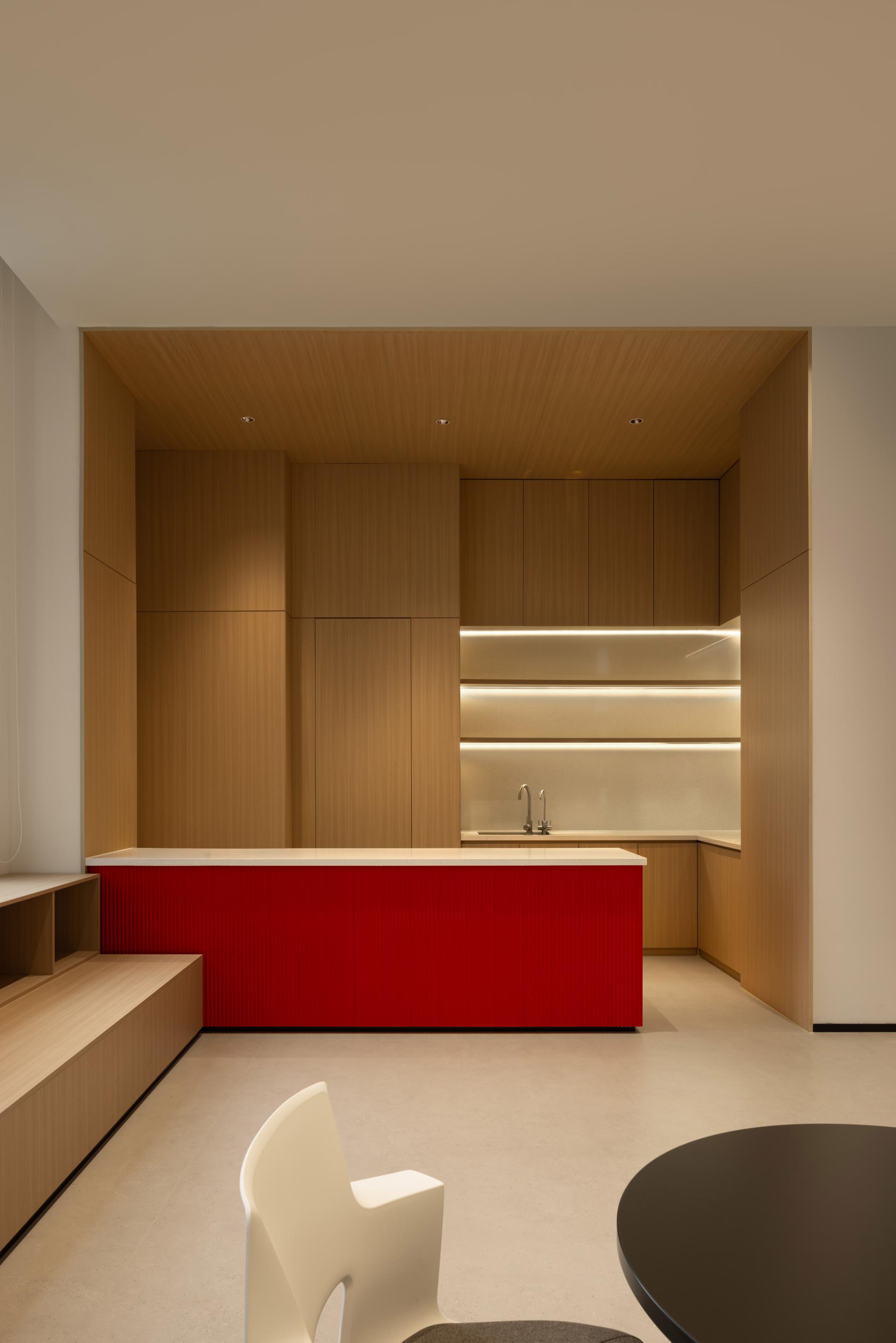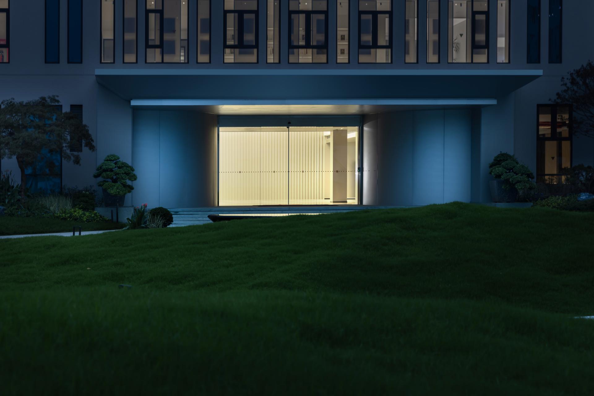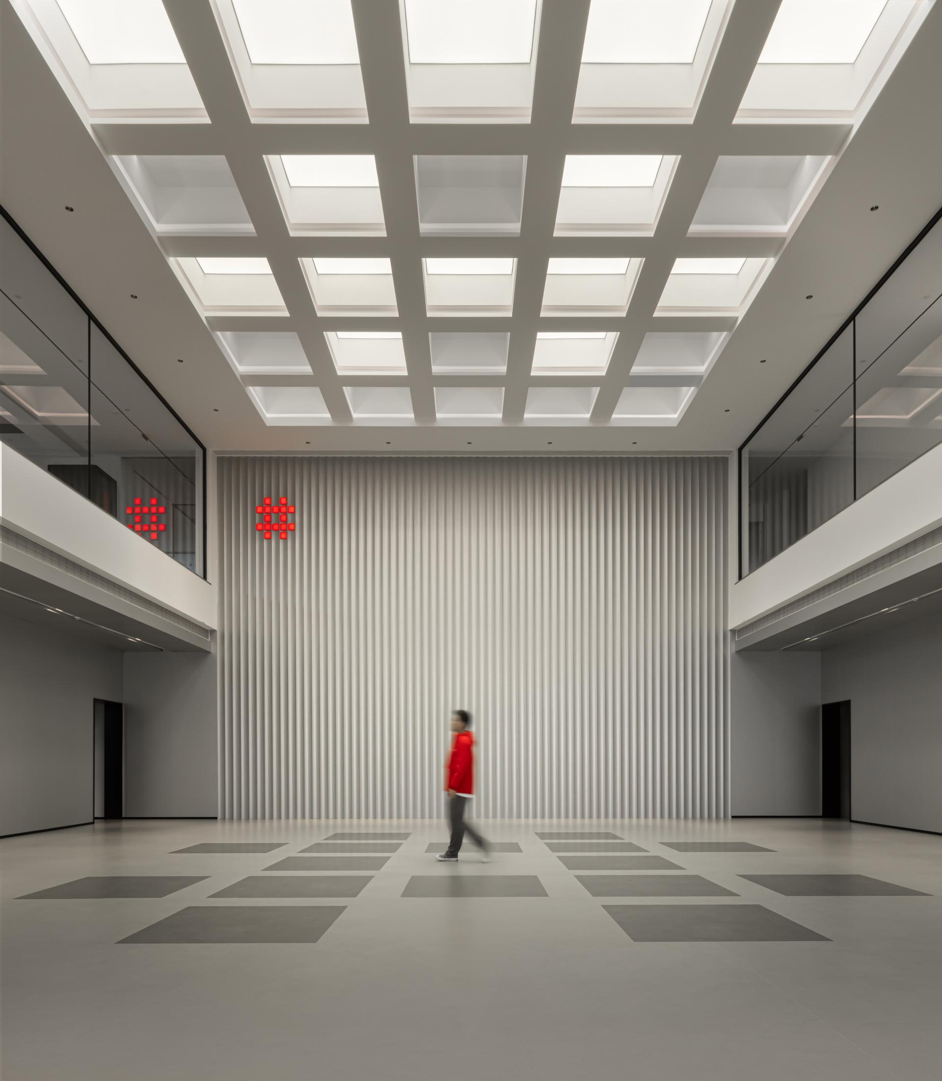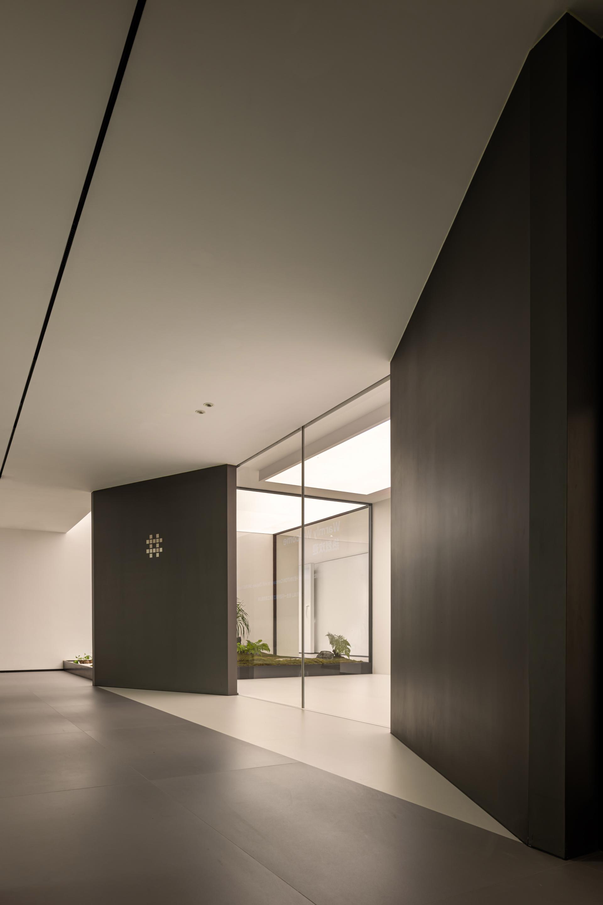 The entrance, clad in transparent glass, invites visitors into a welcoming space where the company’s iconic logo is immediately visible. The reception area adopts a spatial rhythm of "compression followed by expansion," with a low ceiling height at the entrance that transitions into a voluminous atrium. This layered spatial experience creates a sense of depth and grandeur, guiding visitors through an immersive journey from intimate to expansive spaces.